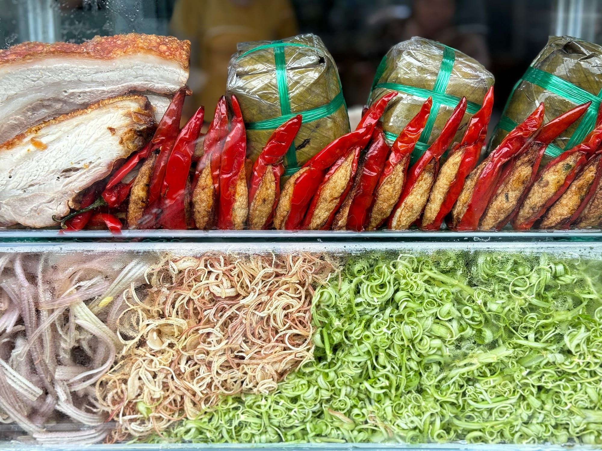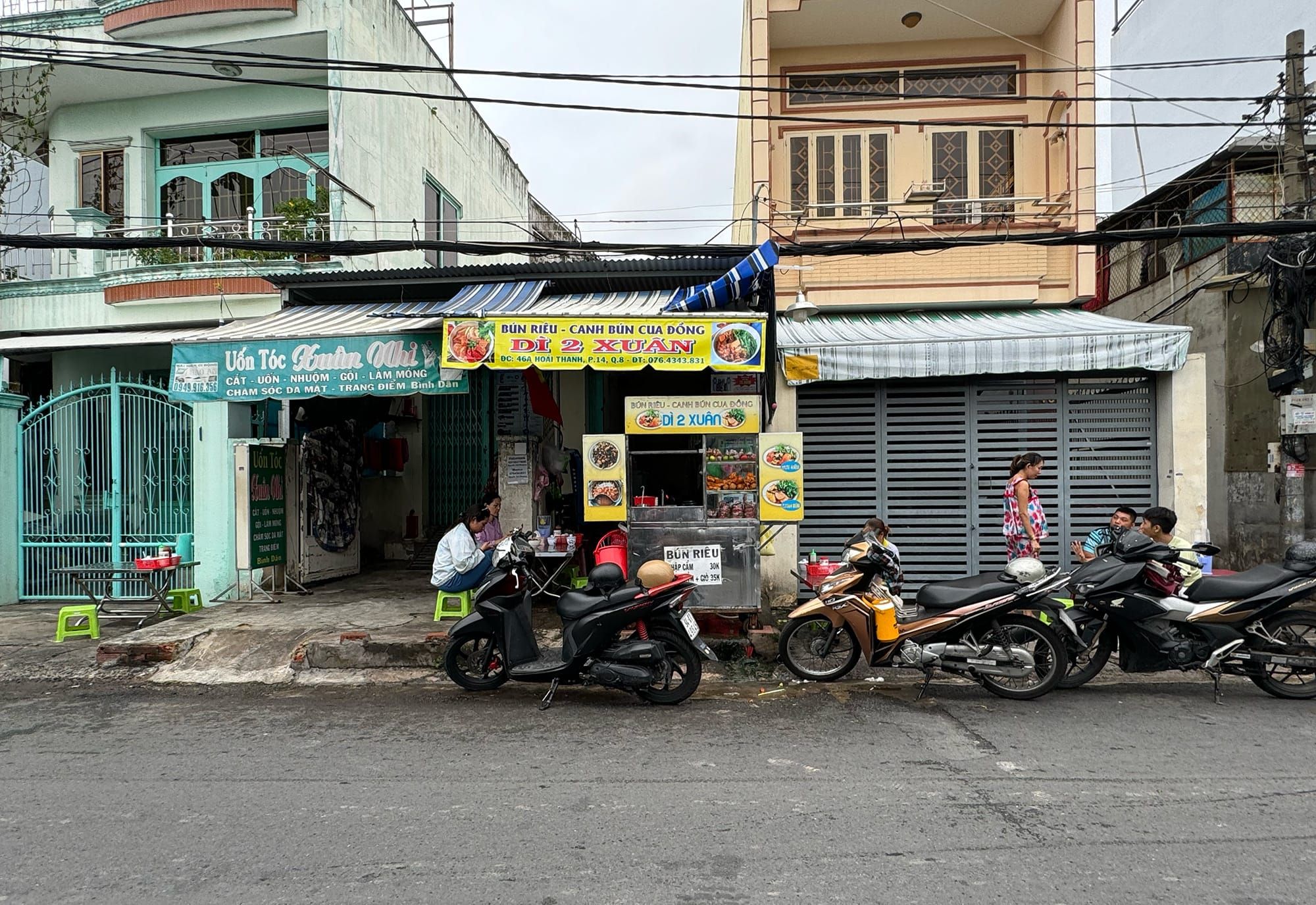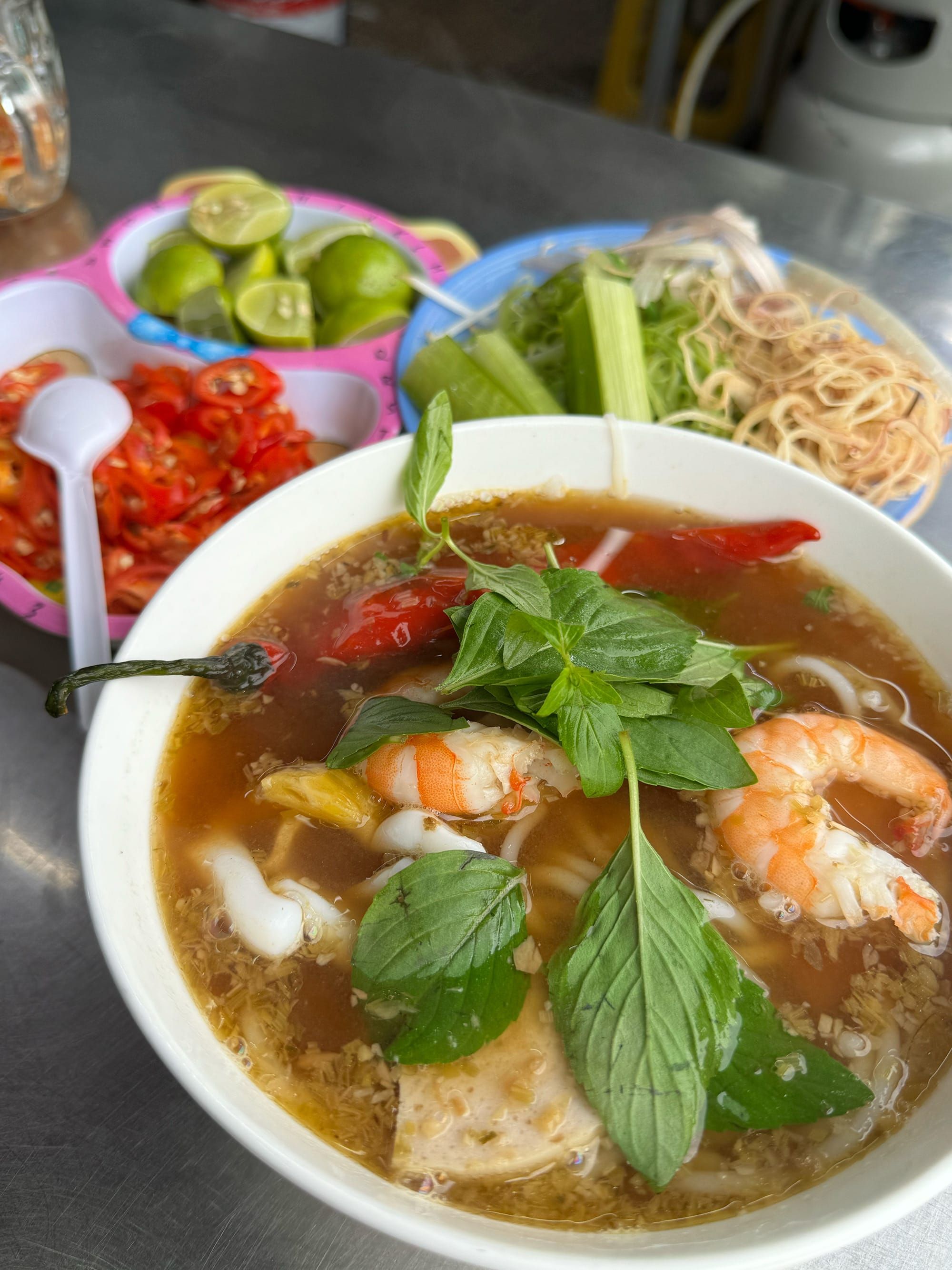 Nhưng điểm nhấn ở cù lao đầu tiên chính là ẩm thực. Một tiểu khu ẩm thực truyền thống phong phú trải dài trong những quán nhỏ đơn sơ giản dị. Mặc dù không được sang trọng hoành tráng như những gì bạn thưởng thức ở trung tâm, nhưng đừng nghi ngờ chất lượng ở đây. Nguyên liệu và hương vị đúng như thập niên 90, chính gốc miền Nam, điển hình như quán bún mắm ở số 66 đường Hoài Thanh này: