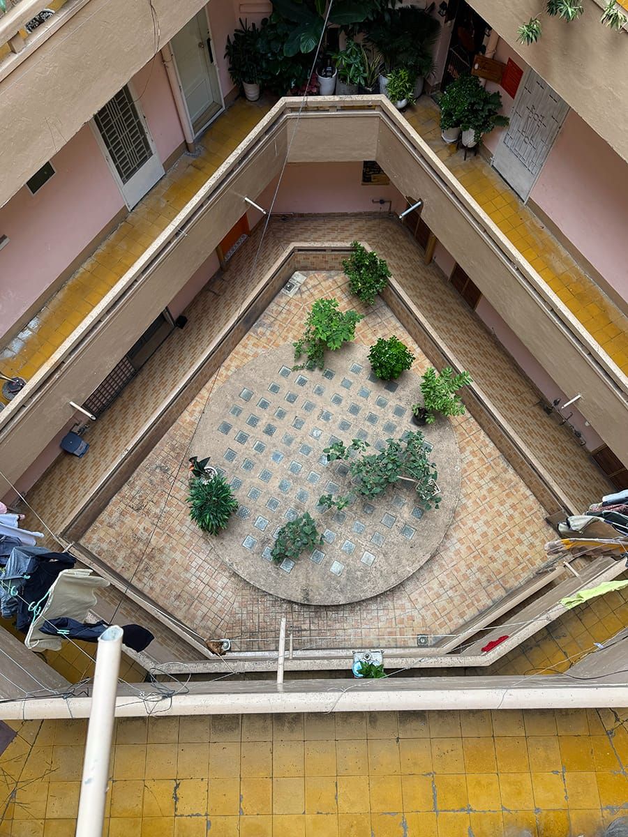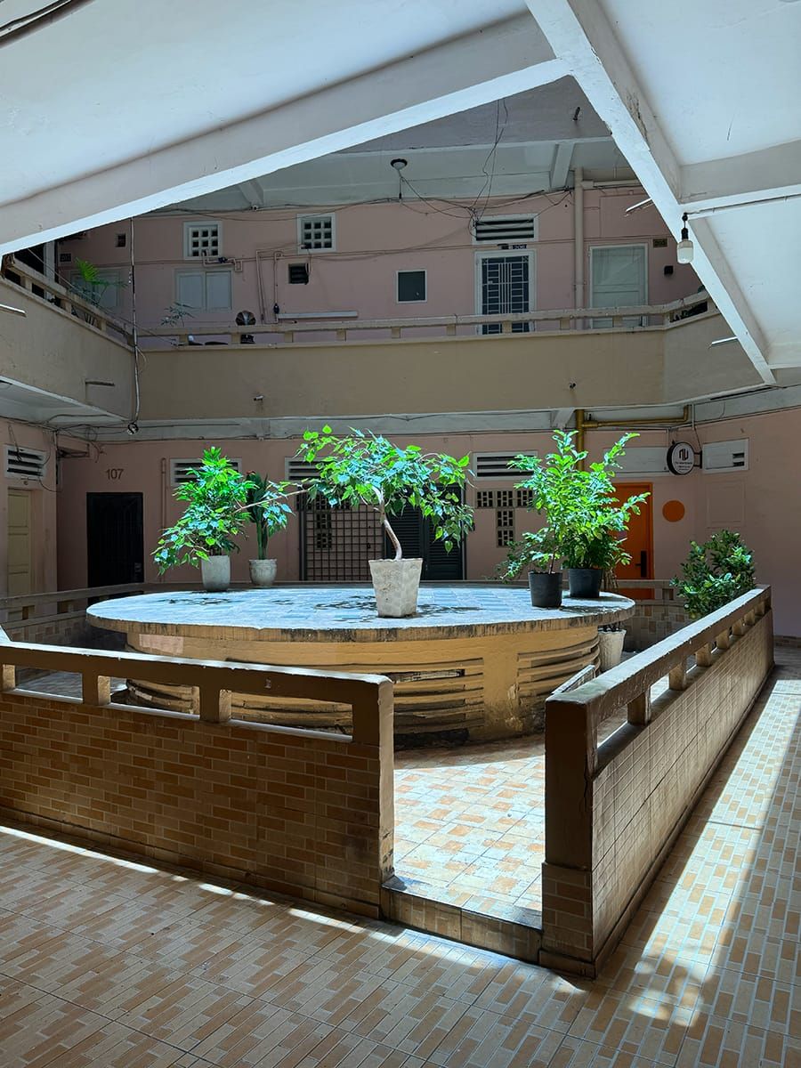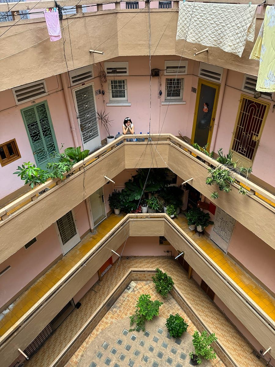 Có một sự tiếc nuối nhẹ ở chung cư này khi bên ngoài, nó hướng ra các mặt phố nhộn nhịp và giữ kín khoảng sân đẹp bí ẩn bên trong. Tuy nhiên, nơi đây không có nhiều hàng quán hay không gian để ngồi lại hàn huyên như những chung cư cũ nổi tiếng khác. Bạn chỉ bắt gặp một thư viện cộng đồng rất nhỏ, một shop áo dài, một quán bar đang được xây dựng và kem Bạch Đằng phía dưới.
