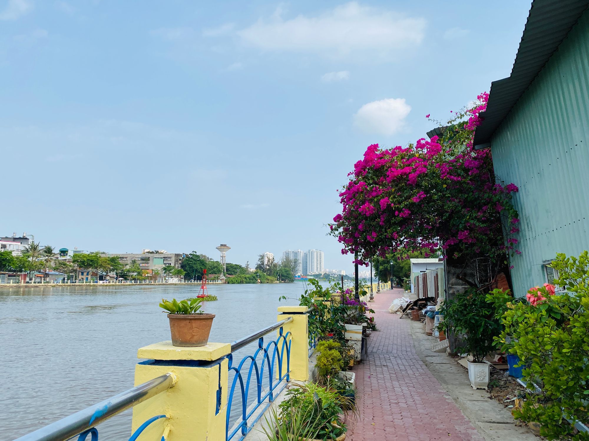 Cuộc sống hai bên bờ sông luôn đẹp, cho dù chỉ đơn giản với giàn bông giấy bình thường.