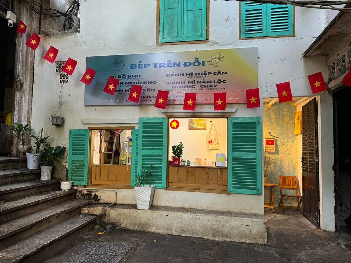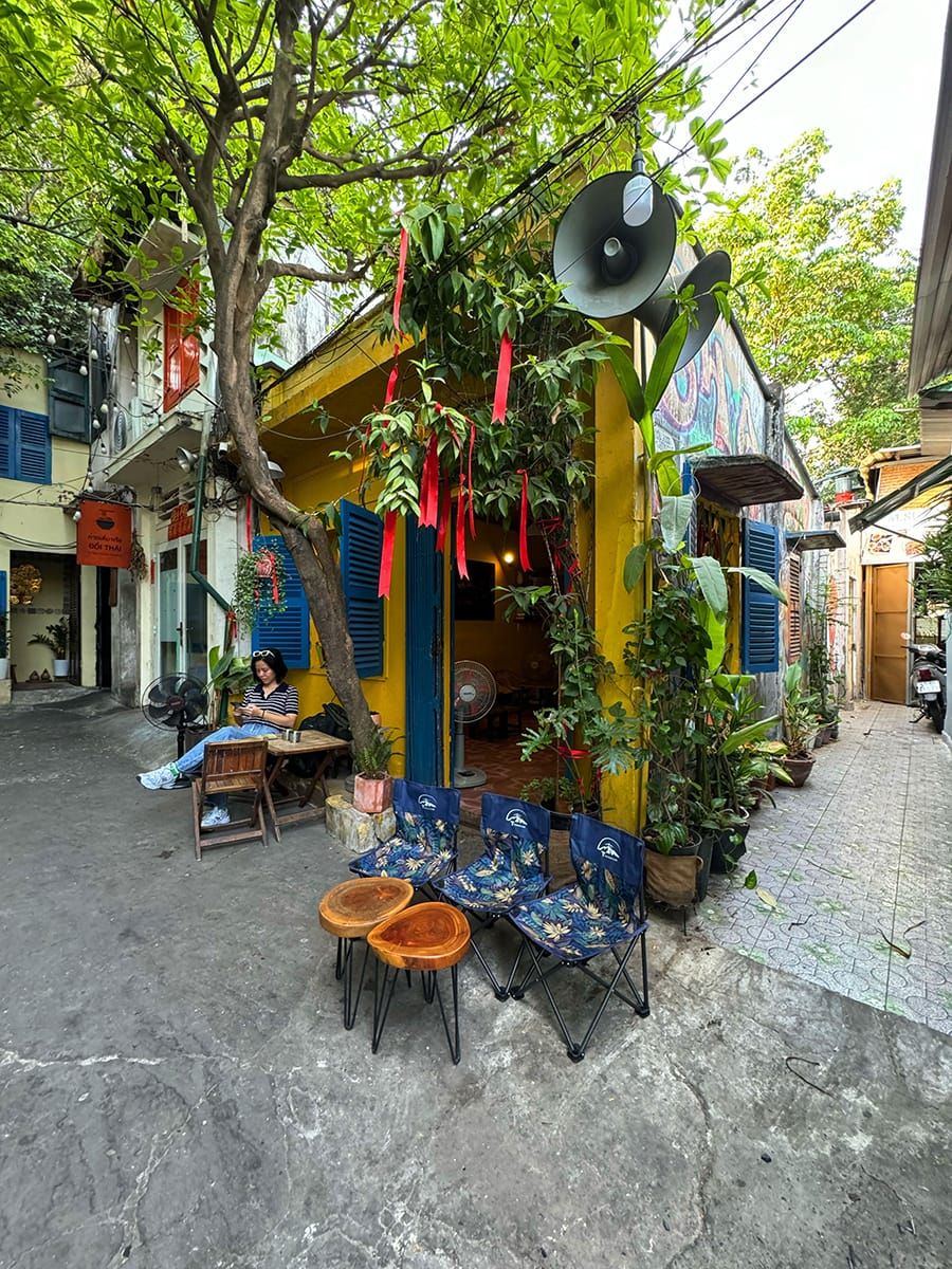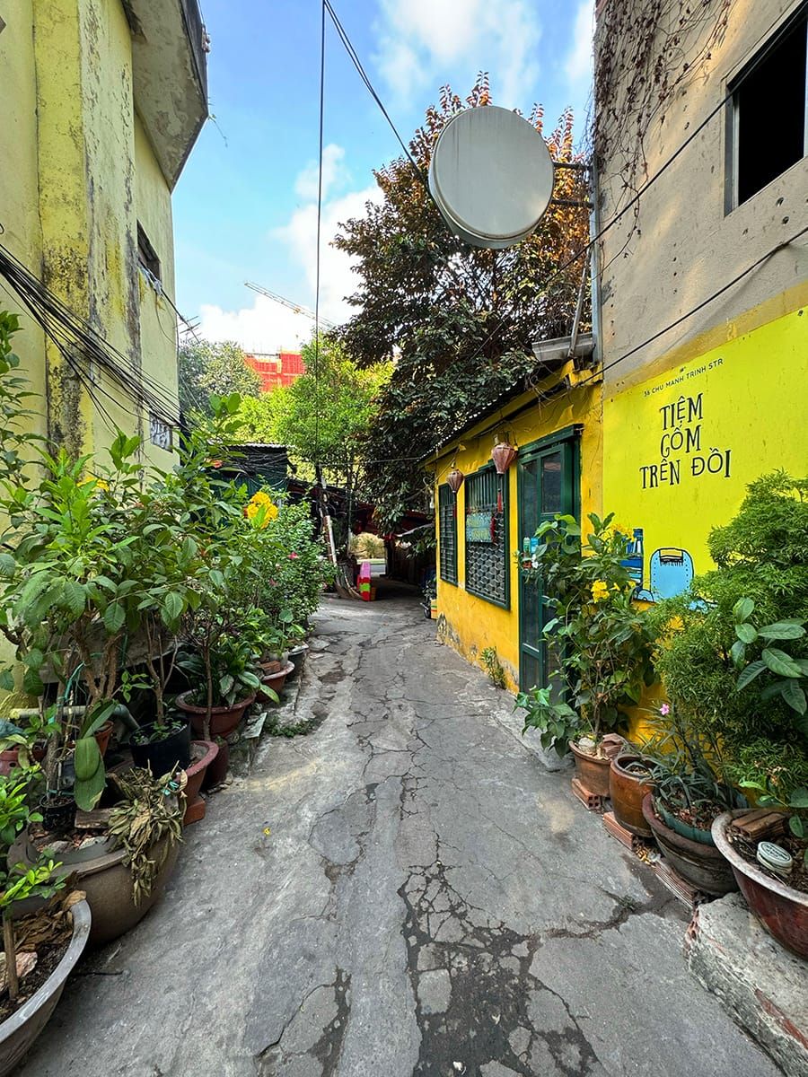 Bên ngoài hẻm số 1 có tiệm bánh cuốn Bắc từ lâu nổi tiếng với giới văn phòng quanh đây. Sâu bên trong còn một số quán ăn gia đình khác. Trong cùng là quán cà phê nhỏ xíu với chất lượng tạm ổn, nhưng không gian rực rỡ mang lại màu sắc ấm cúng và sự tương phản dễ chịu với các bức tường đổ phía ngoài.