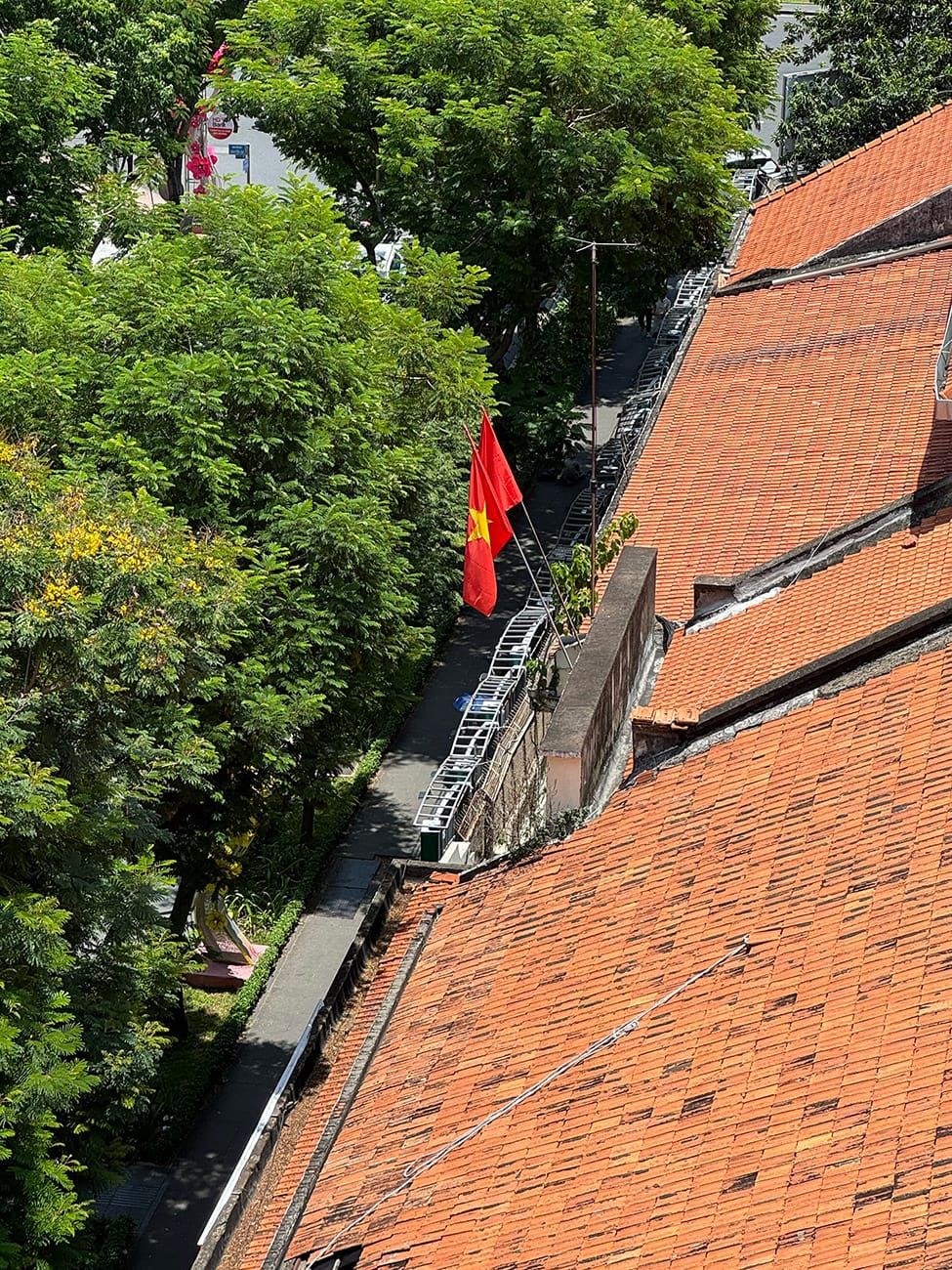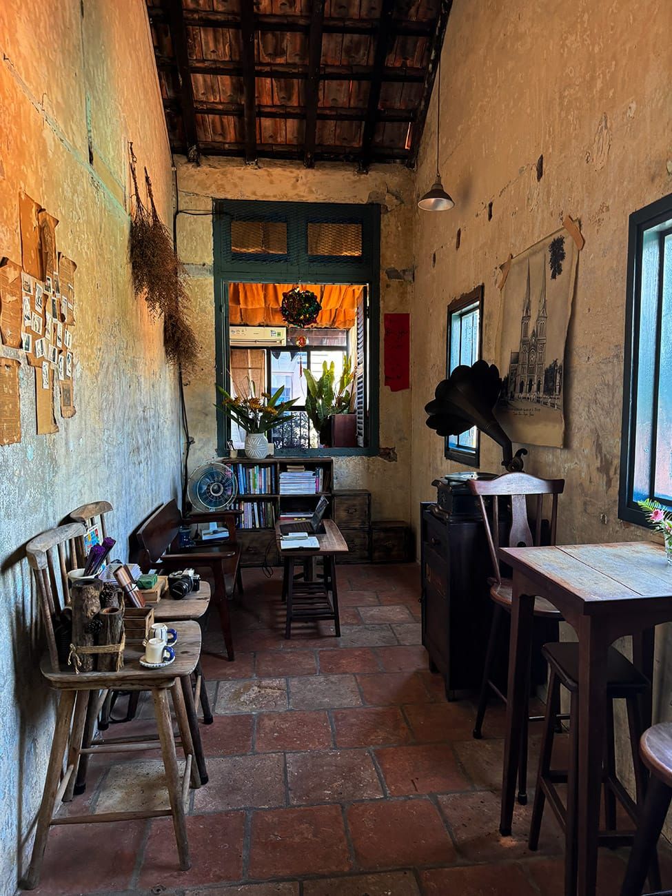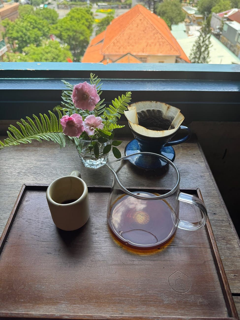 Ở góc trong cùng tầng thượng, một quán cà phê cực nhỏ với chỉ ba bàn, nơi gợi nhớ nỗi buồn gác trọ cũ kỹ Sài Gòn. Tuy nhiên, chỉ cách bức tường mỏng, bên ngoài gió và nắng sống động hơn rất nhiều. Từ đây, bạn có thể nhìn thấy hàng trăm năm trôi qua phía bên ngoài. Kia là nhà thờ, kia là bưu điện, hàng cây, ngói đỏ, dãy cửa sổ cổ kính của trường trung học La SanTabert, một ban công cổ điển đằng xa…