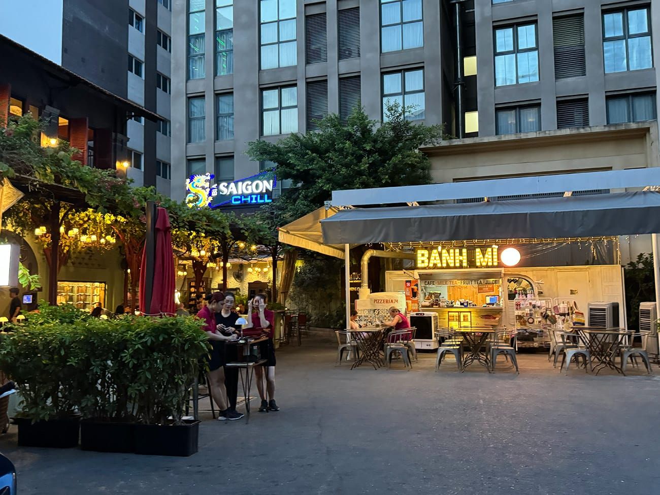 Bên phải, nhà máy sản xuất đã bị phá bỏ hoàn toàn. Khoảng sân lớn phía trước nay lấp lánh ánh đèn và các quán ăn nhỏ bao bọc.