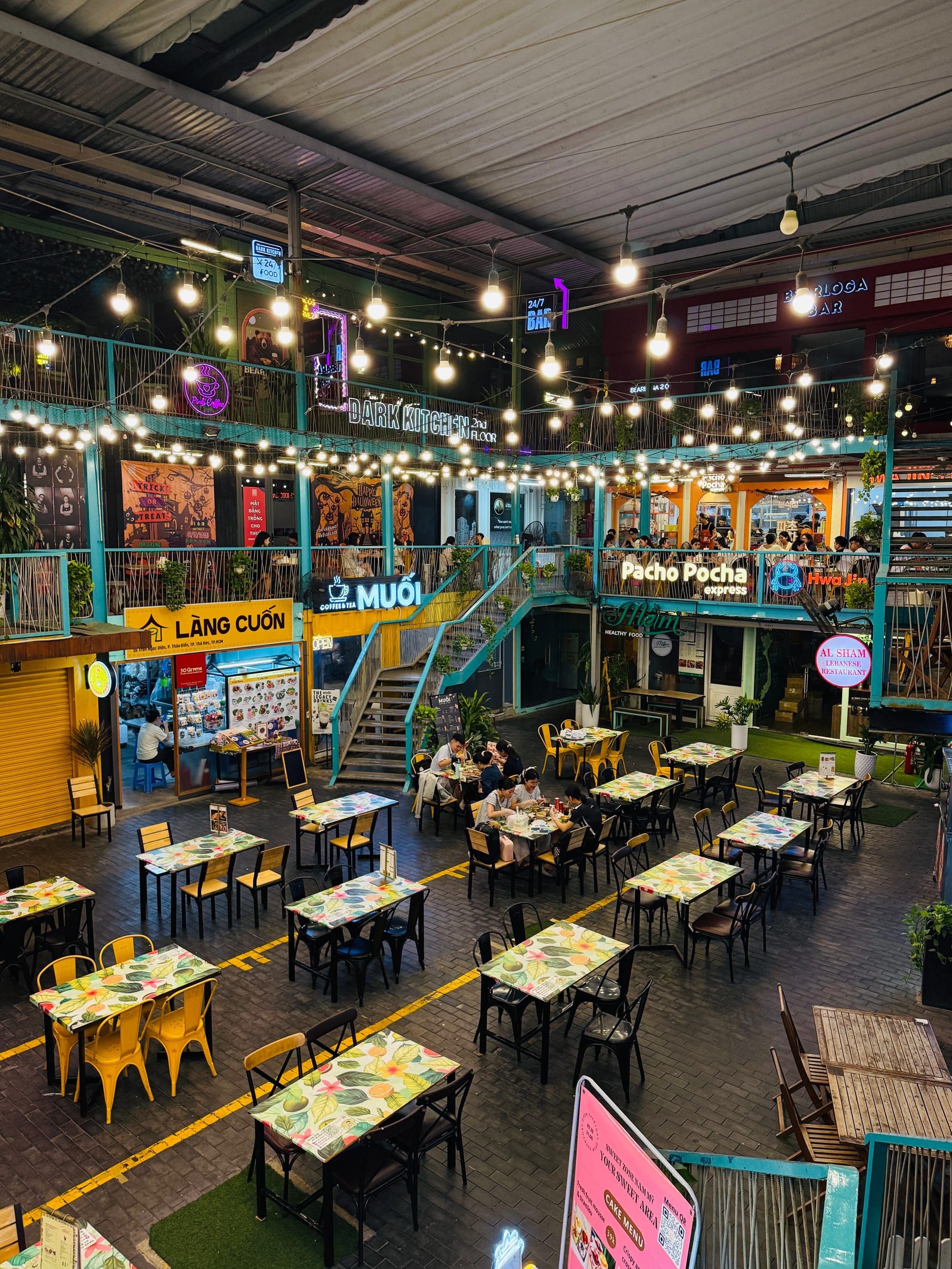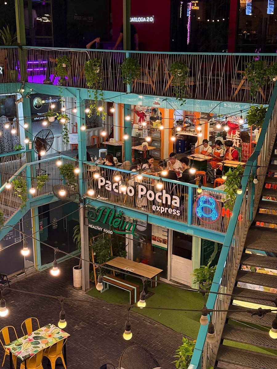Những gam màu rực rỡ chạy dài khắp nơi, dãy đèn vàng vui tươi giăng cao, bảng hiệu neon nhảy múa... nếu đứng từ dãy hành lang này nhìn xuống, khung cảnh chẳng khác gì khi bạn lạc vào một quảng trường Nam Mỹ rộn ràng.