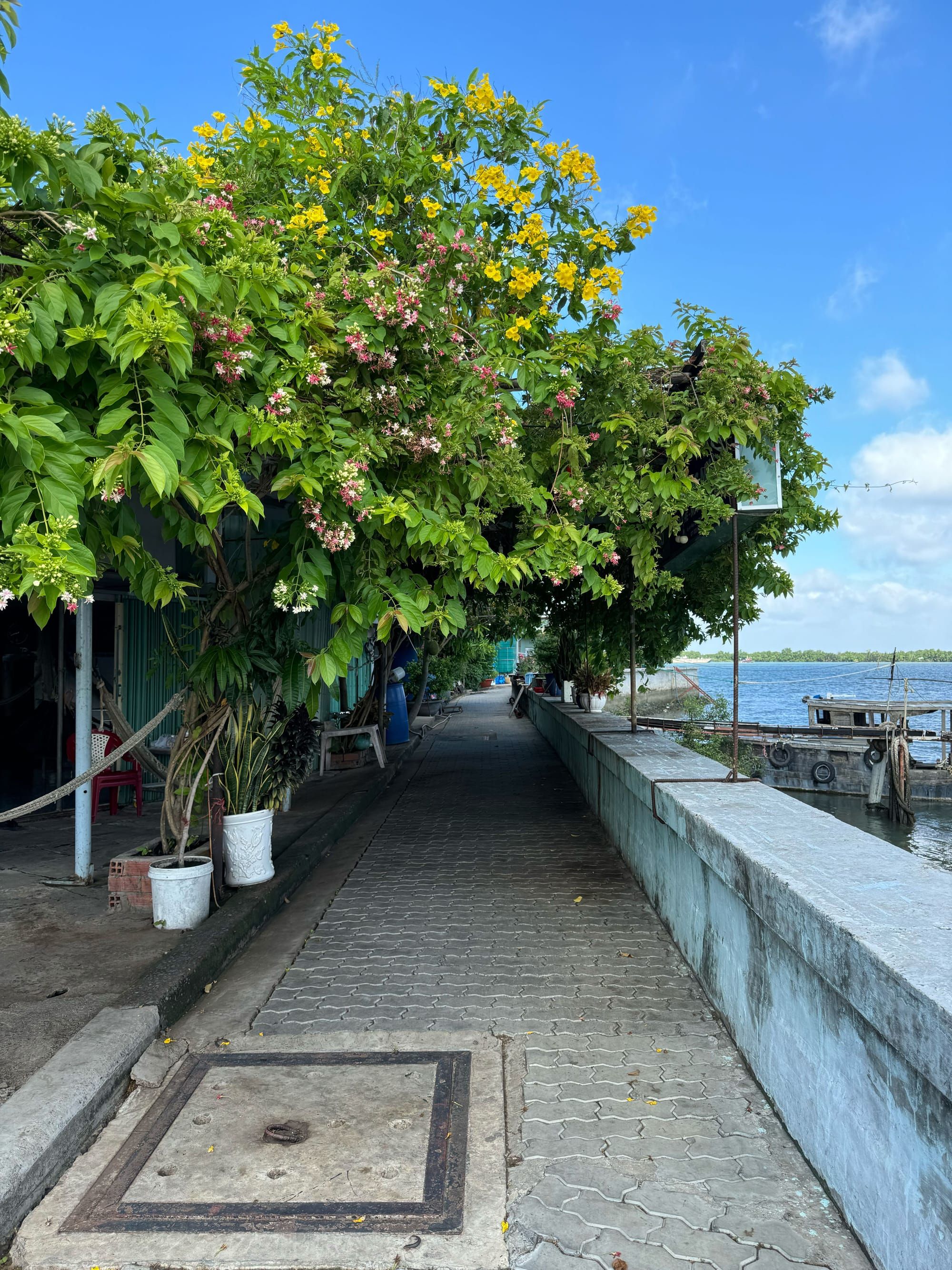 Sau đó, một lối nhỏ nữa để vào bến phà. Qua bên kia bờ sẽ là An Thới Đông. Đừng vội đi ngay, hãy thử vào các hẻm nhỏ ngay dưới bến. Cuộc sống hai bên bờ nhộn nhịp và chiếc view đẹp trên bờ đê sẽ giữ chân bạn khá lâu.