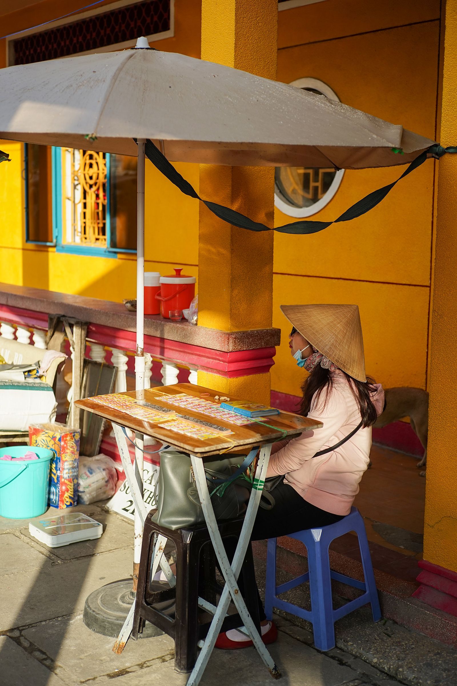 Tiệm vé số bên ngoài đình phục du khách. Các bạn thấy nón lá của Việt Nam đơn giản và rất đẹp phải không. Ảnh Nam Quach