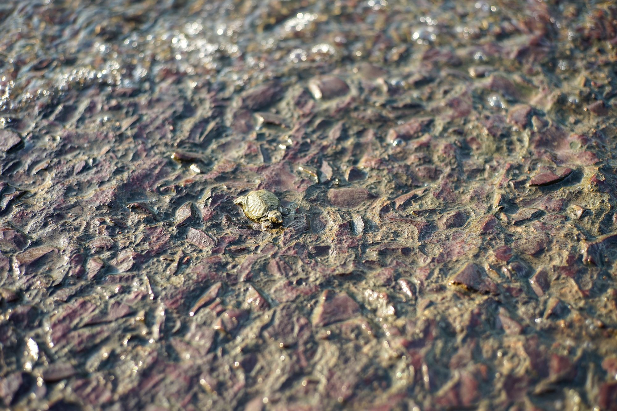 Chú rùa bé nhỏ đang bò ra mép sông, chú vừa có sự thay đổi chỗ ở từ thau nhựa ra sông lớn. Ảnh Nam Quach
