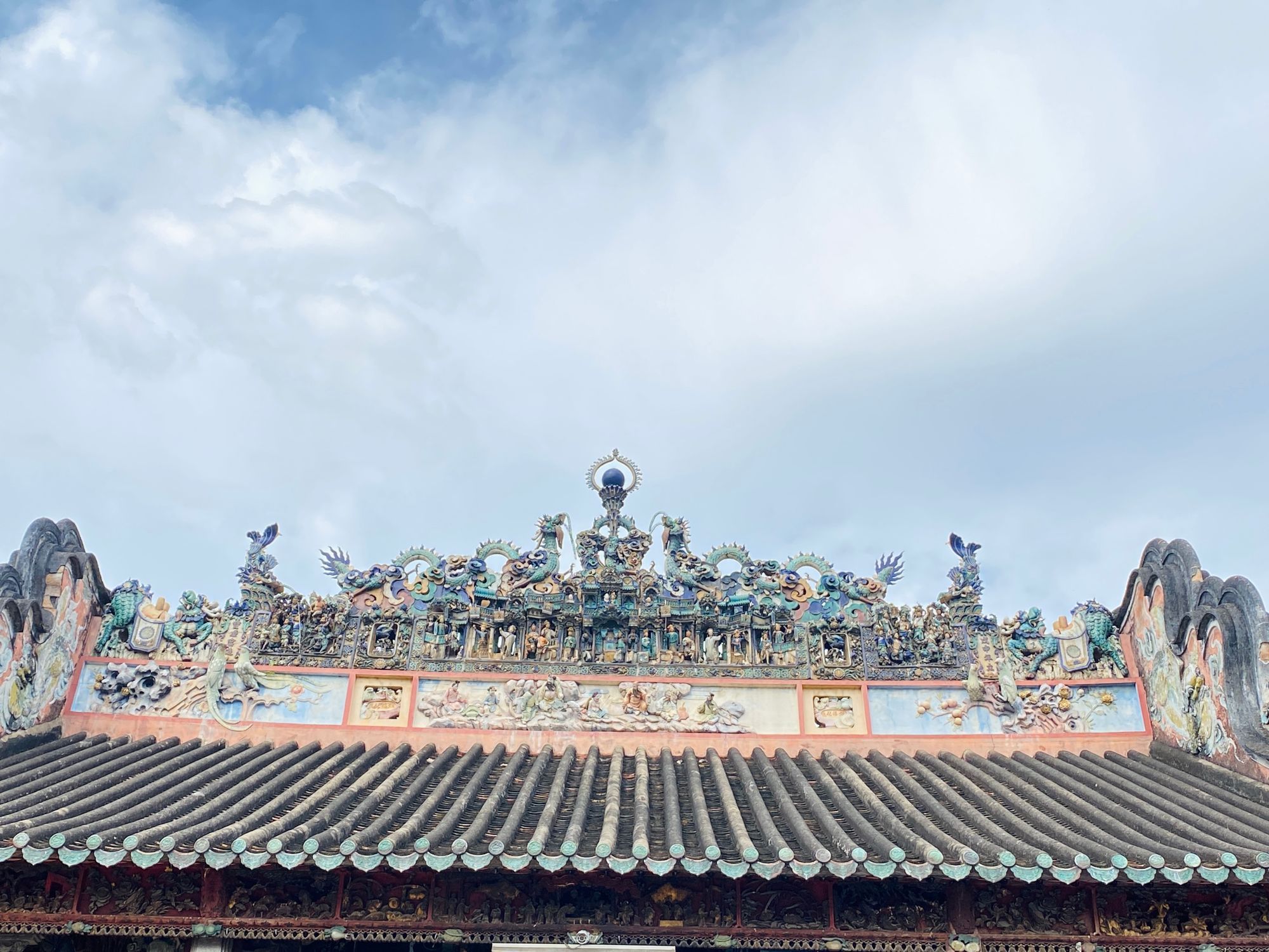 Phần nóc miếu được trang trí bởi những hoa văn, hình nhân làm từ gốm, miêu tả lại các câu chuyện trong văn hóa dân gian miền Nam Trung Quốc.