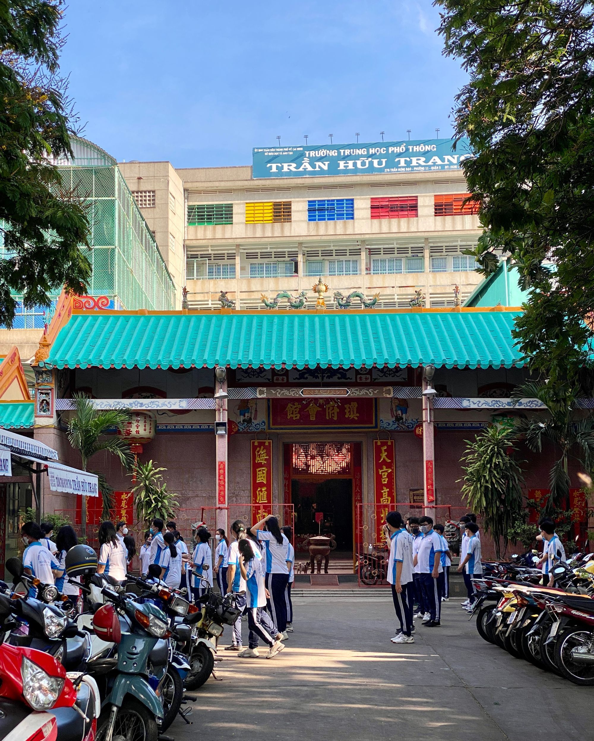 Hội quán Quỳnh Phủ đã hiến một phần đất cho việc xây dựng ngôi trường Trần Hữu Trang. Chính vì thế bạn sẽ thấy khoảng sân phía trước hội quán còn được xem như sân trường. Trong hình là giờ thể dục của các em học sinh.