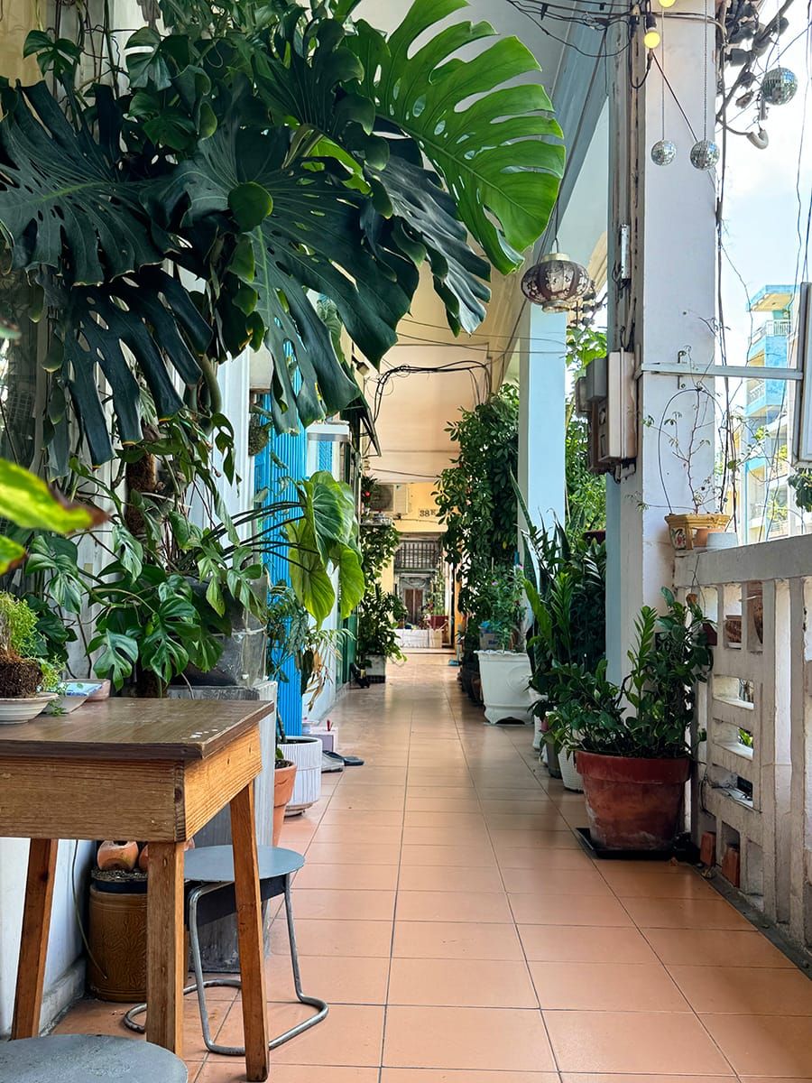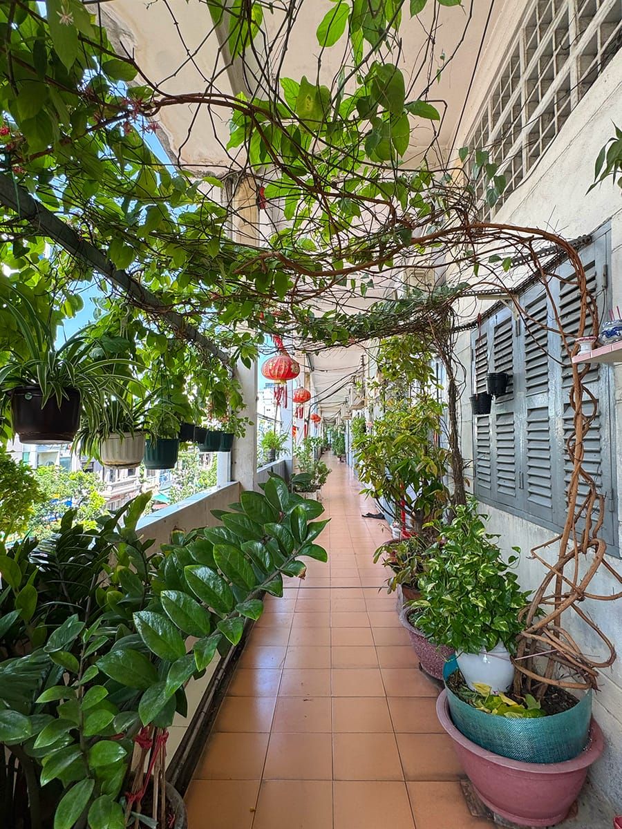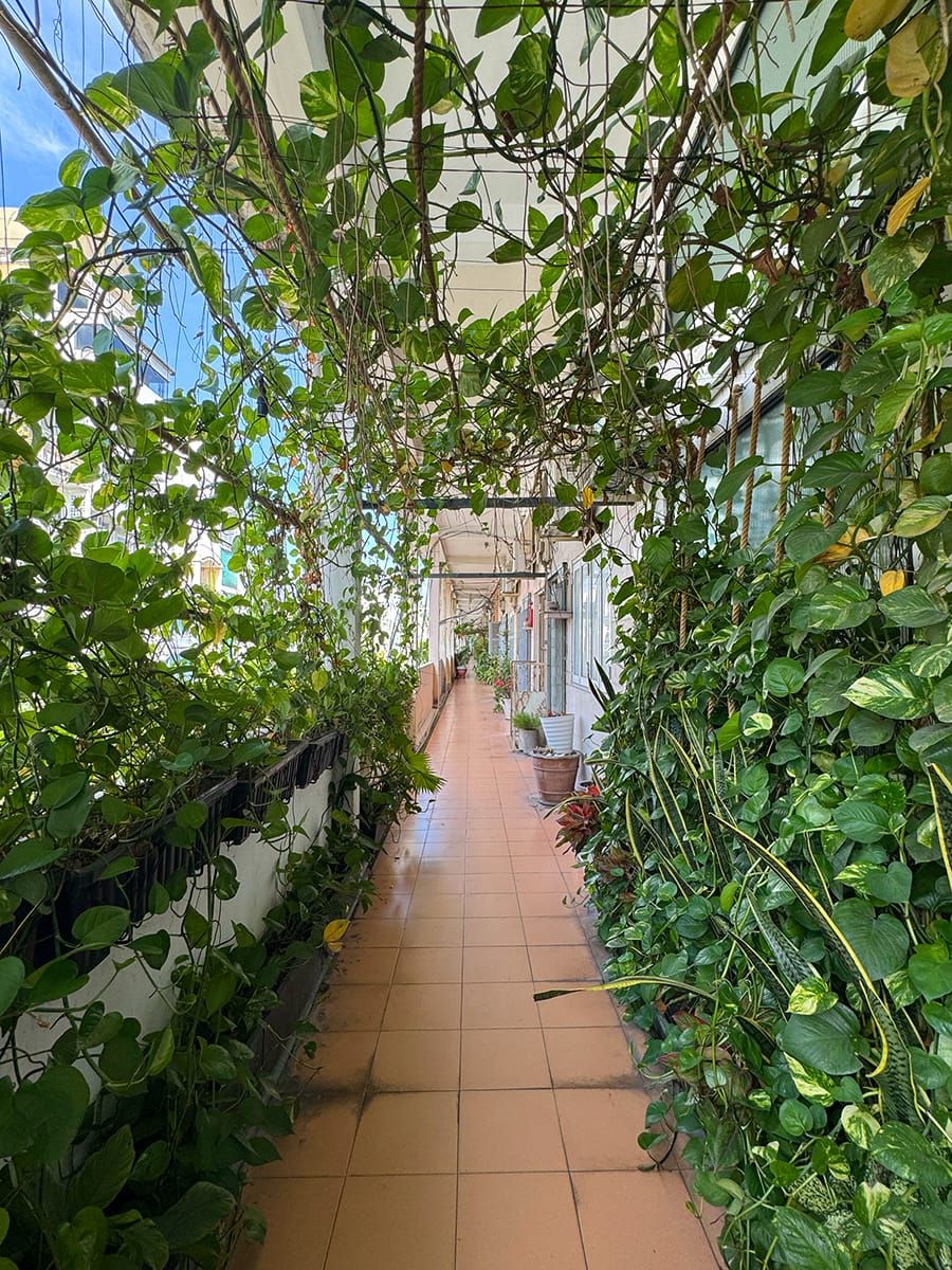 Chỉ cần qua hết các bậc thang của tầng một, bạn thật sự bất ngờ khi các dãy hành lang ở đây không giống chung cư chút nào. Những lối đi nhỏ phủ đầy dây leo, cây xanh và ngay cả một chú chó có gương mặt trầm tư.