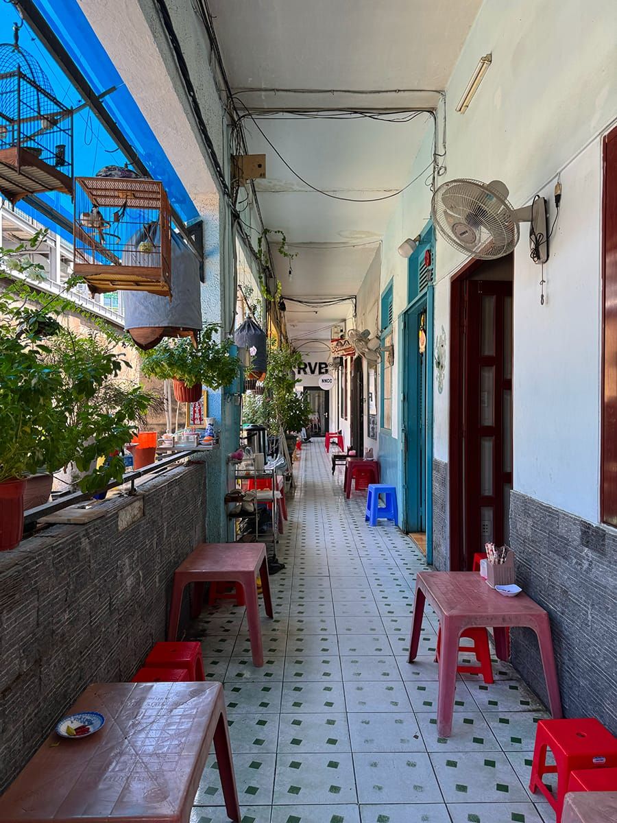Hành lang của khu 54 Ký Con mở rộng ở cả hai tầng, khá dài để bạn tha hồ lang thang. Số lượng hàng quán cũng vừa đủ, đúng kiểu một khu phố yên bình. Chỉ có một khác biệt tuyệt vời: chúng ở trên tầng cao đầy gió.