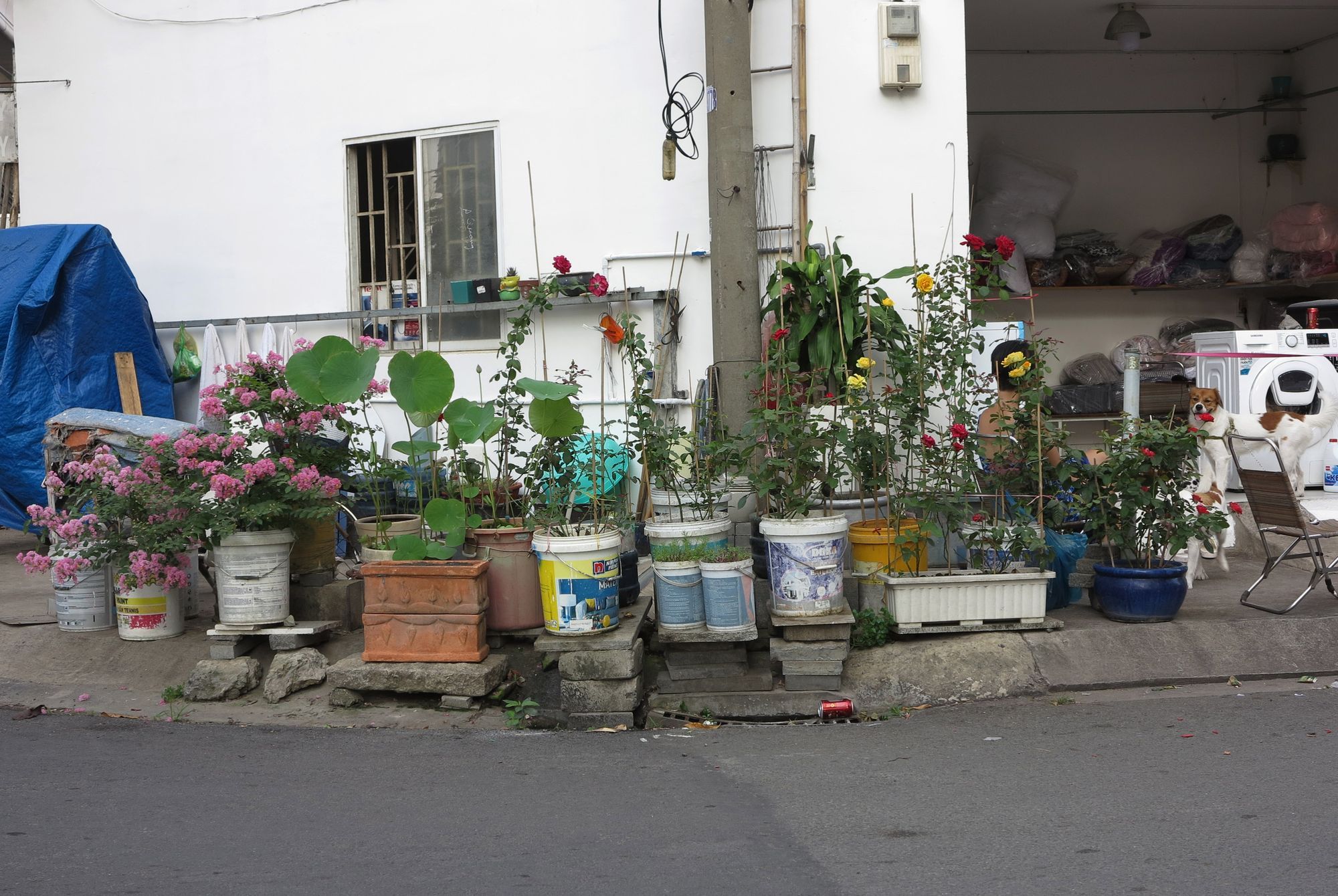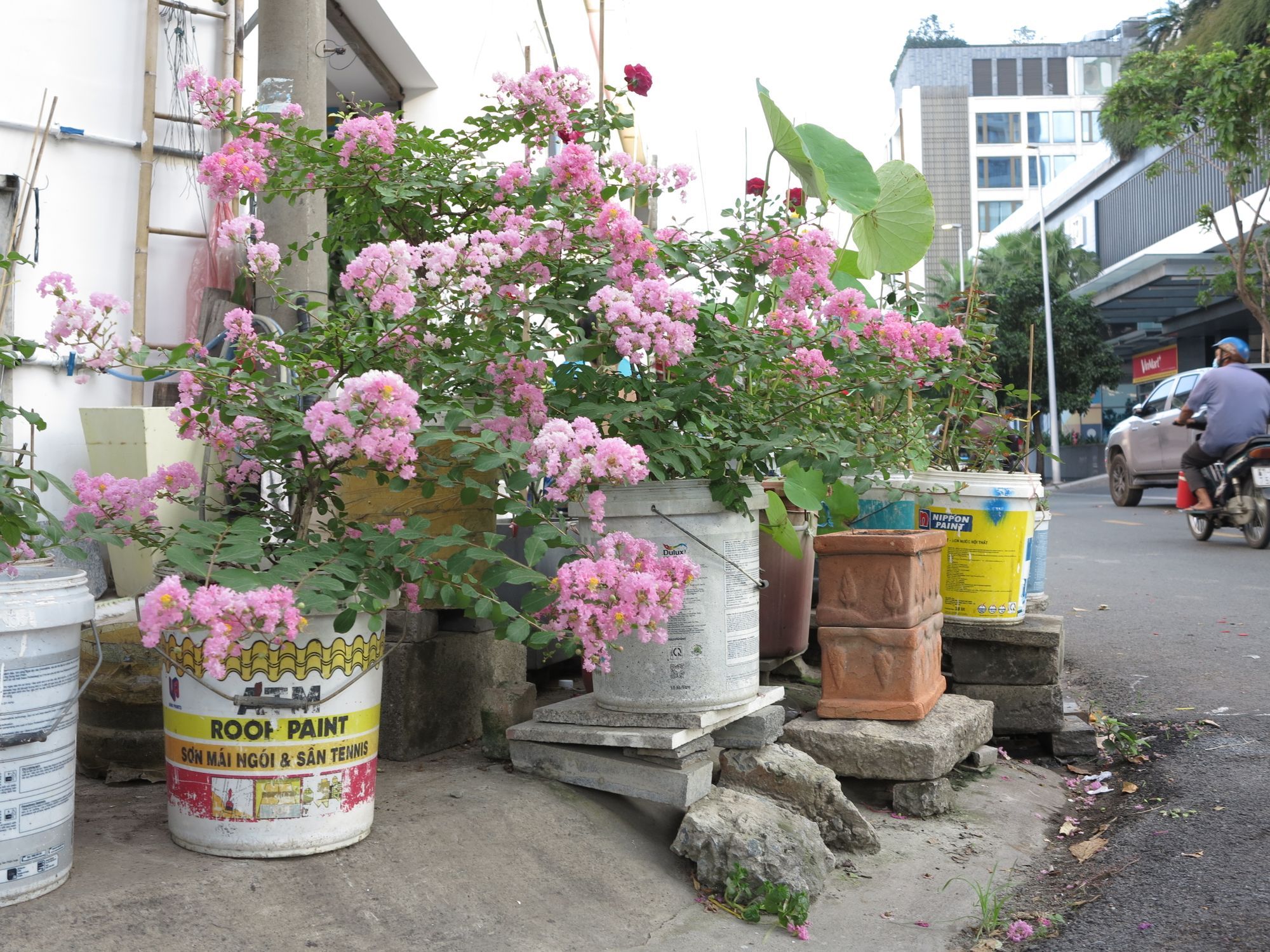 Hay góc đường đối diện một công trình xây dựng này. Tất cả thùng sơn cũ đều được tận dụng lại để trồng hoa.
