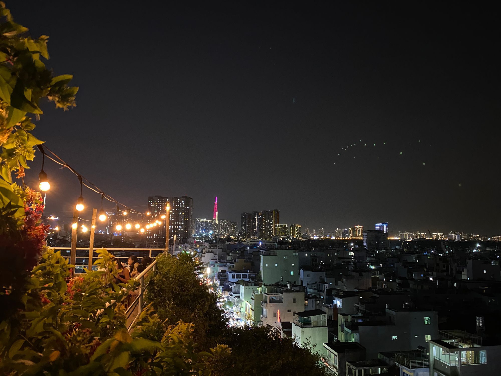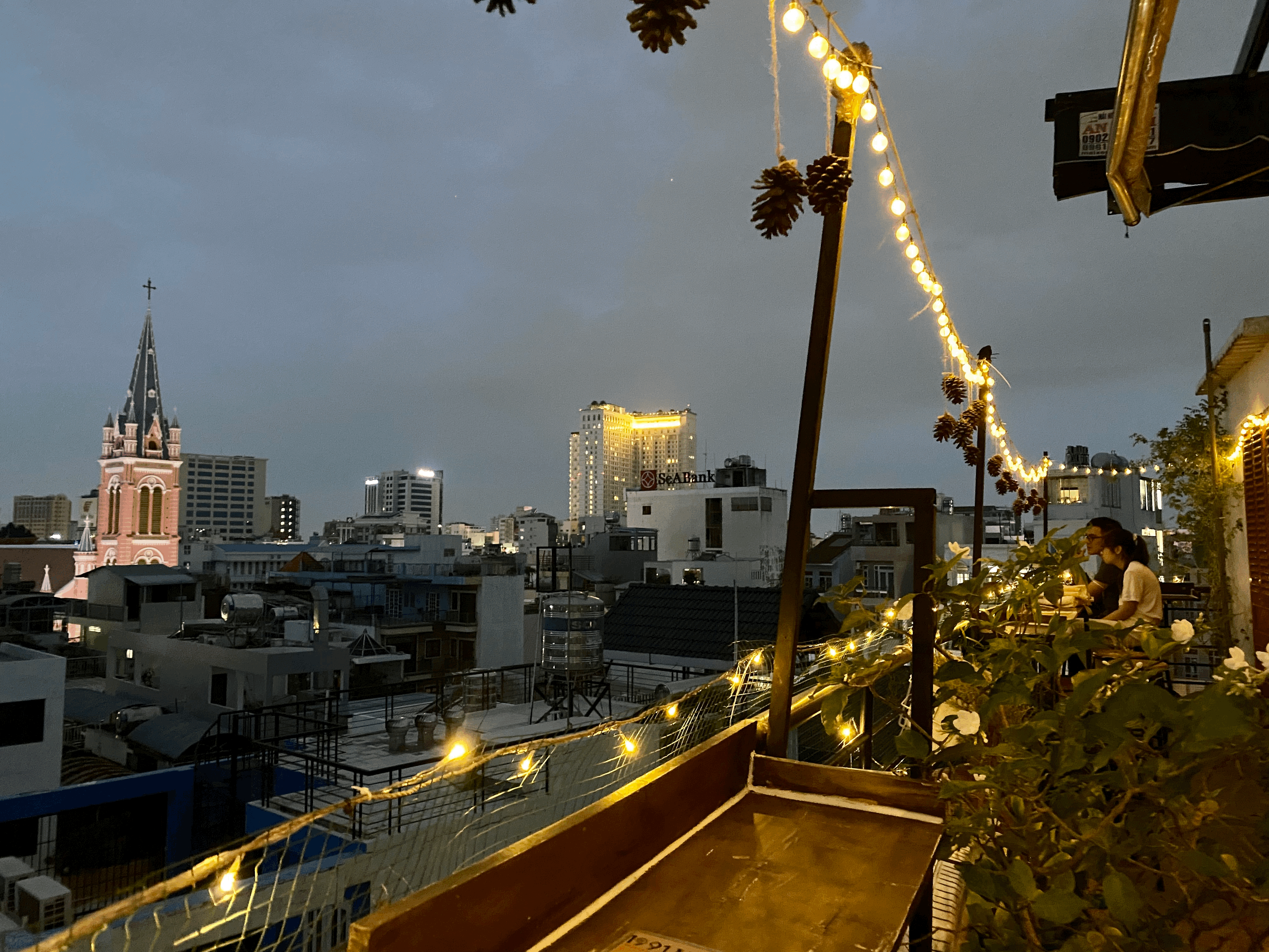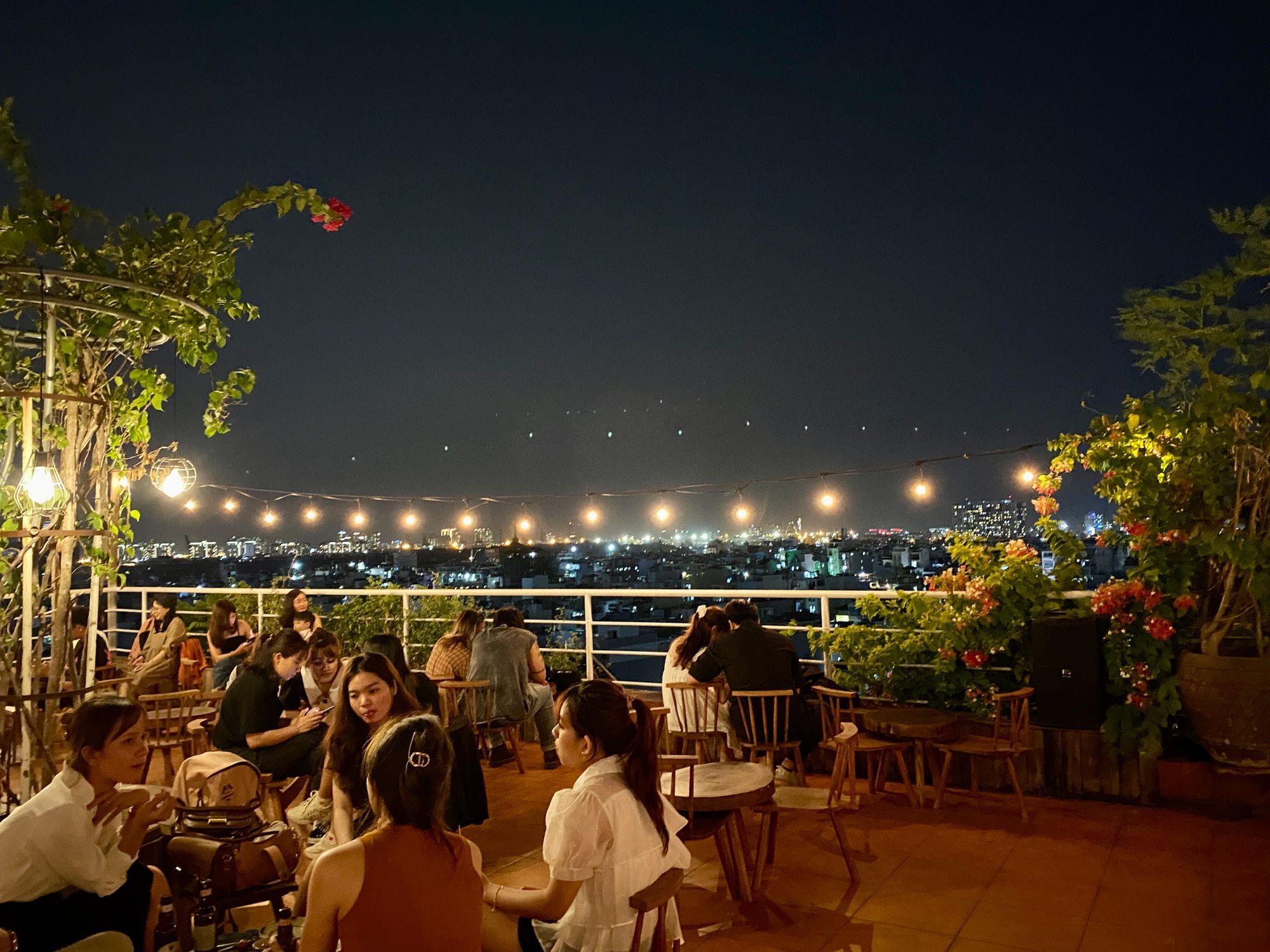 Đôi khi bầu không khí những quán rooftop cũng góp phần mang đến cảm giác khác lạ. Bầu trời đầy gió mát lạnh và những dây đèn vàng ấm áp vây quanh. | Thương Rooftop