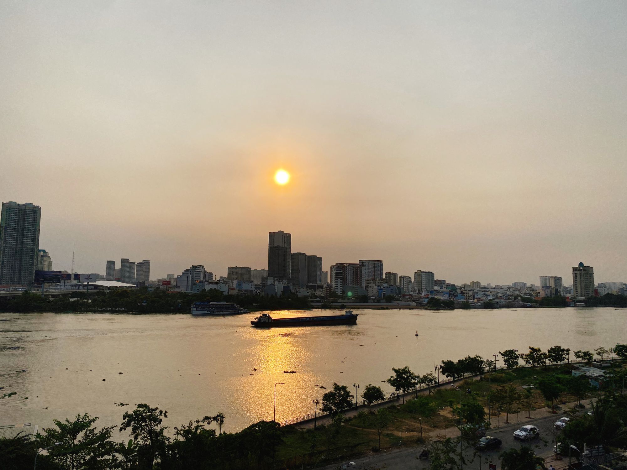 Hoàng hôn thành phố dường như thơ mộng hơn hẳn. Ánh nắng vàng nhẹ êm dịu toả lan xuống mặt sông thành những dải vàng lấp lánh huyền ảo - mang đến khoảnh khắc đẹp nhất trong ngày. Dù vậy ngay cạnh con sông, dòng xe di chuyển vội vàng lại tạo nên trạng thái đối lập thú vị...
