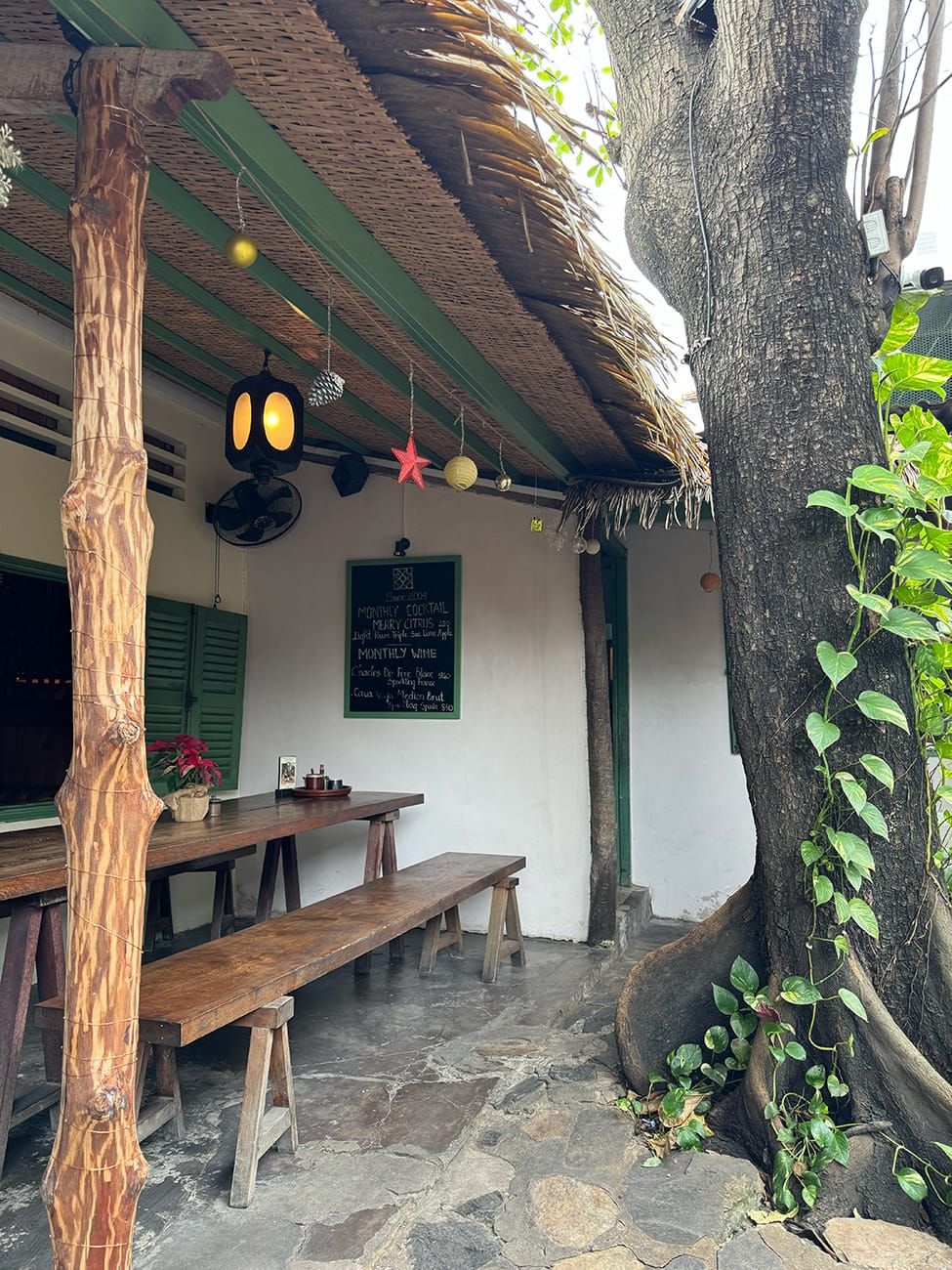 Ngôi nhà này mang nét Nam Bộ thuần túy với lối vào xinh xắn, các hàng ghế dài đơn giản, khoảng sân thoáng dưới bóng hai cây bàng khổng lồ, một miền Tây gọn gàng lịch sự giữa trung tâm Thảo Điền.