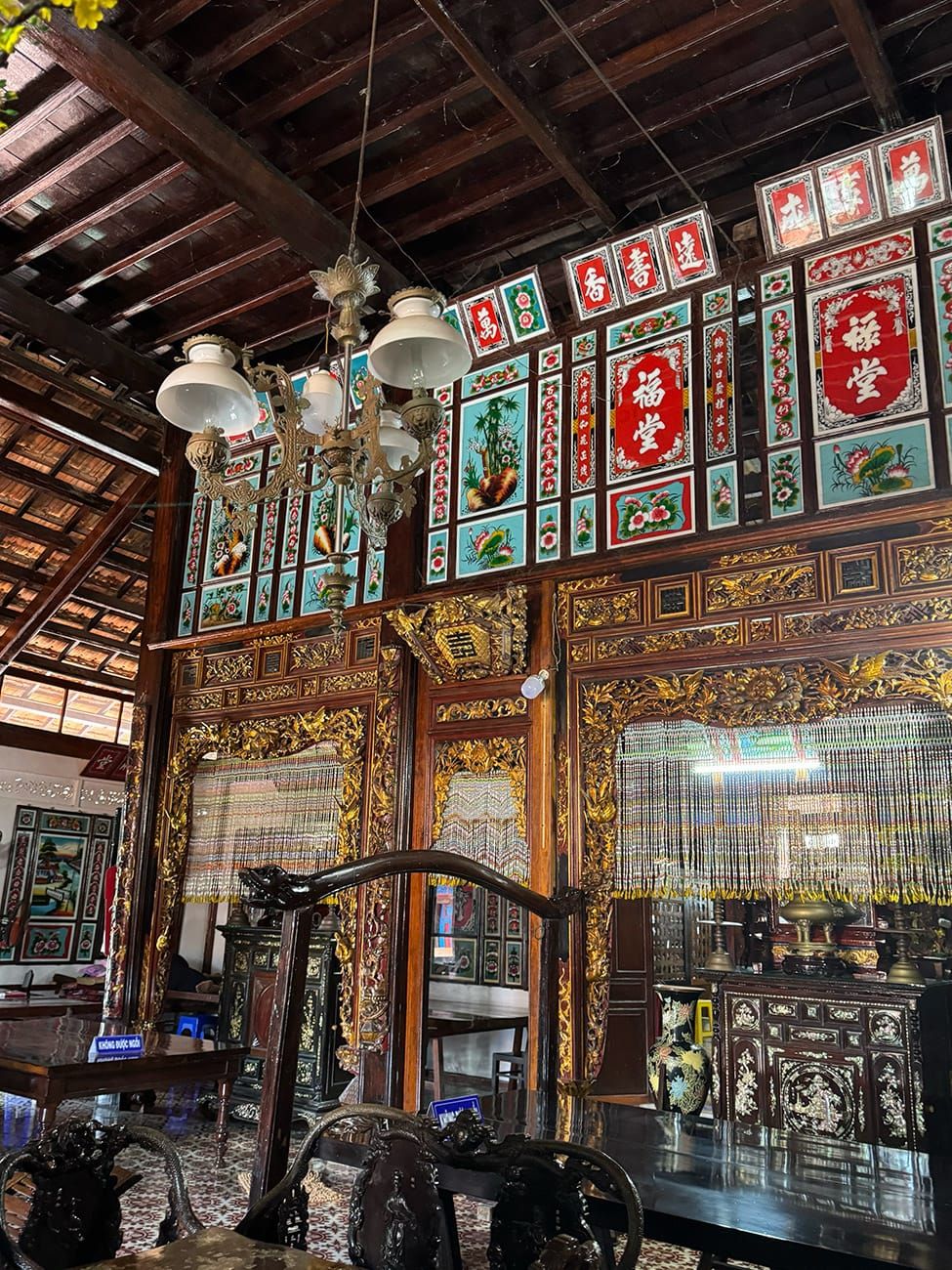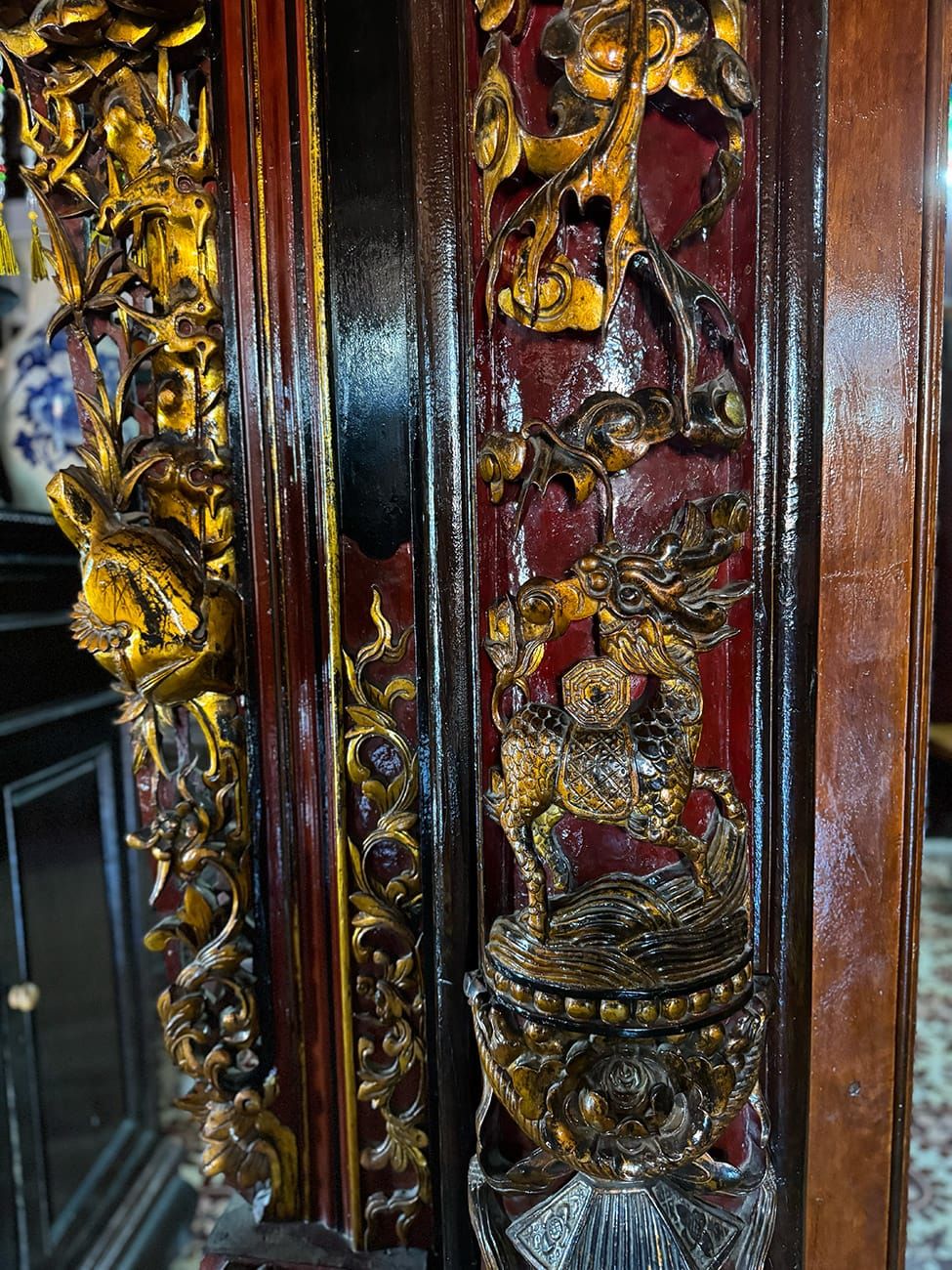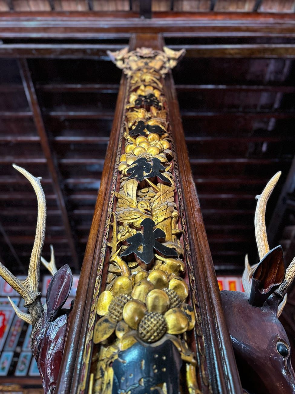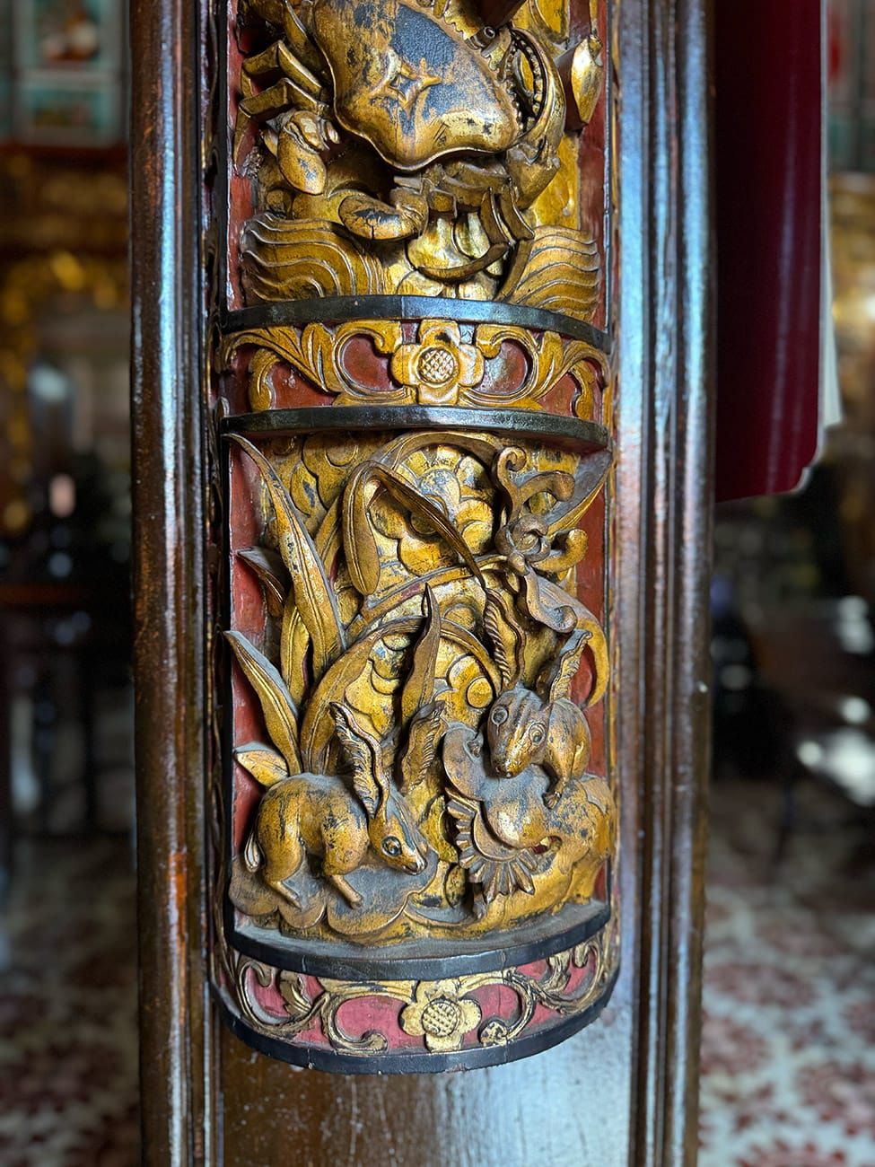 Bây giờ, chúng ta có thể đi xuống phía dưới. Bạn có thể đã quen kiến trúc Việt Nam hoặc Trung Hoa với kiểu điêu khắc rồng phụng, mai lan cúc trúc... Nhưng những người con miền biển này làm mọi thứ khác đi: