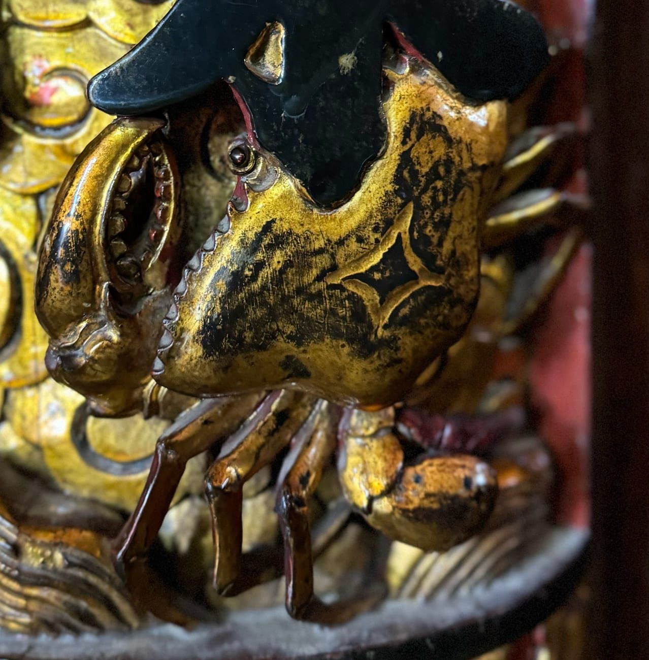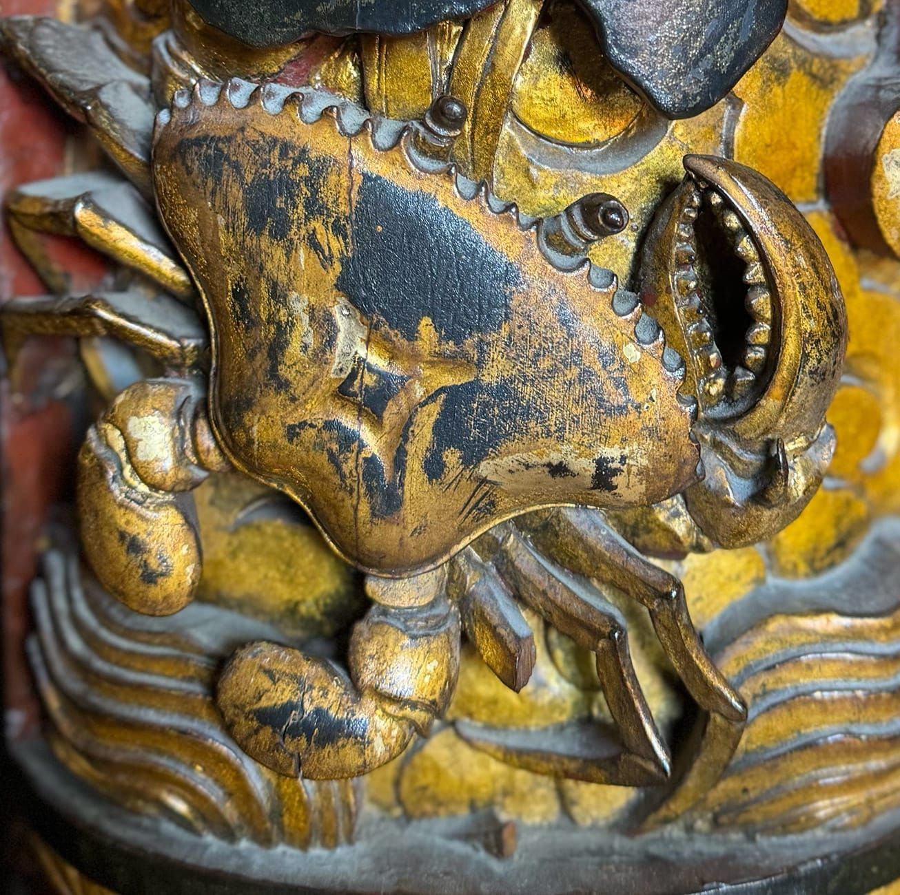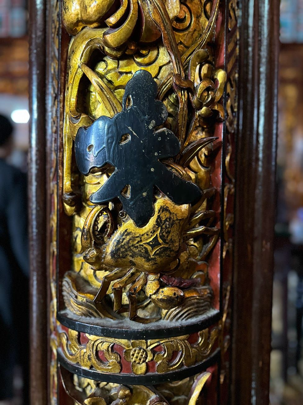 Con cua biển theo tỉ lệ 1:1 này được chạm thẳng vào cột gỗ với các chi tiết tách hẳn ra phía ngoài như càng, chân, mái chèo thật sống động. Đến gần hơn chút nữa, bạn có thể thấy đôi mắt hay những chấm tròn trên chiếc càng lớn không khác gì một con cua thật.