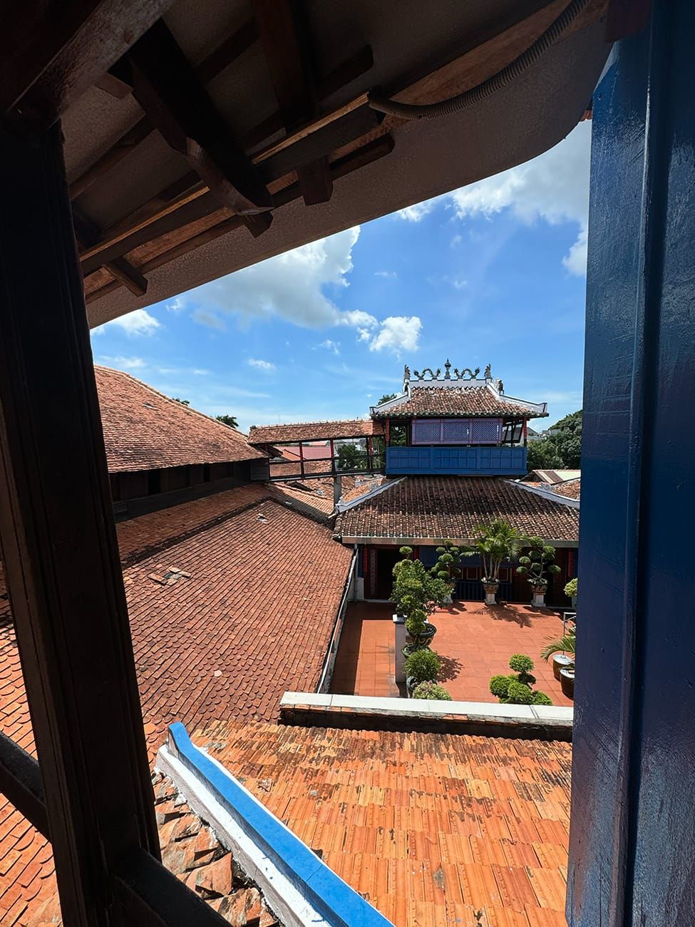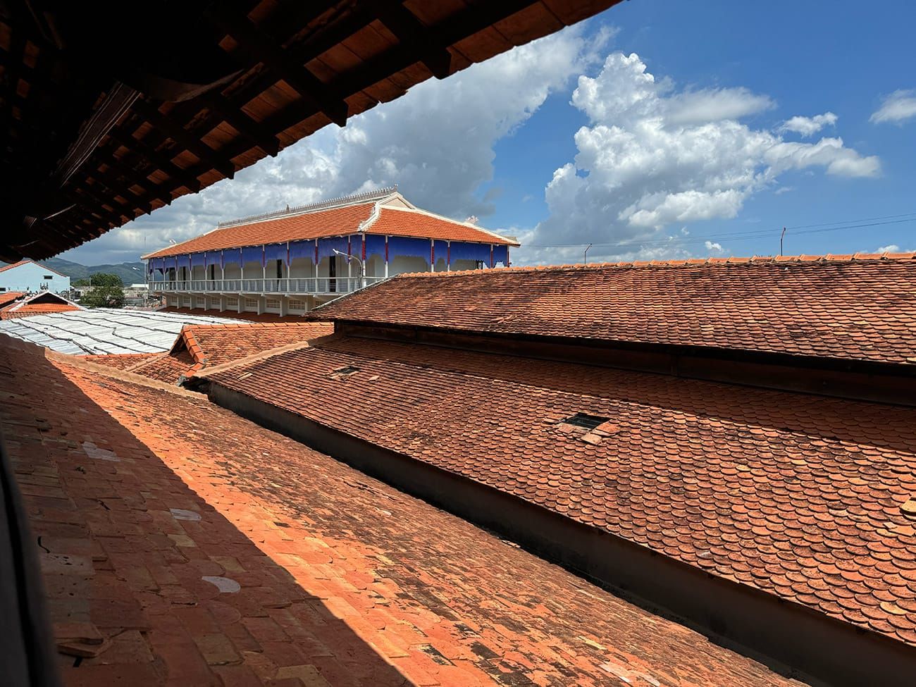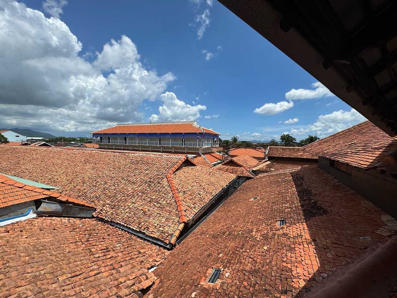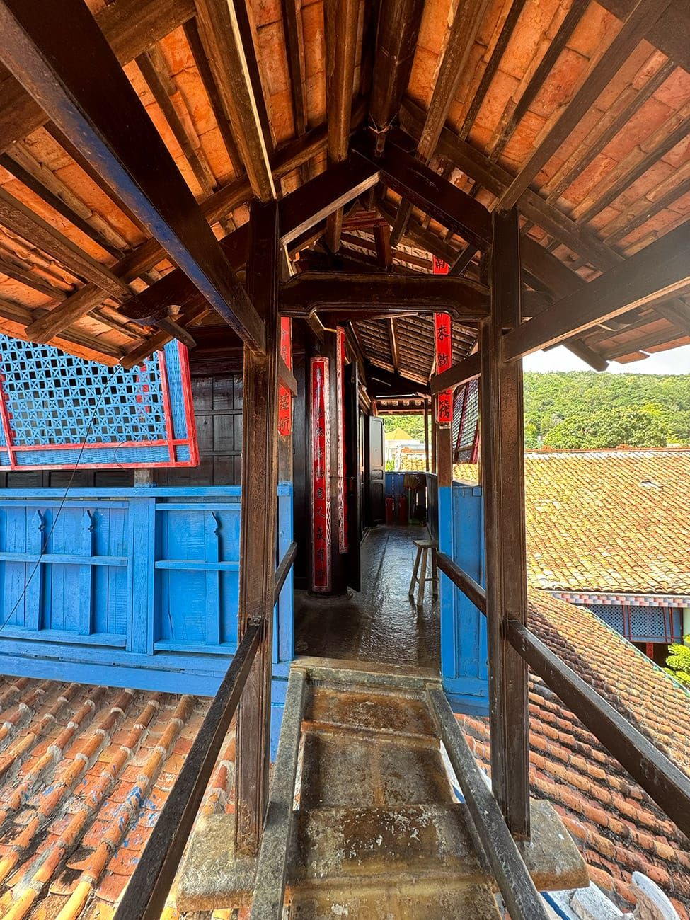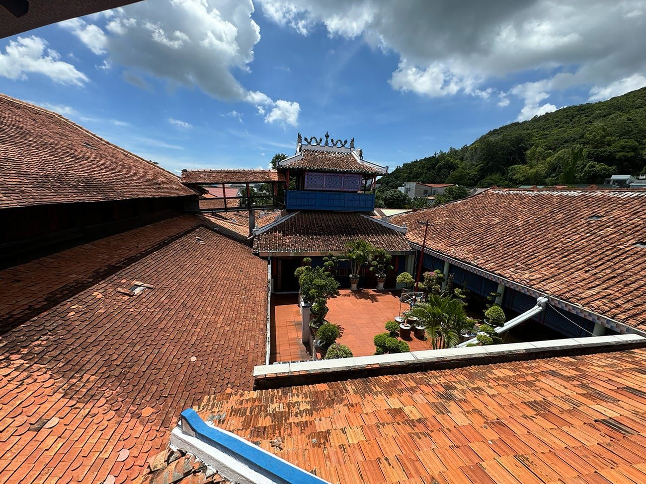 Từ trên lầu cao, bạn có thể nhìn thấy núi đồi xanh phía xa xuyên qua dãy ngói đỏ.