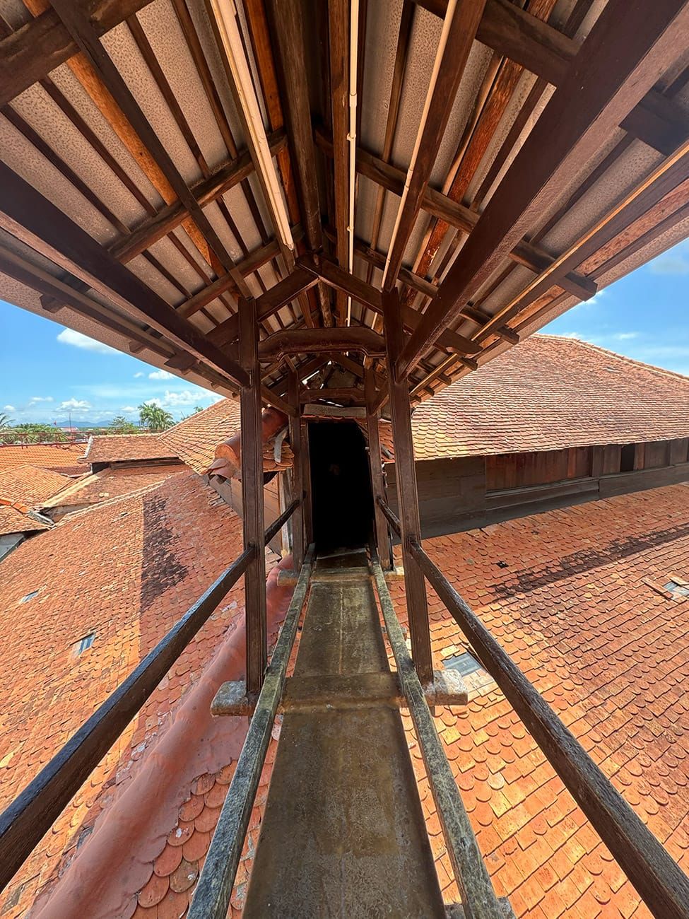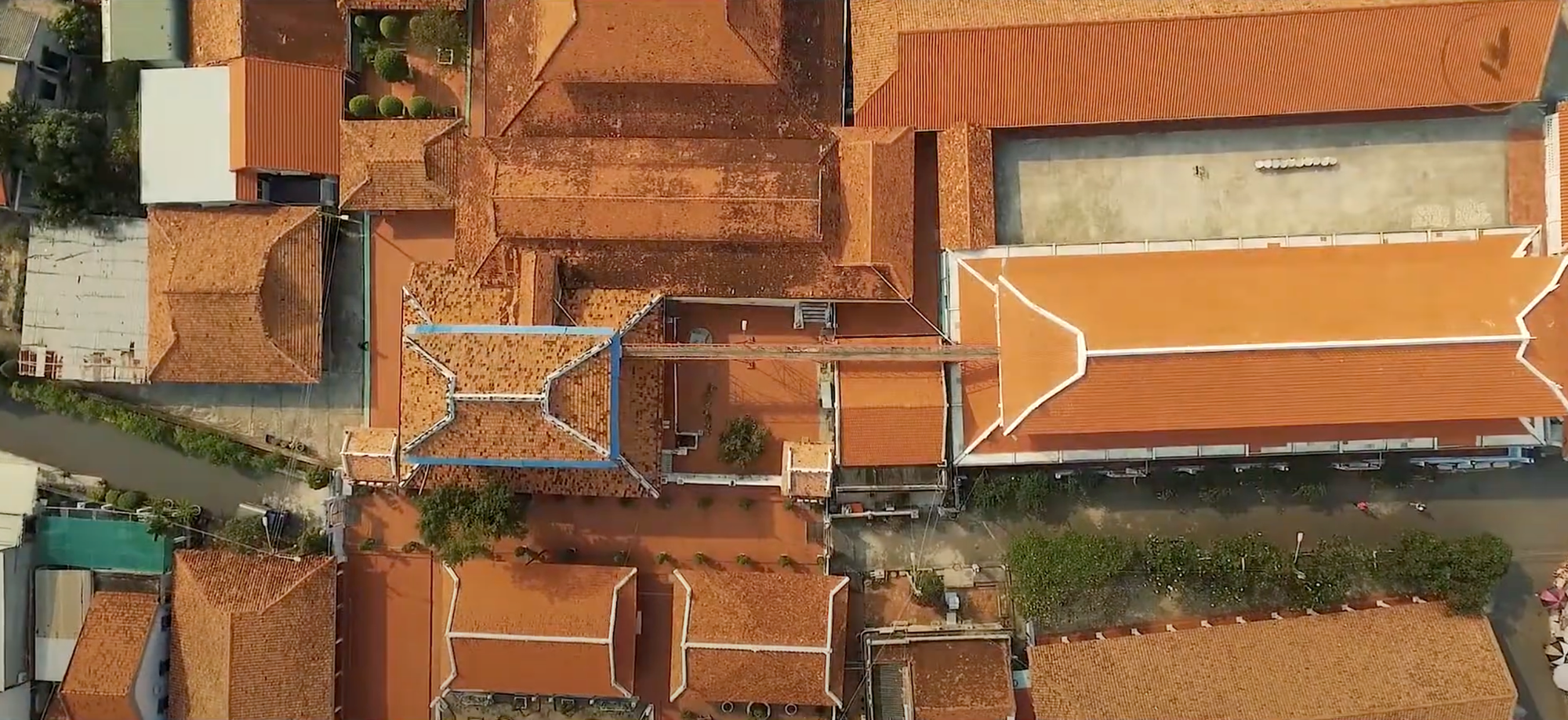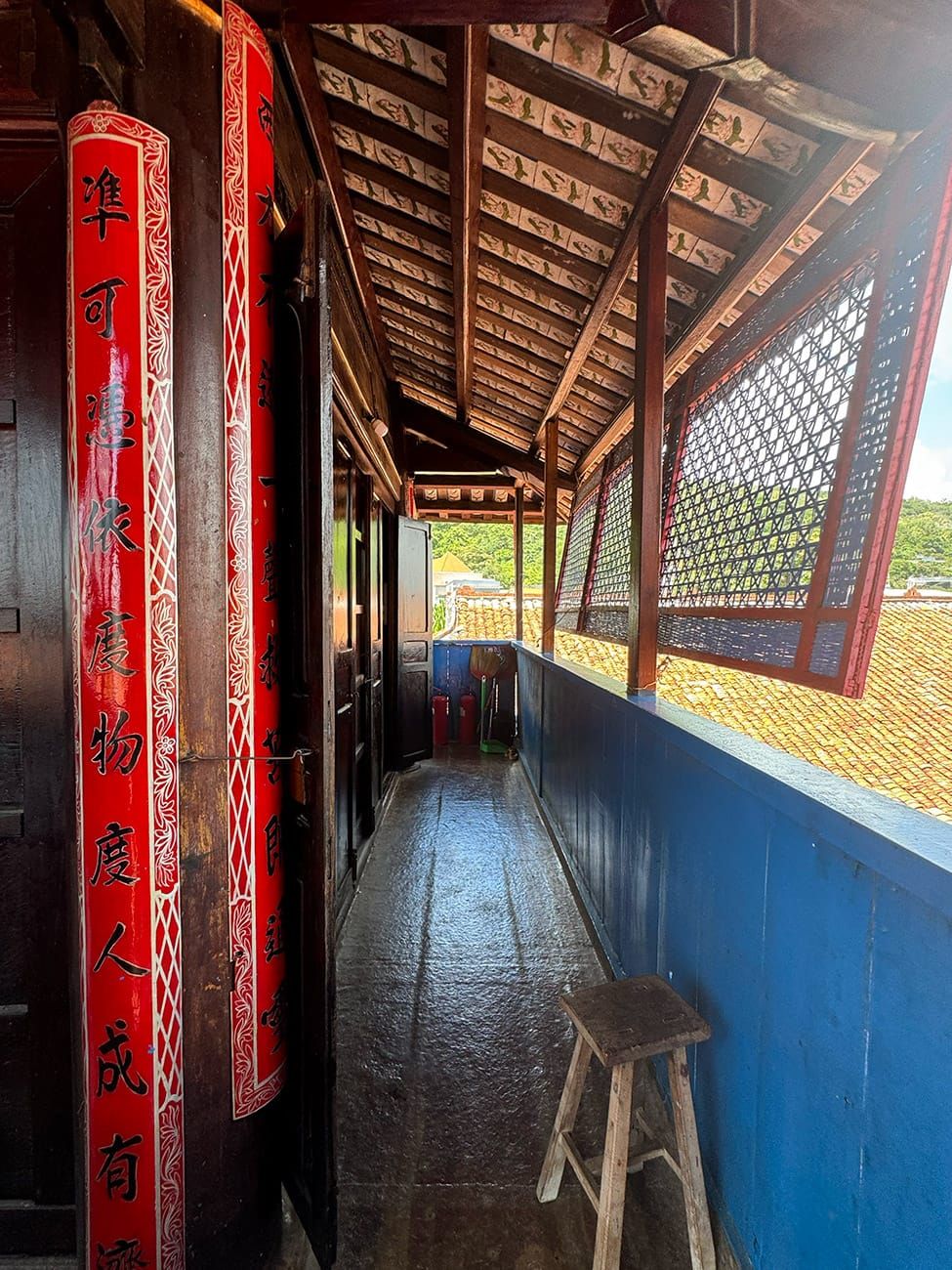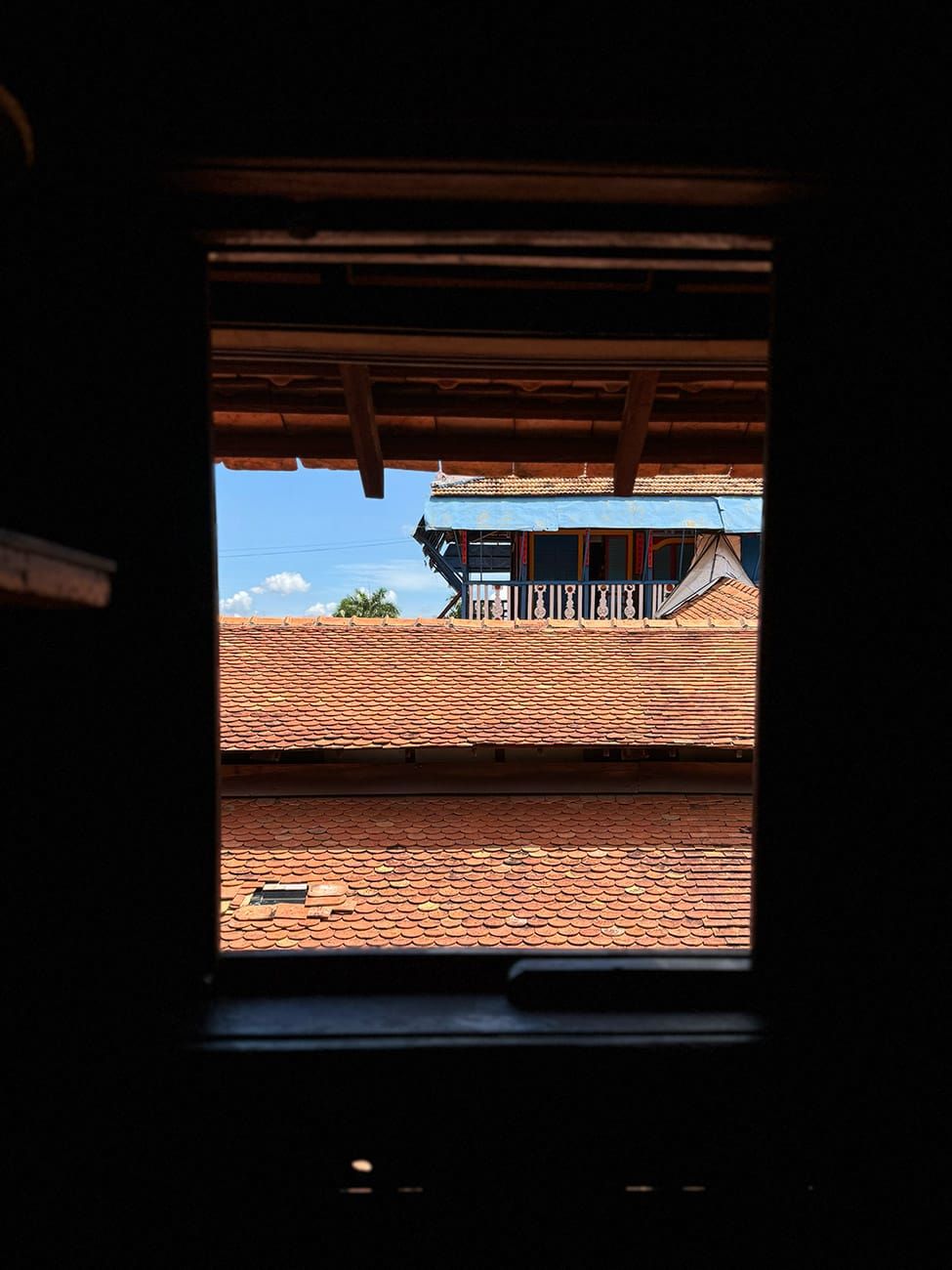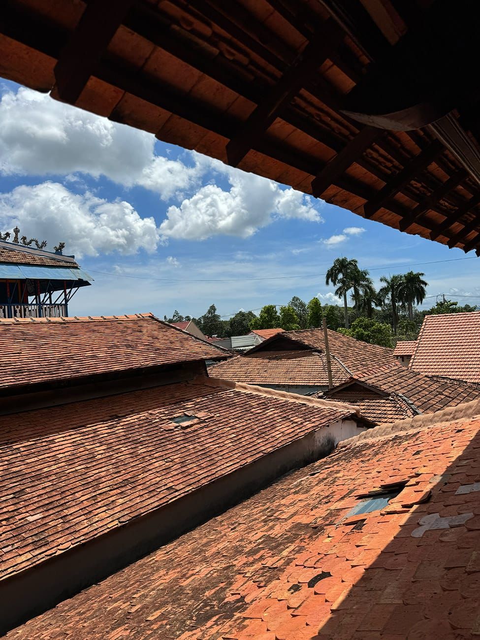 Từ trên lầu cao, bạn có thể nhìn thấy núi đồi xanh phía xa xuyên qua dãy ngói đỏ.