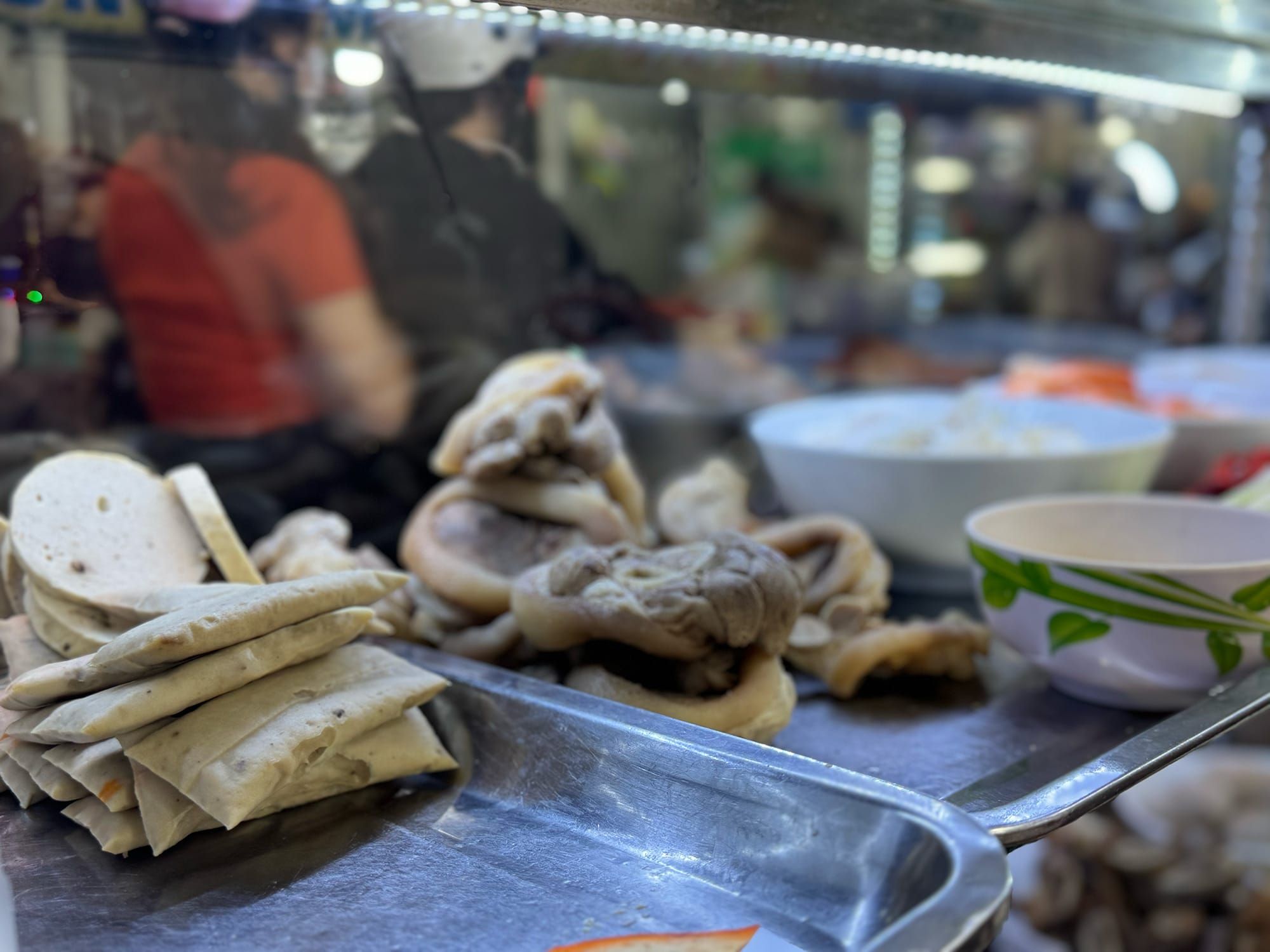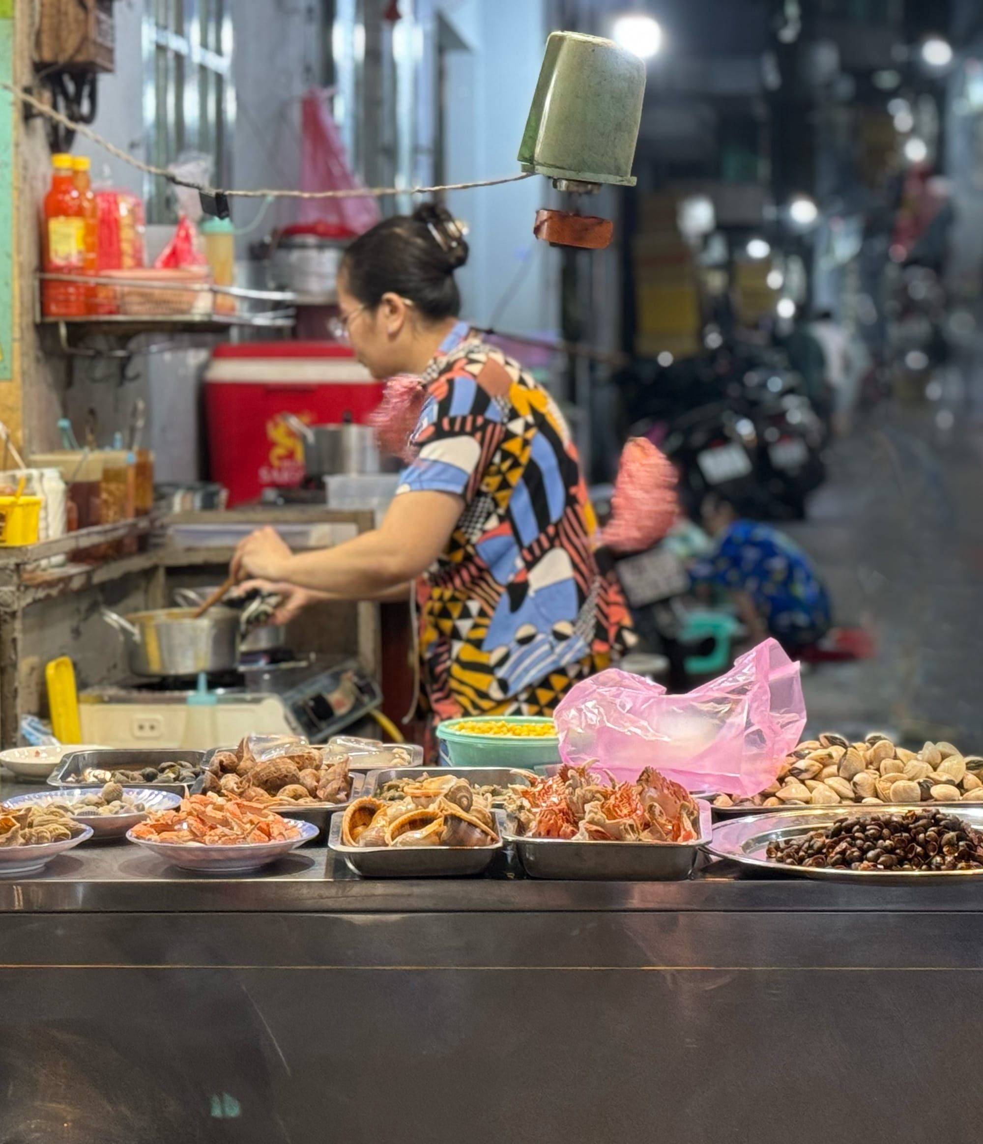 Có một niềm vui trẻ con nghe những thanh âm rộn rã ở đây. Tiếng lách cách của tô muỗng chạm vào nhau, tiếng xì xèo của nấu nướng, tiếng gọi món, tiếng gọi nhau, tiếng húp xì xụp... Sau đó hương thơm ngào ngạt của đồ ăn bốc khói.