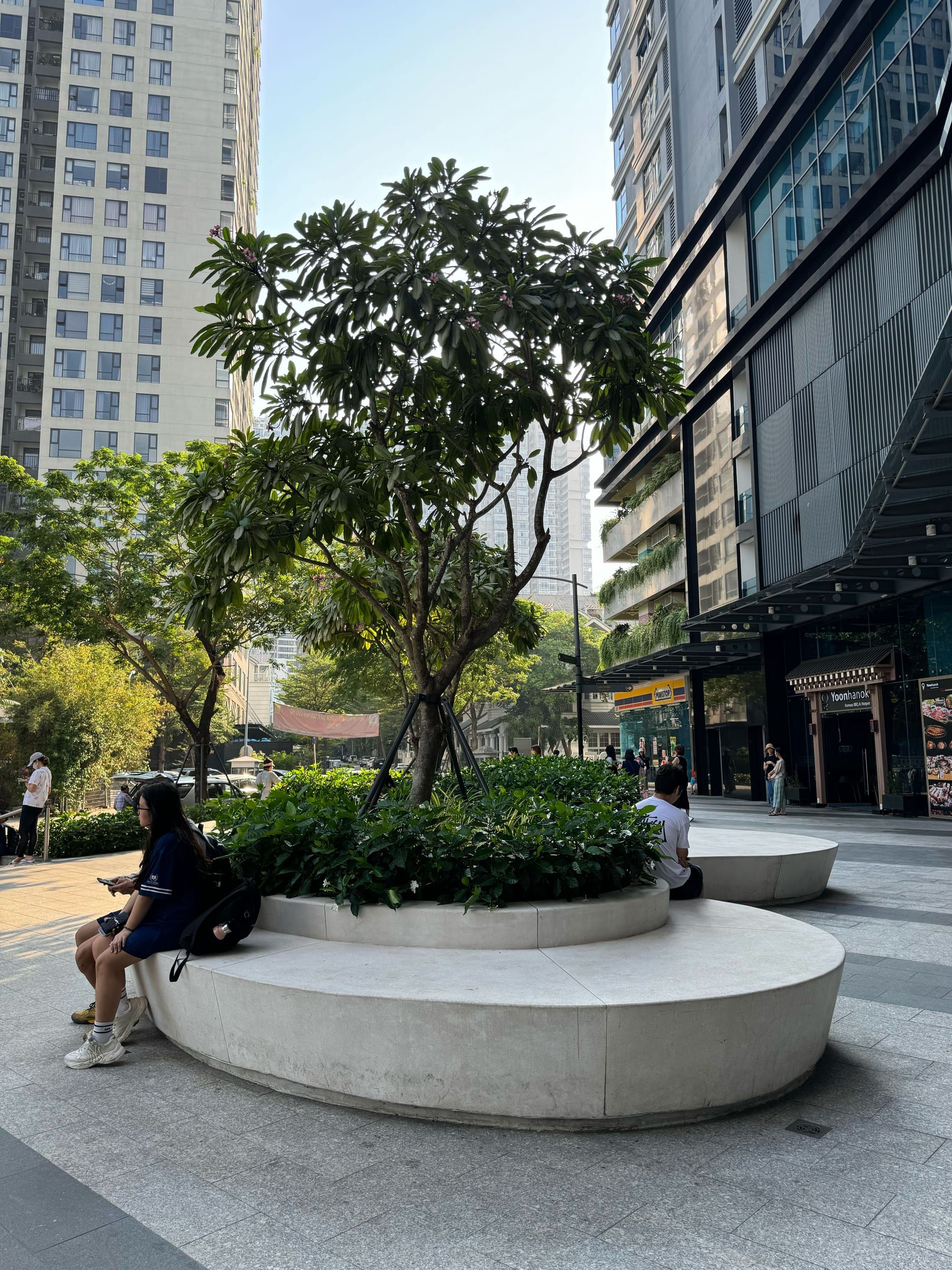 Aramour có khu vực ngồi ngoài trời với hành lang rộng rãi và nhiều cây xanh...