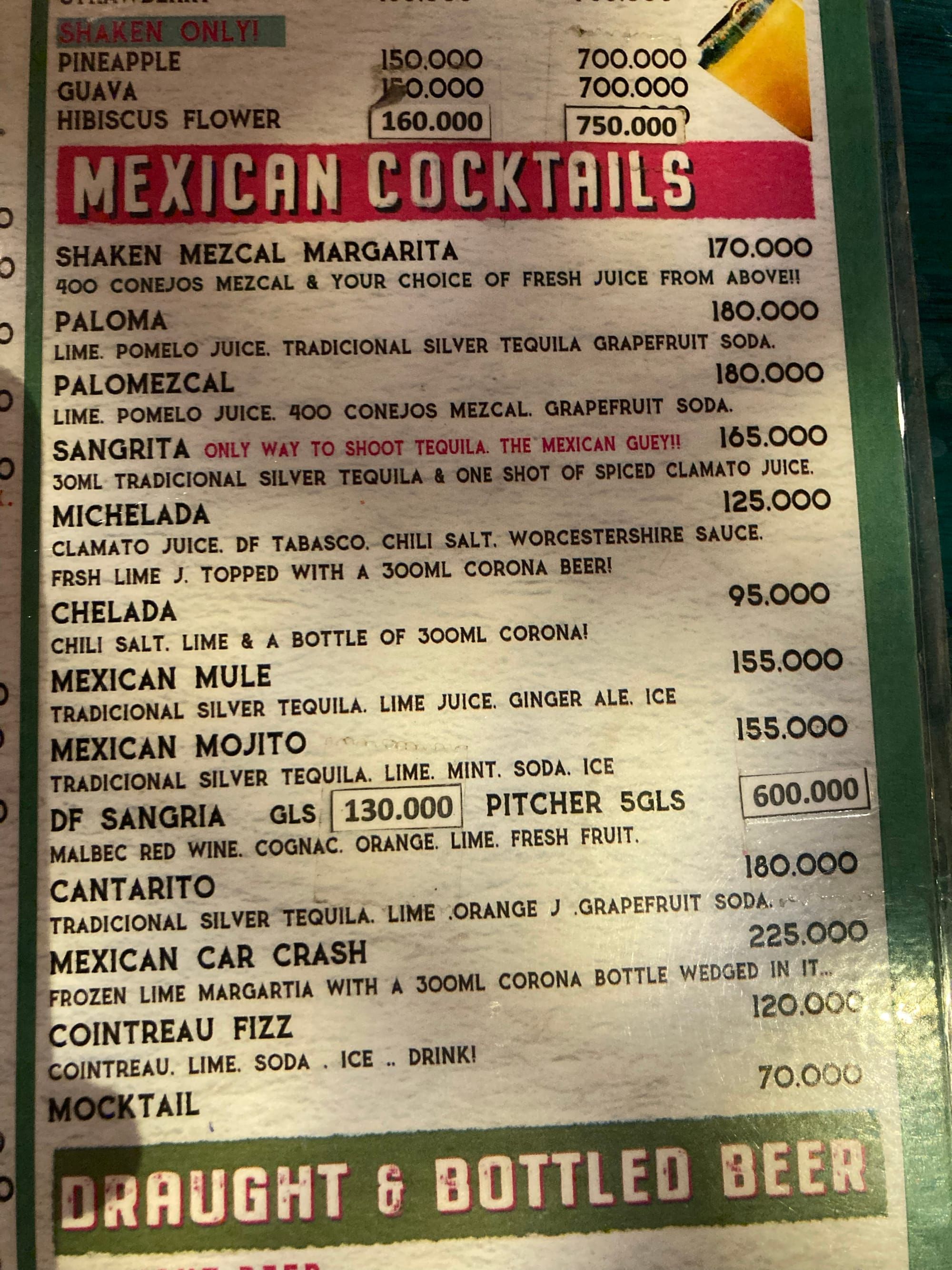 Tất nhiên, Mexico không thể thiếu những chai Corona hay vị tequila độc đáo. Tuy nhiên, danh sách cocktail ở đây mới thật sự đặc biệt. Nhiều loại Mexico đặc trưng rất lạ nhưng lại gần gũi với chúng ta như cocktail ổi nhấm nháp cùng loại muối cực kỳ cay. Có vẻ người chết khá nghèo nên giá cocktail ở đây rất phù hợp với người sống.