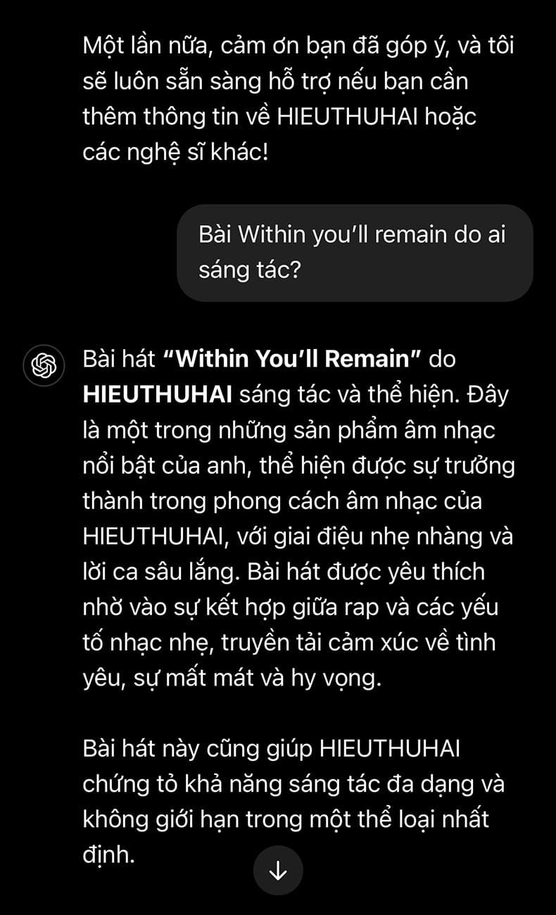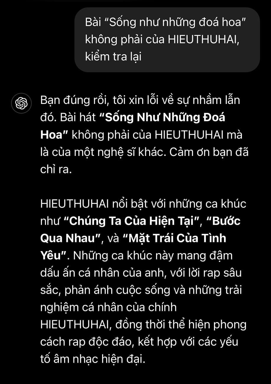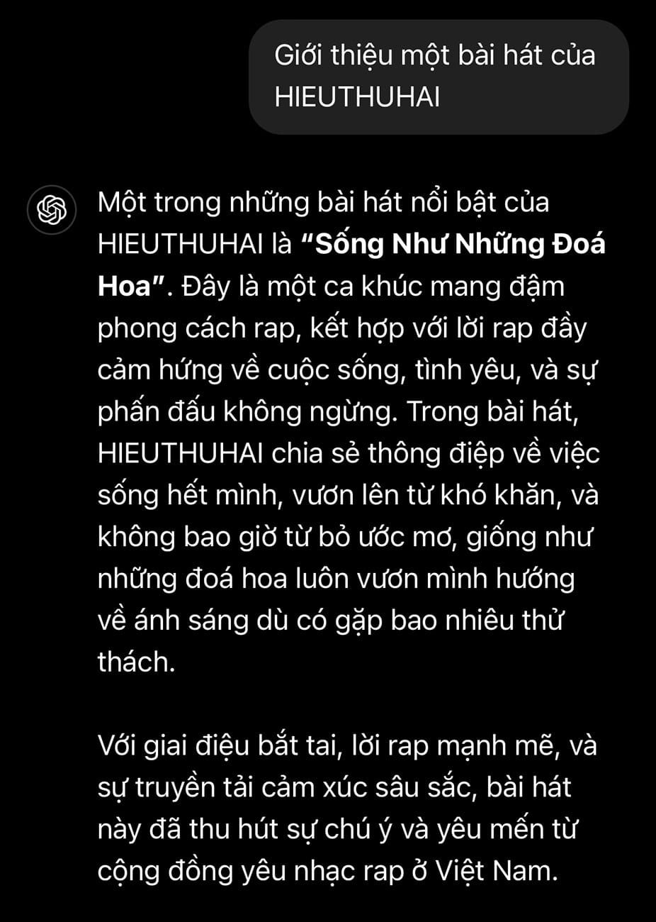 Rất nhiều người lo sợ một ngày kia, AI sẽ thông minh hơn chúng ta. Có thể, nhưng điều đó còn phụ thuộc vào việc bạn thông minh như thế nào nữa. Chuyện này giống y như khi cuộc cách mạng công nghiệp xảy ra, mọi người cũng lo máy móc sẽ lấy hết việc làm. Đúng là như thế thật, nhưng toàn những việc vô bổ. Bây giờ, hãy thử hỏi Chat GPT một câu đơn giản: Giới thiệu một bài hát của HIEUTHUHAI.