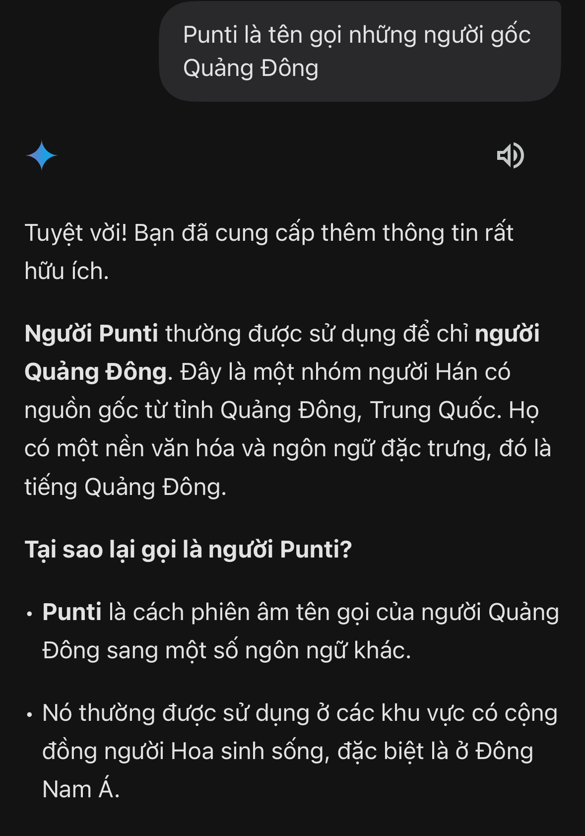 Dù sao, Gemini cũng biết tiếp thu, nhưng phần bên dưới lại sai be bét. Punti là từ được khắp Trung Quốc sử dụng chứ không riêng Đông Nam Á, chỉ người Quảng ở Quảng Đông, Quảng Tây và Quảng gốc ở Hongkong nữa.