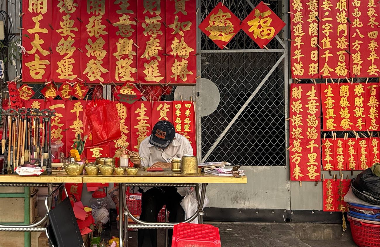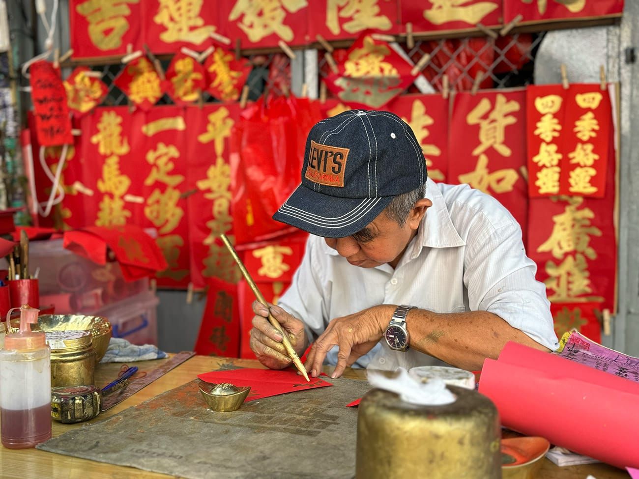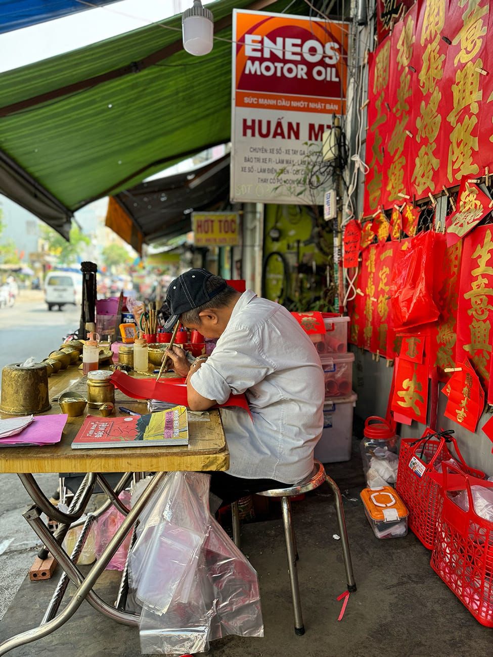 Ông chú này làm việc cả ngày ở đây trong những ngày cận Tết. Rất nhiều người đến thuê chú viết chữ, tùy theo nhu cầu của mình. Đó có thể là cầu ước về sức khỏe, sự nghiệp, buôn may bán đắt, gia đình êm ấm… Ngoài ra, một số nội dung khó hơn, kiểu như đặc biệt dành cho việc dán két sắt chẳng hạn, dán bên ngoài để tiền lưu thông, dán bên trong để khóa các hiện kim lại, ngăn chúng đội nón theo bạn bè chạy lung tung, thất thoát. Tất cả các công dụng này đòi hỏi người viết phải hiểu nhiều phong tục lâu đời cũng như kinh nghiệm về các quy luật hoạt động của vũ trụ.