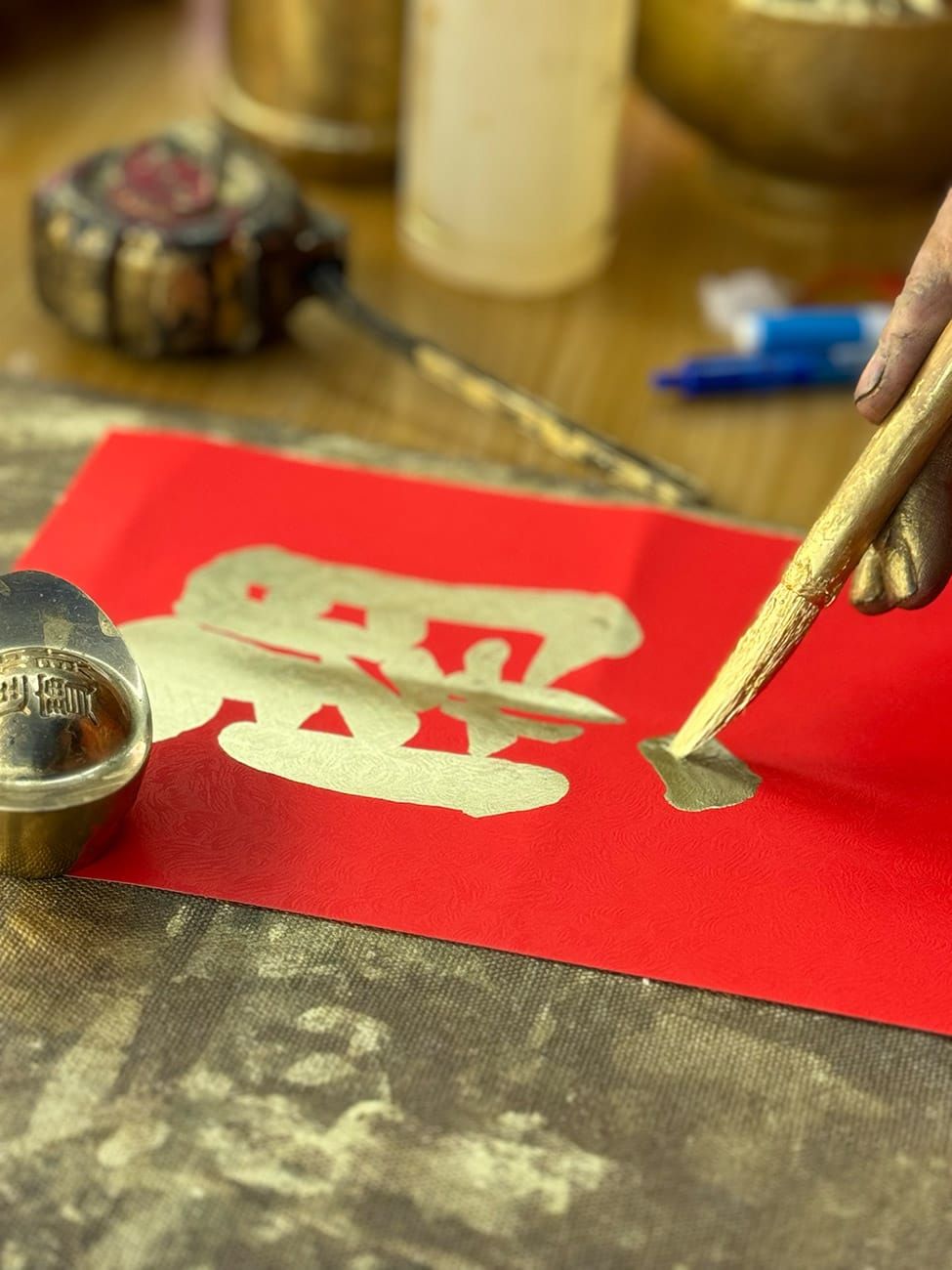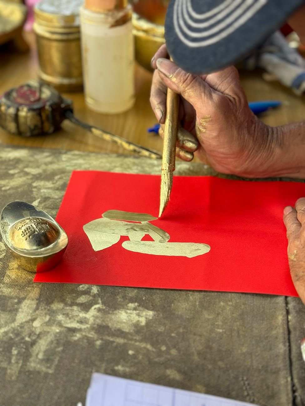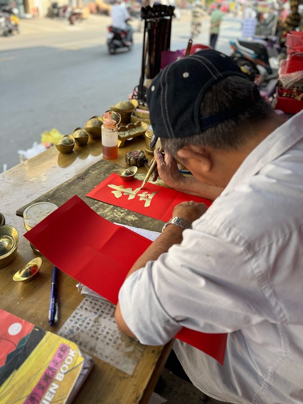 Ông chú này làm việc cả ngày ở đây trong những ngày cận Tết. Rất nhiều người đến thuê chú viết chữ, tùy theo nhu cầu của mình. Đó có thể là cầu ước về sức khỏe, sự nghiệp, buôn may bán đắt, gia đình êm ấm… Ngoài ra, một số nội dung khó hơn, kiểu như đặc biệt dành cho việc dán két sắt chẳng hạn, dán bên ngoài để tiền lưu thông, dán bên trong để khóa các hiện kim lại, ngăn chúng đội nón theo bạn bè chạy lung tung, thất thoát. Tất cả các công dụng này đòi hỏi người viết phải hiểu nhiều phong tục lâu đời cũng như kinh nghiệm về các quy luật hoạt động của vũ trụ.