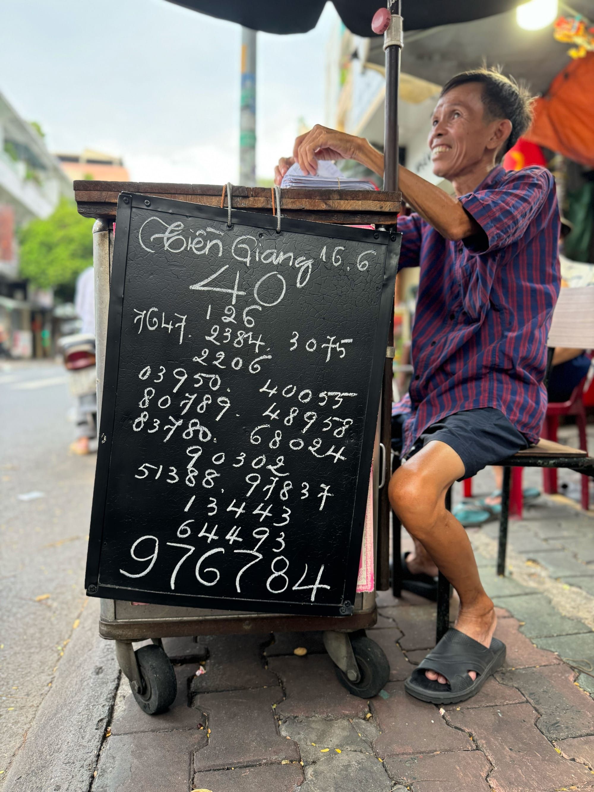 Ngày nay, khi tất cả chuyển sang internet, các bảng số nhựa hiện đại, bác bán vé số trên đường Nguyễn Trãi vẫn dùng cái bảng đen của mình.