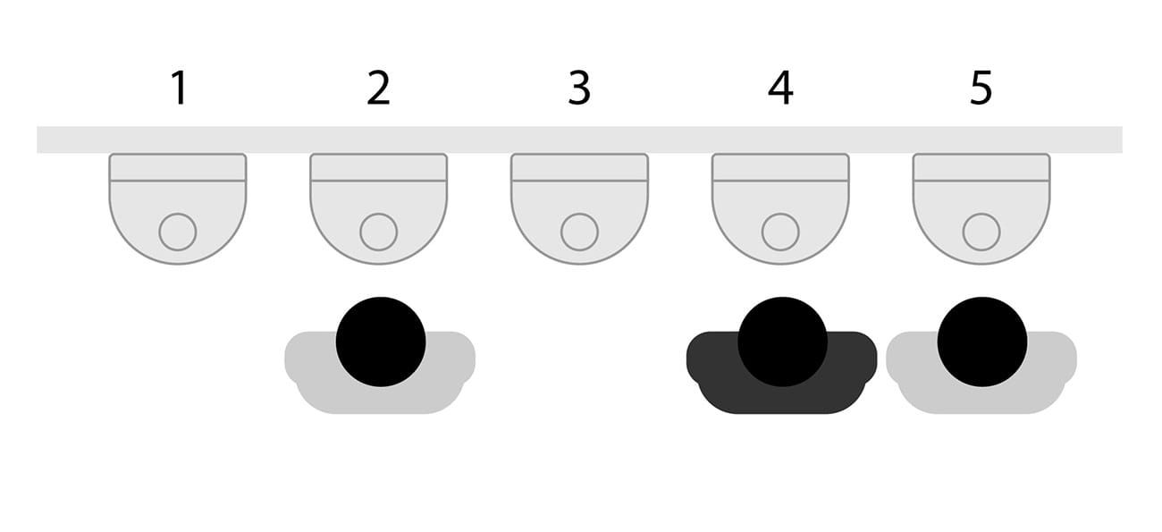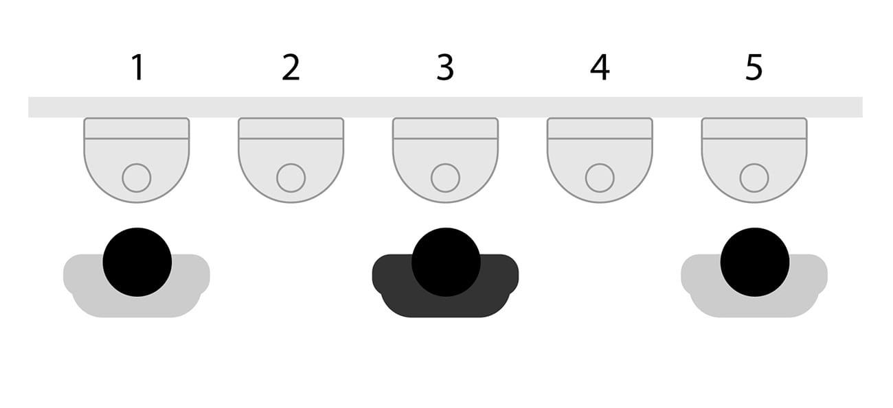 Trường hợp với năm bồn, vị trí 1, 3 và 5 đều khả thi trong khi 2, 4 lại dễ gây chen lấn.