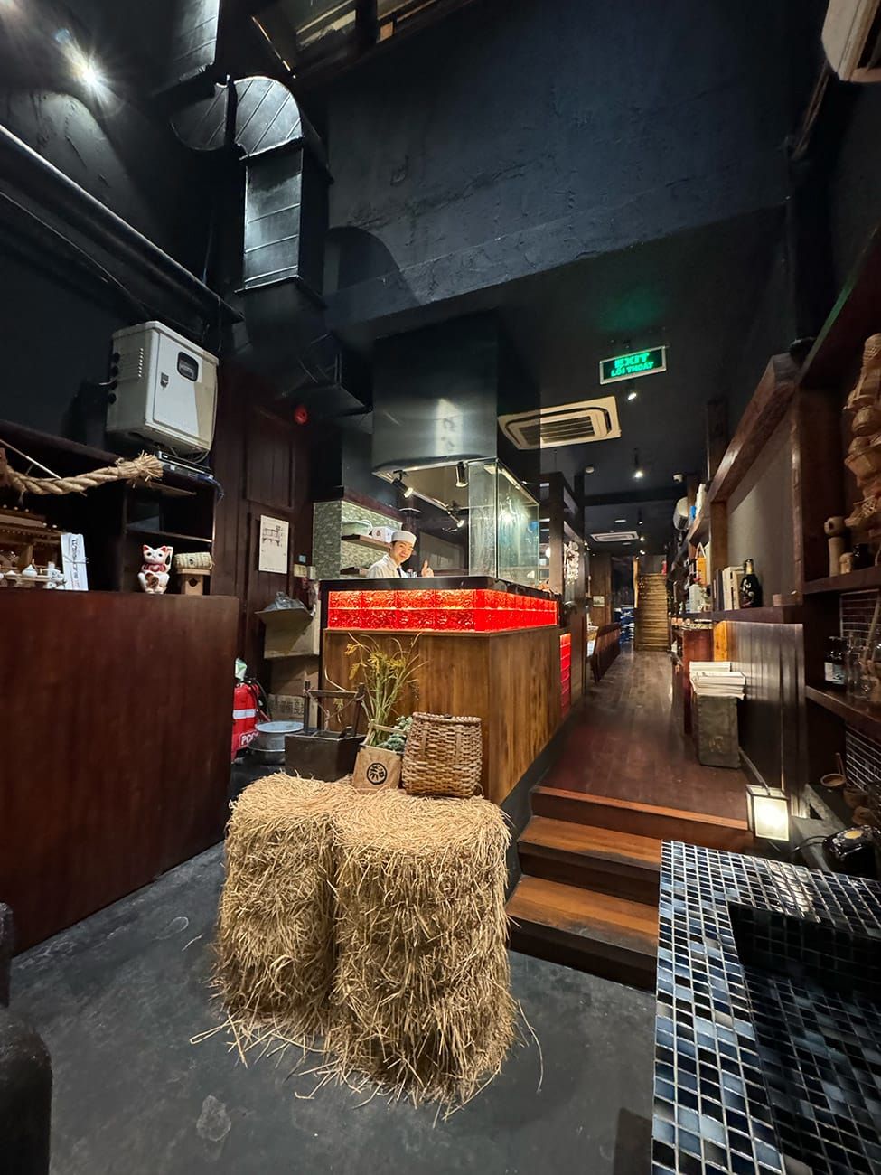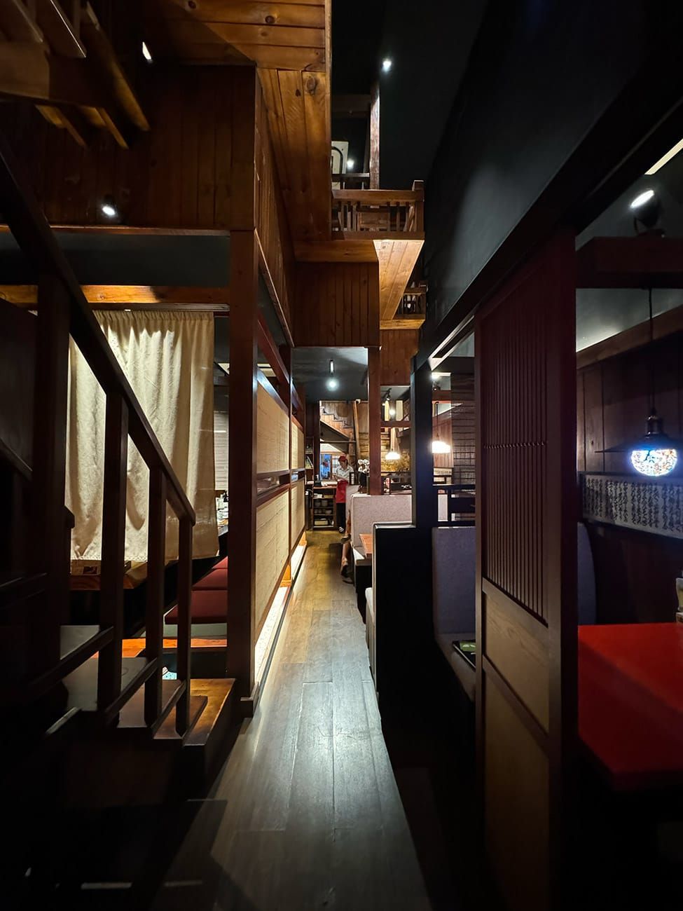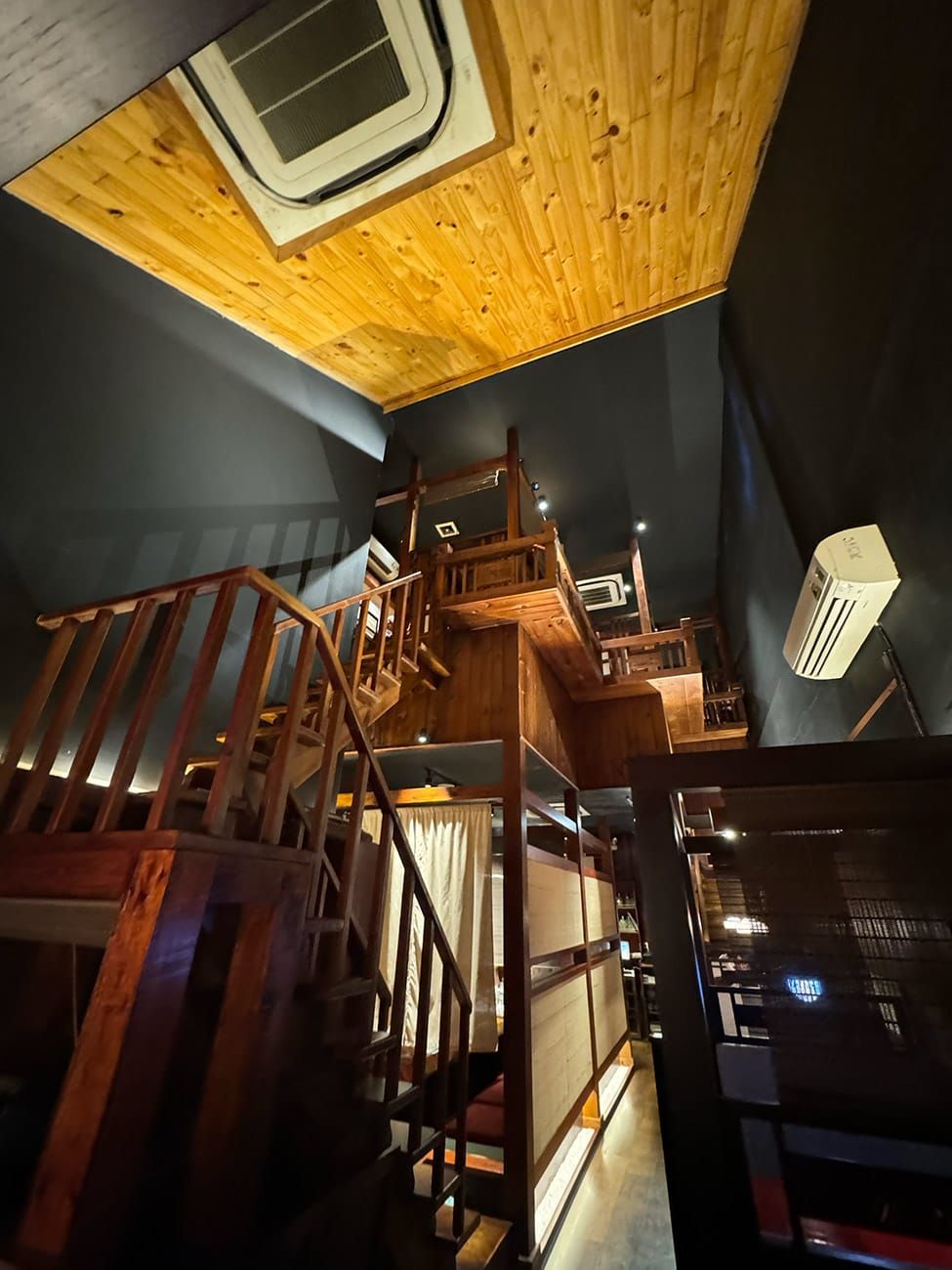 Nếu không muốn ngồi ở quầy bar với các anh đầu bếp trẻ, bạn có thể lên lầu, nơi không gian riêng tư sôi động hơn cùng các bác Nhật trung niên vui vẻ. Kiến trúc ở đây khác hẳn với vẻ nhàm chán bên ngoài, phong cách hướng nội nghĩ cũng kỳ lạ.