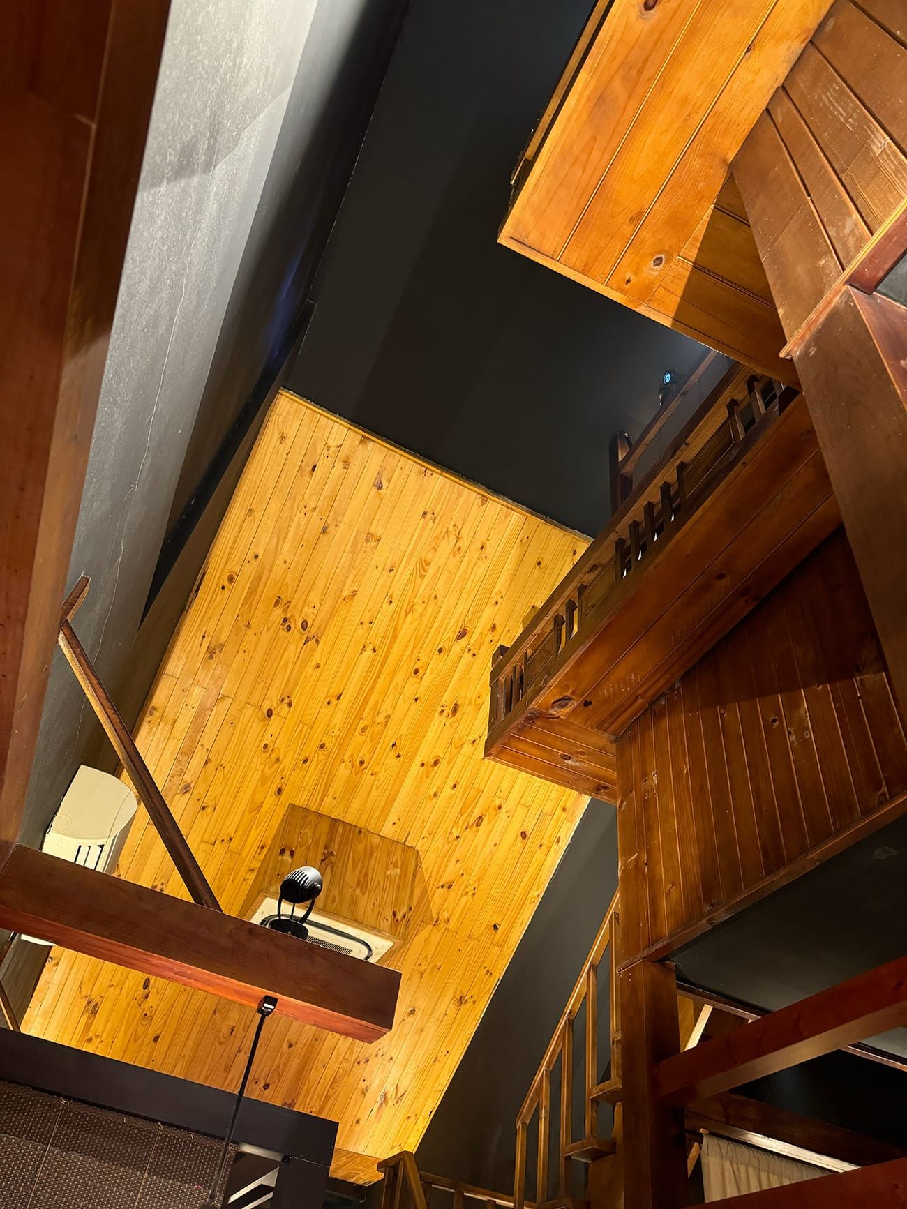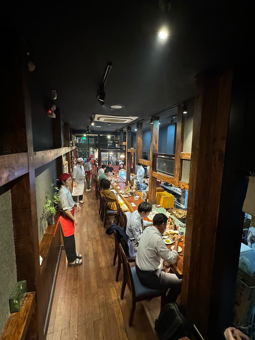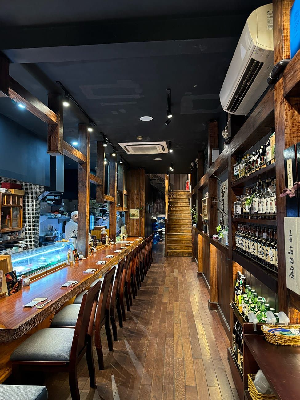 Nếu không muốn ngồi ở quầy bar với các anh đầu bếp trẻ, bạn có thể lên lầu, nơi không gian riêng tư sôi động hơn cùng các bác Nhật trung niên vui vẻ. Kiến trúc ở đây khác hẳn với vẻ nhàm chán bên ngoài, phong cách hướng nội nghĩ cũng kỳ lạ.