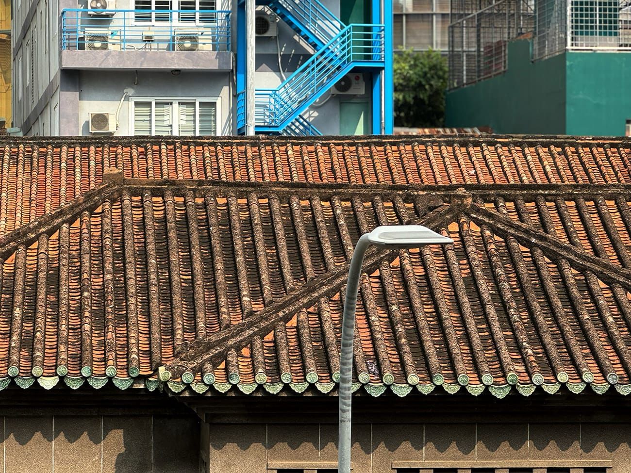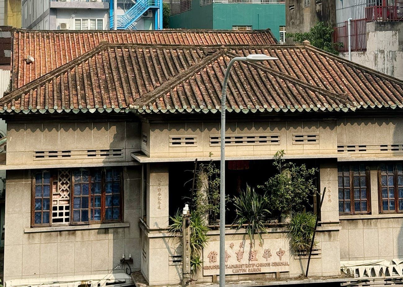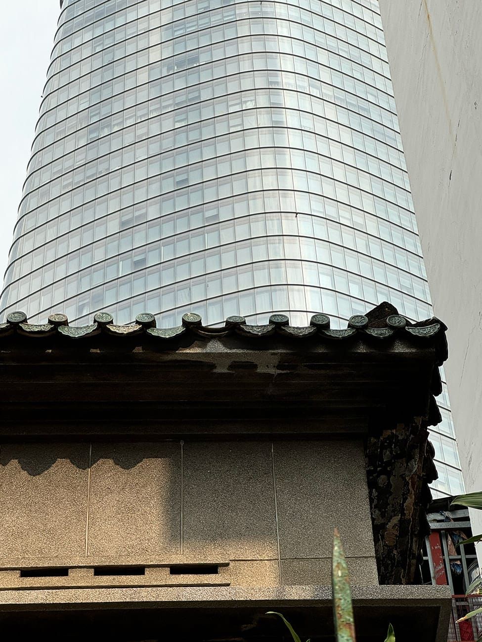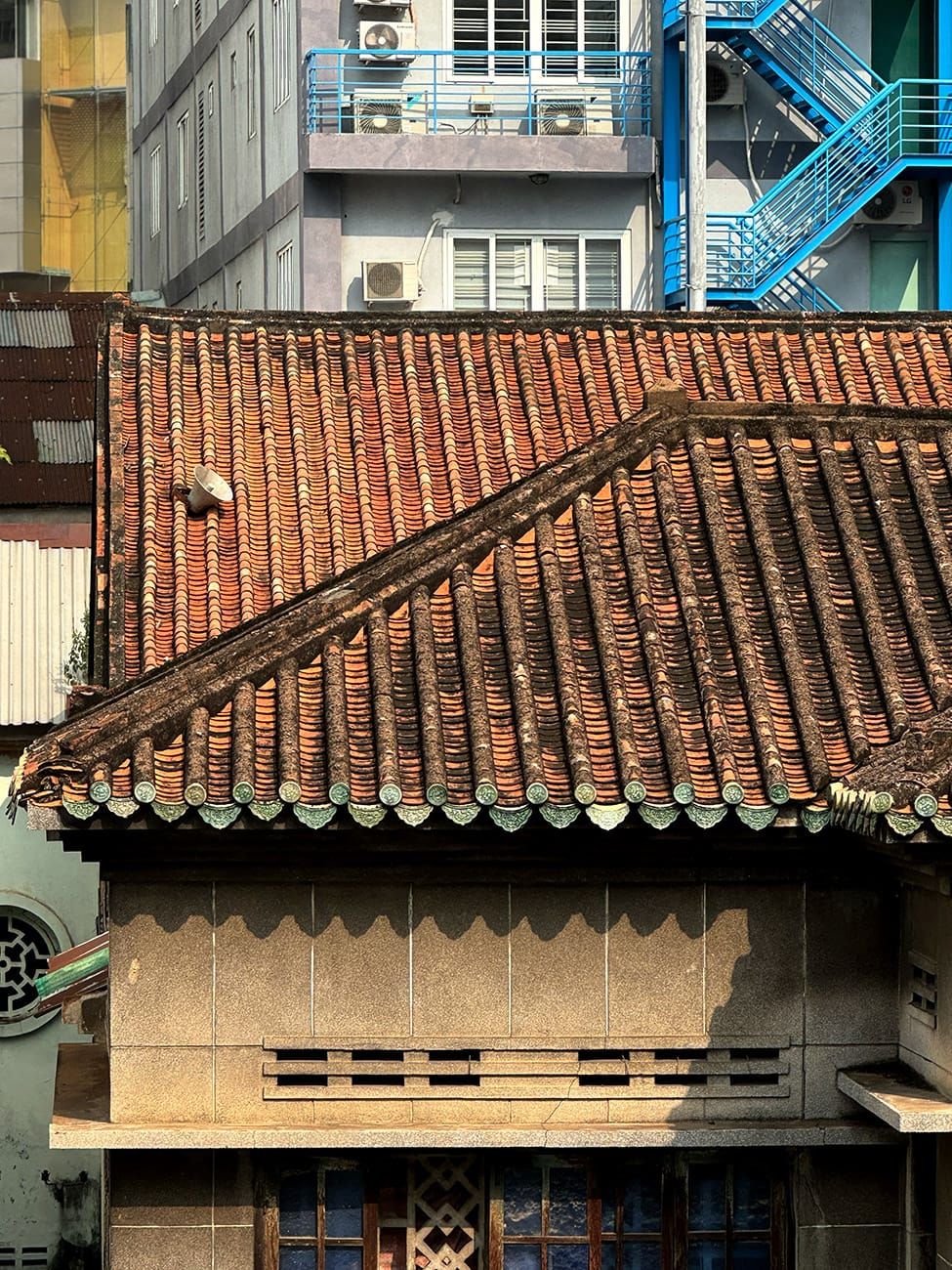 Nhìn ngói âm dương trên nền tòa nhà hiện đại lấp lánh phía sau mới thấy vẻ đẹp tương phản ở Sài Gòn. Ngôi nhà này nằm trong Chợ cũ đường Tôn Thất Đạm, bị bỏ mặc và xuống cấp. Dãy mái đỏ trùng điệp phía sau cho thấy độ lớn của nó: