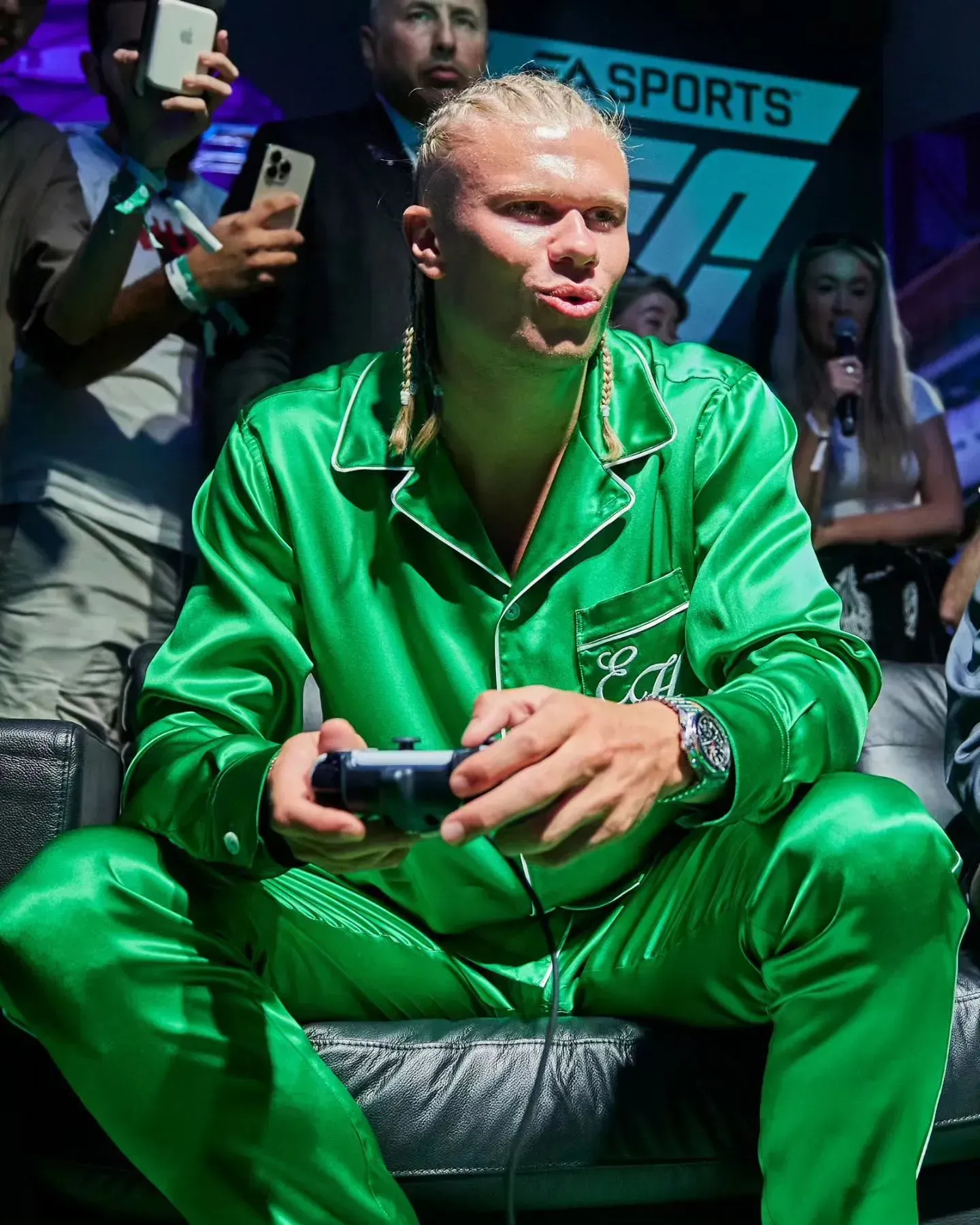Đến khoảng năm 2012, vì một lý do nào đấy, thế giới bắt đầu nhìn sang Việt Nam và âm thầm bắt chước cho đến nay. Điển hình như bức ảnh dưới đây, Erling Haaland trông không khác cô bán xôi đầu hẻm mấy, với bộ đồ xanh lá dứa này.