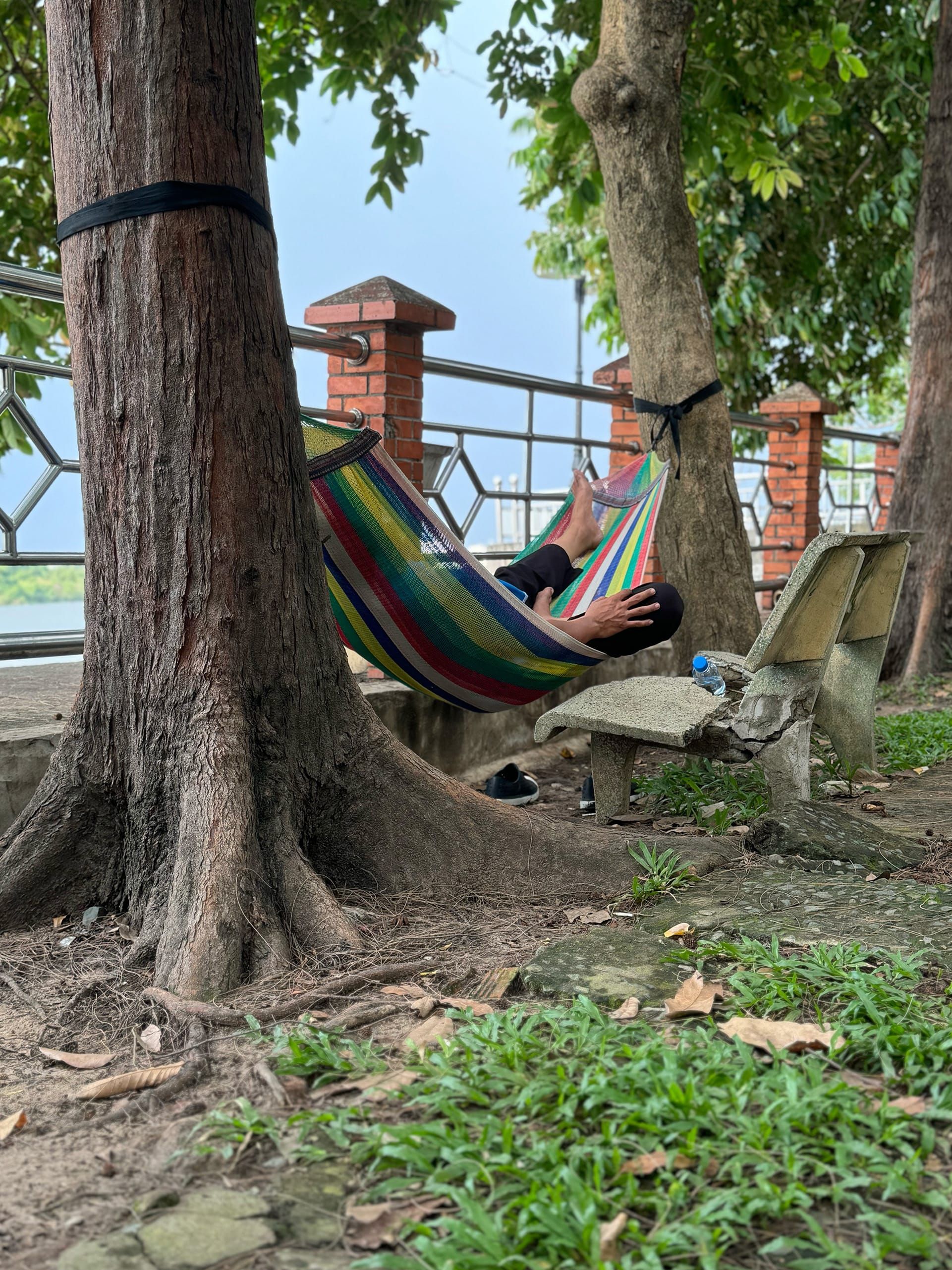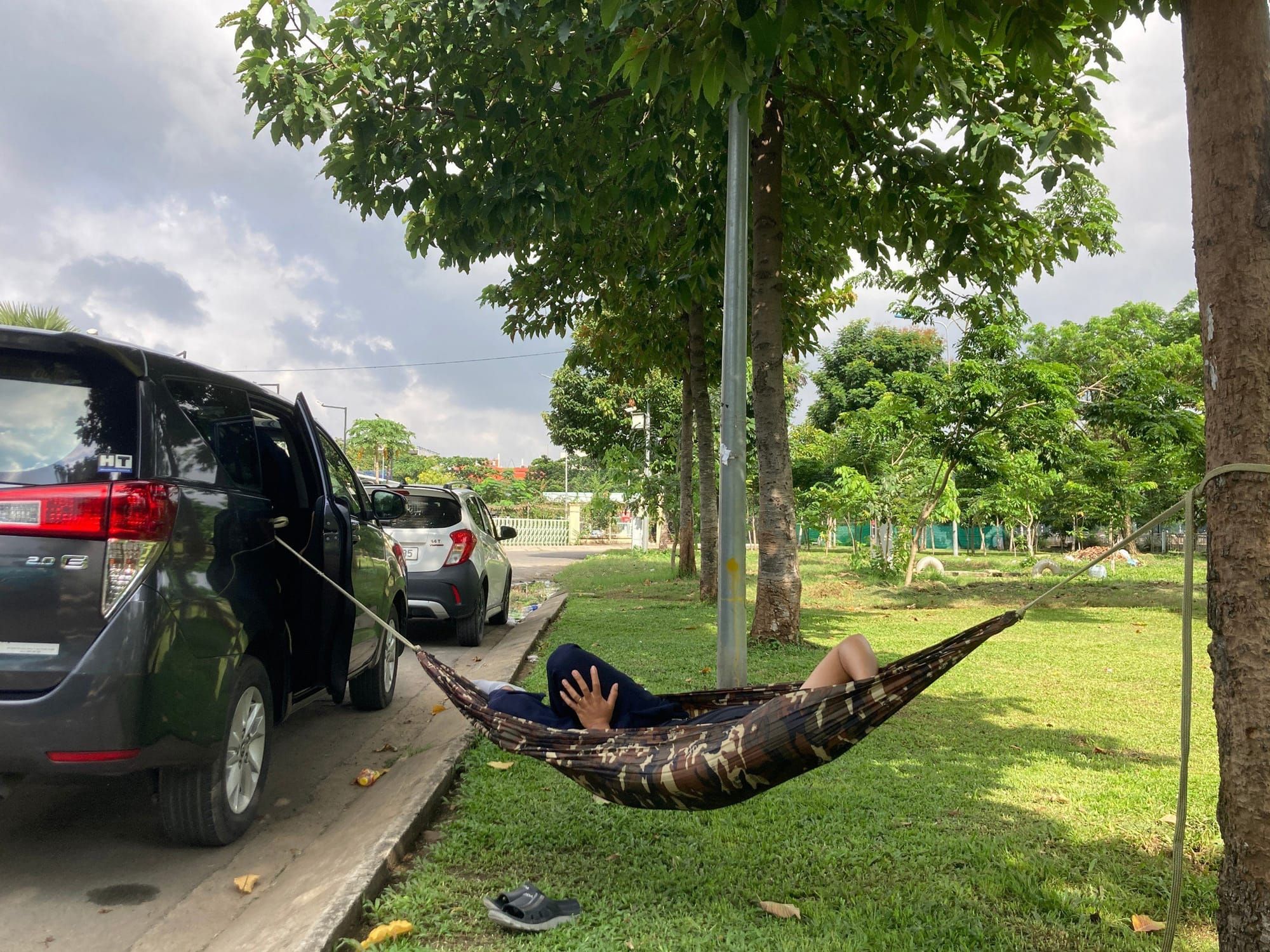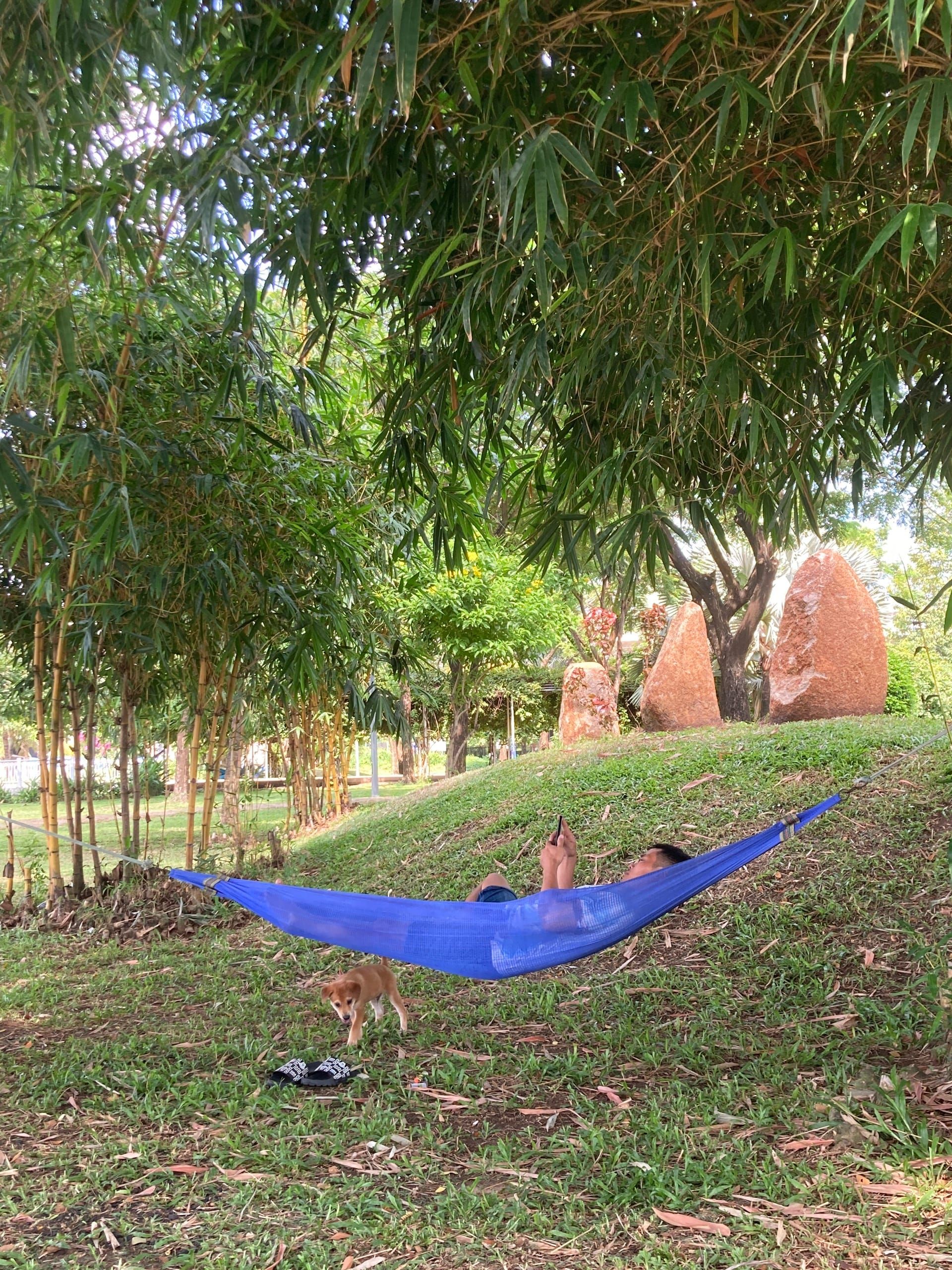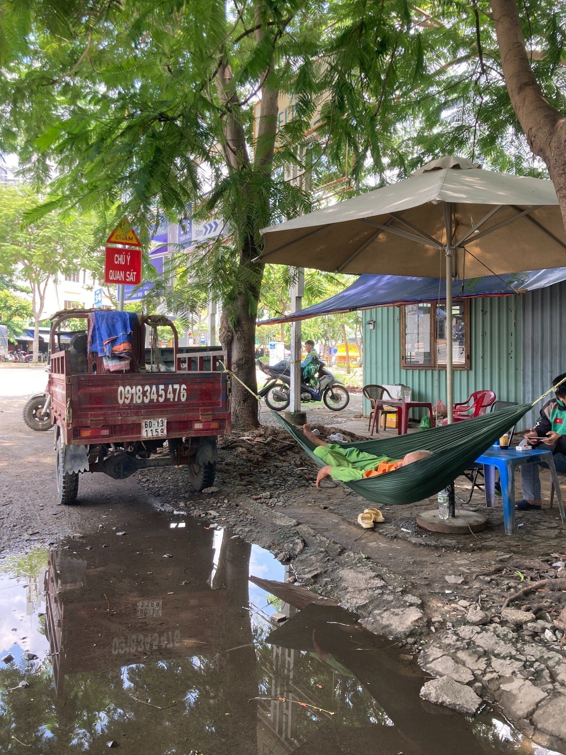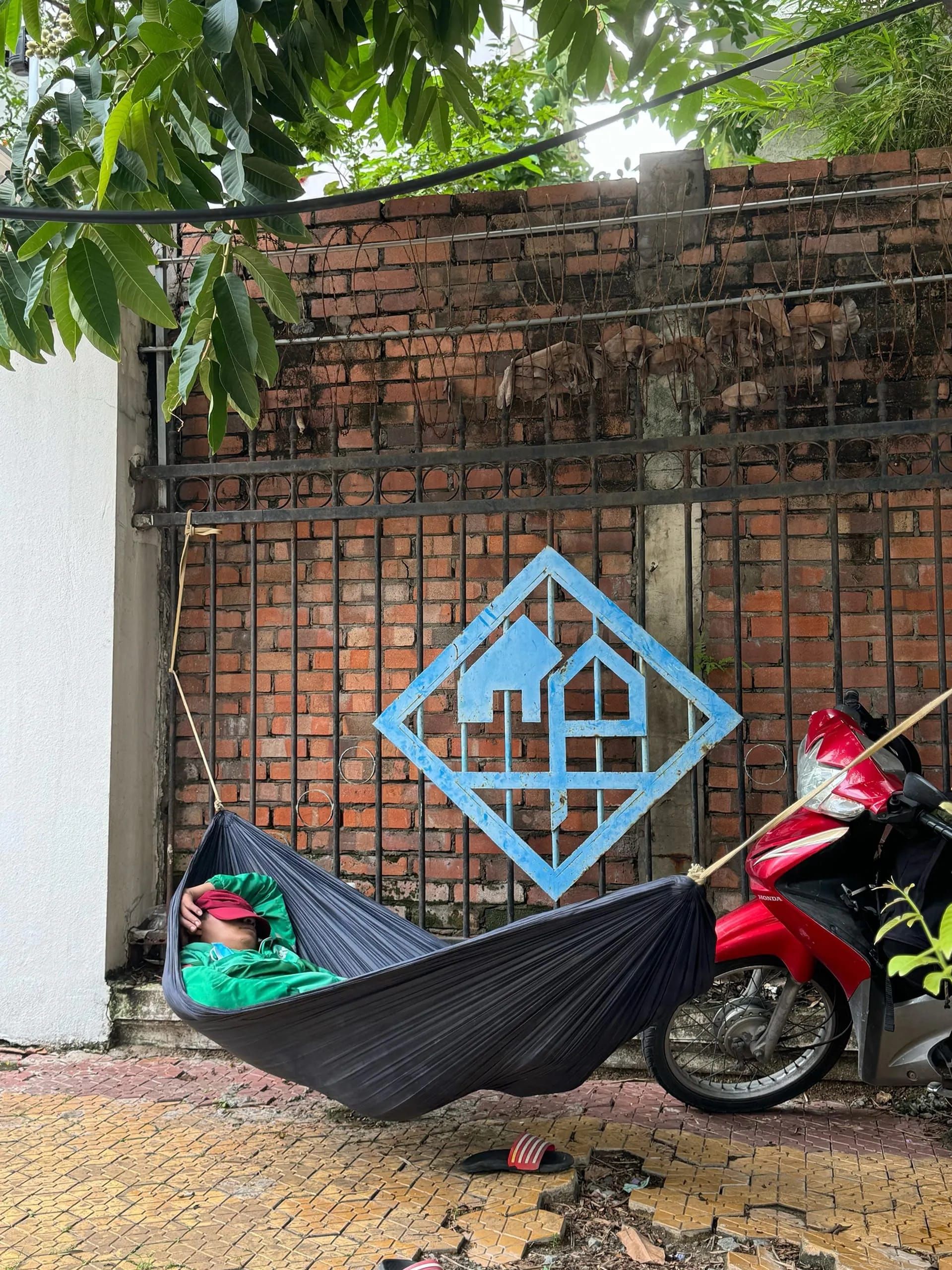 Có một thuật ngữ thật gọi là "ngủ thẳng cẳng". Giấc ngủ ngon nhất khi bạn được duỗi thẳng chân chứ không phải ngồi gật gù hoặc gục trên bàn làm việc. Trong chuyện này, chiếc võng hoàn thành rất tốt nhiệm vụ của mình khi bạn không thể nào khuân theo giường cả ngày được. Tìm đâu ra chỗ lý tưởng hơn cho anh Grab này ngả lưng bây giờ: