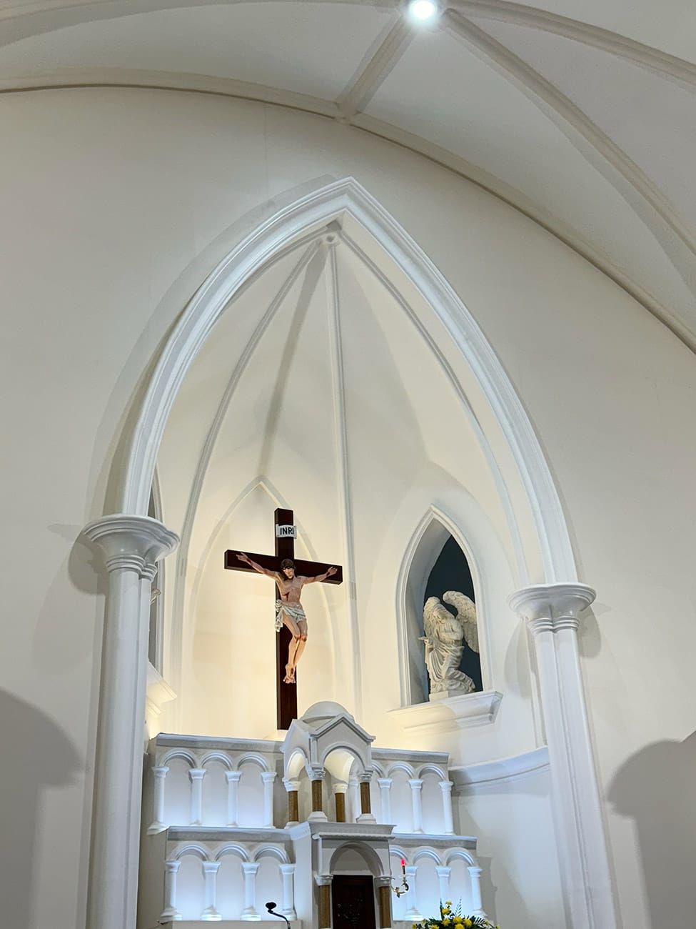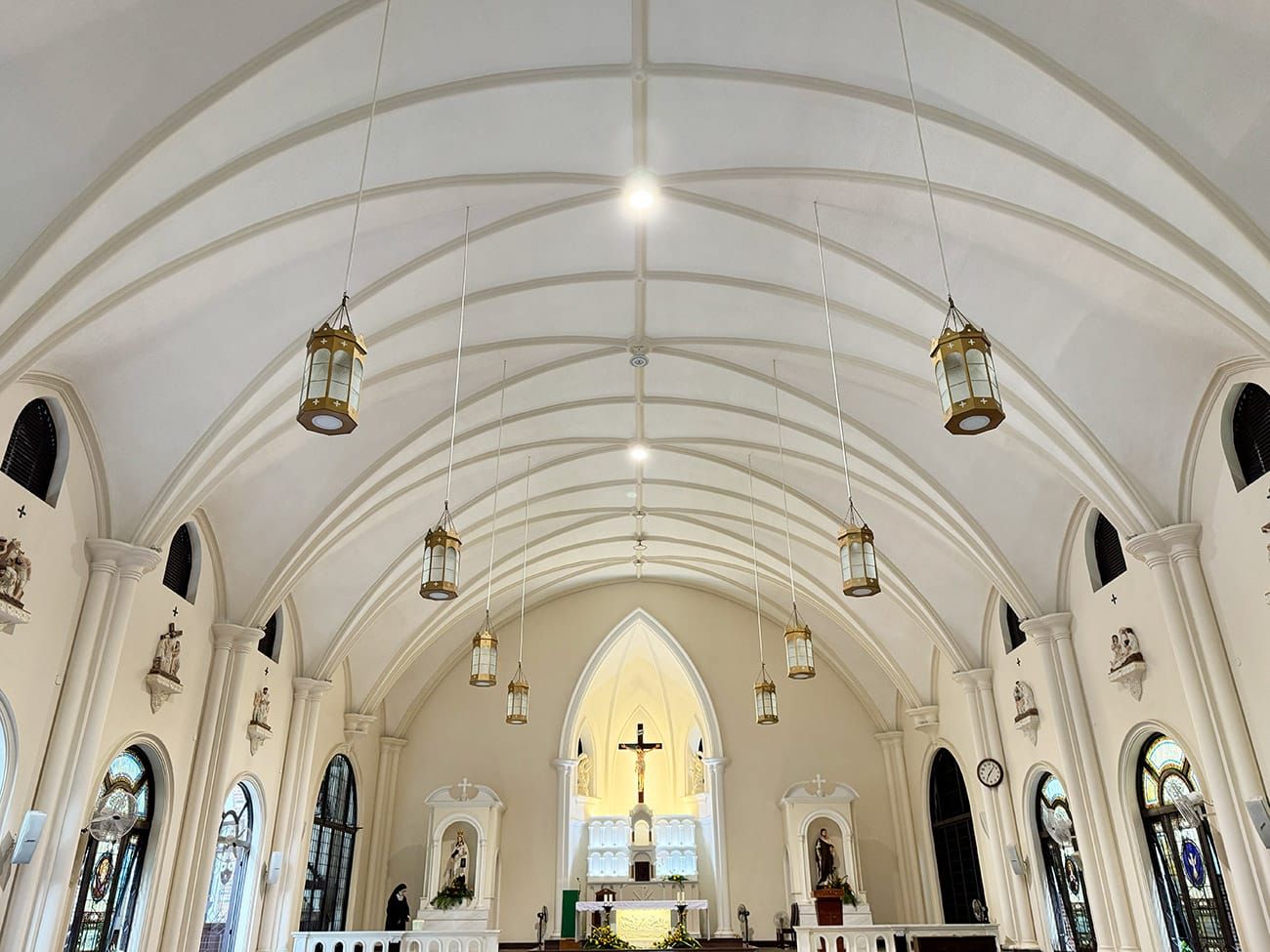 Bên trong là sự tráng lệ khác nơi các mái vòm trắng cao vút lên, đan nhau và những chi tiết mạ vàng tạo nên cảm giác sang trọng kín đáo.