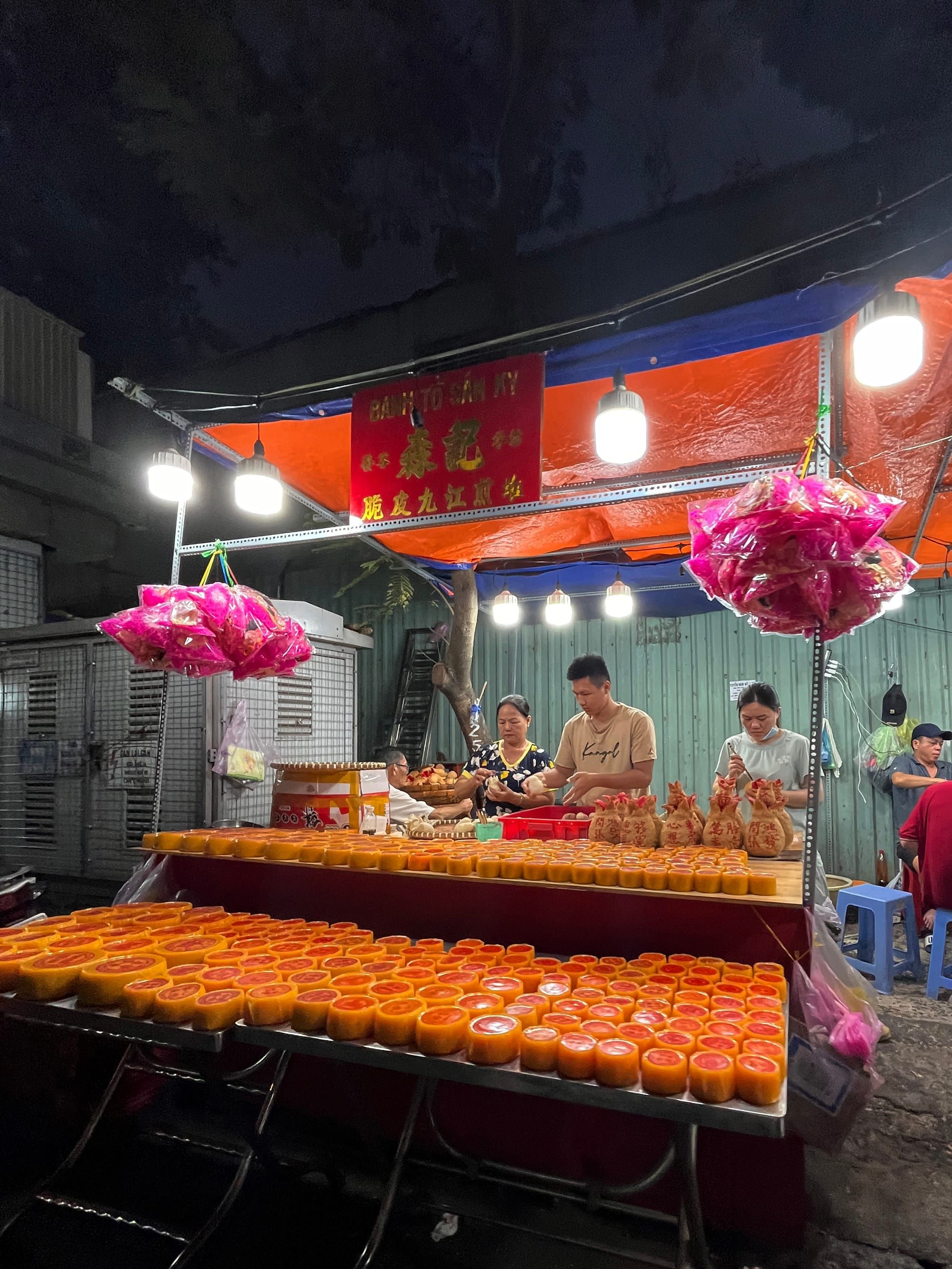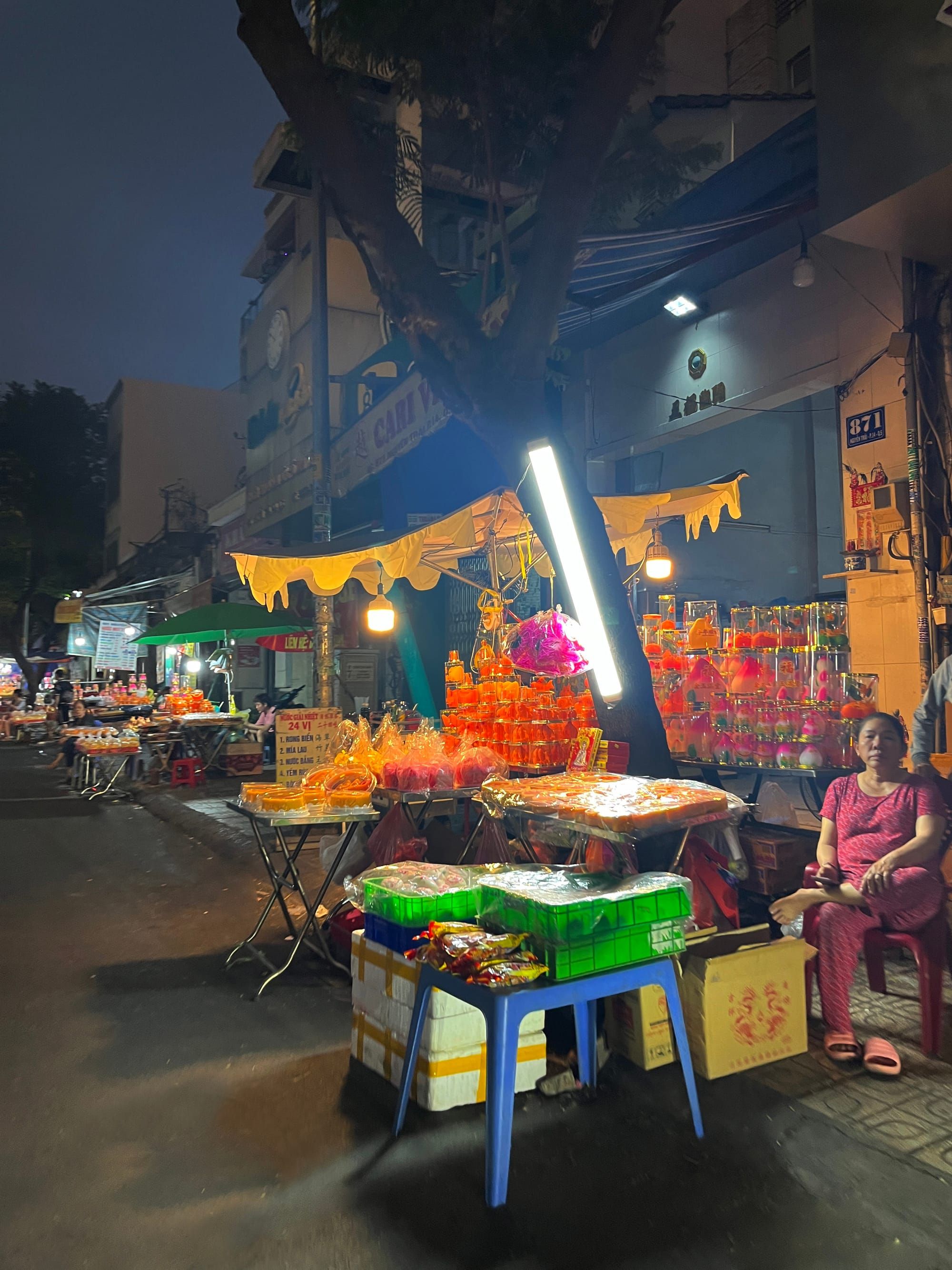 Lang thang Sài Gòn hết đường Trần Hưng Đạo và vòng về bằng Nguyễn Trãi, bạn có thể tận hưởng nhiều hương vị Tết khác nhau. Ở quận 5, mọi người bắt đầu bán những loại bánh lạ mắt cùng một màu đỏ rực ấm áp.
