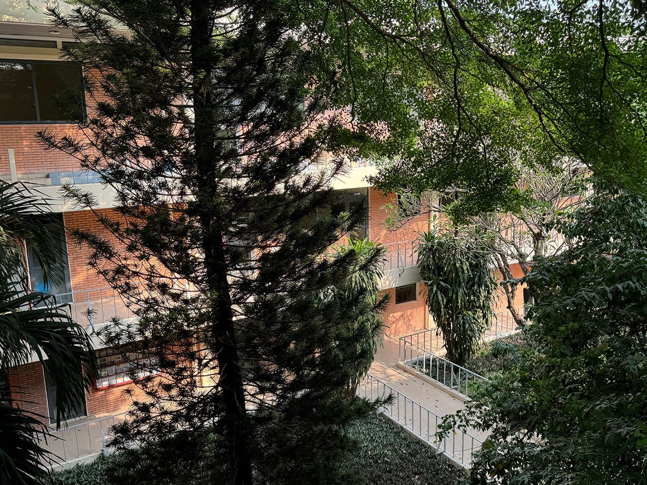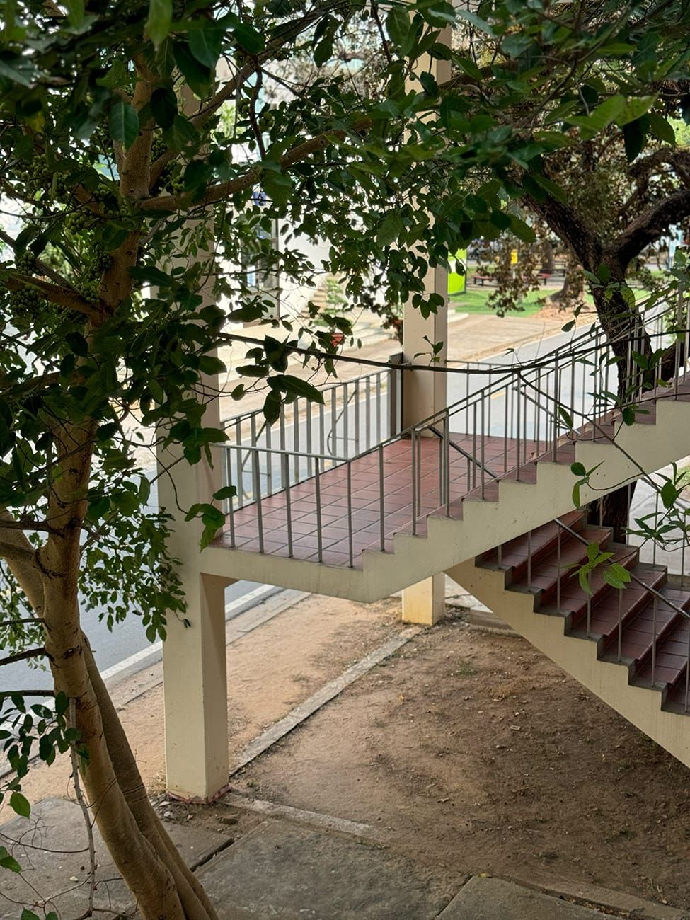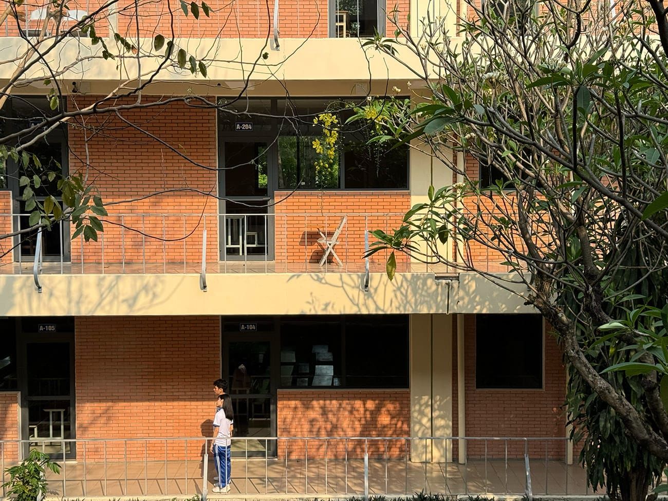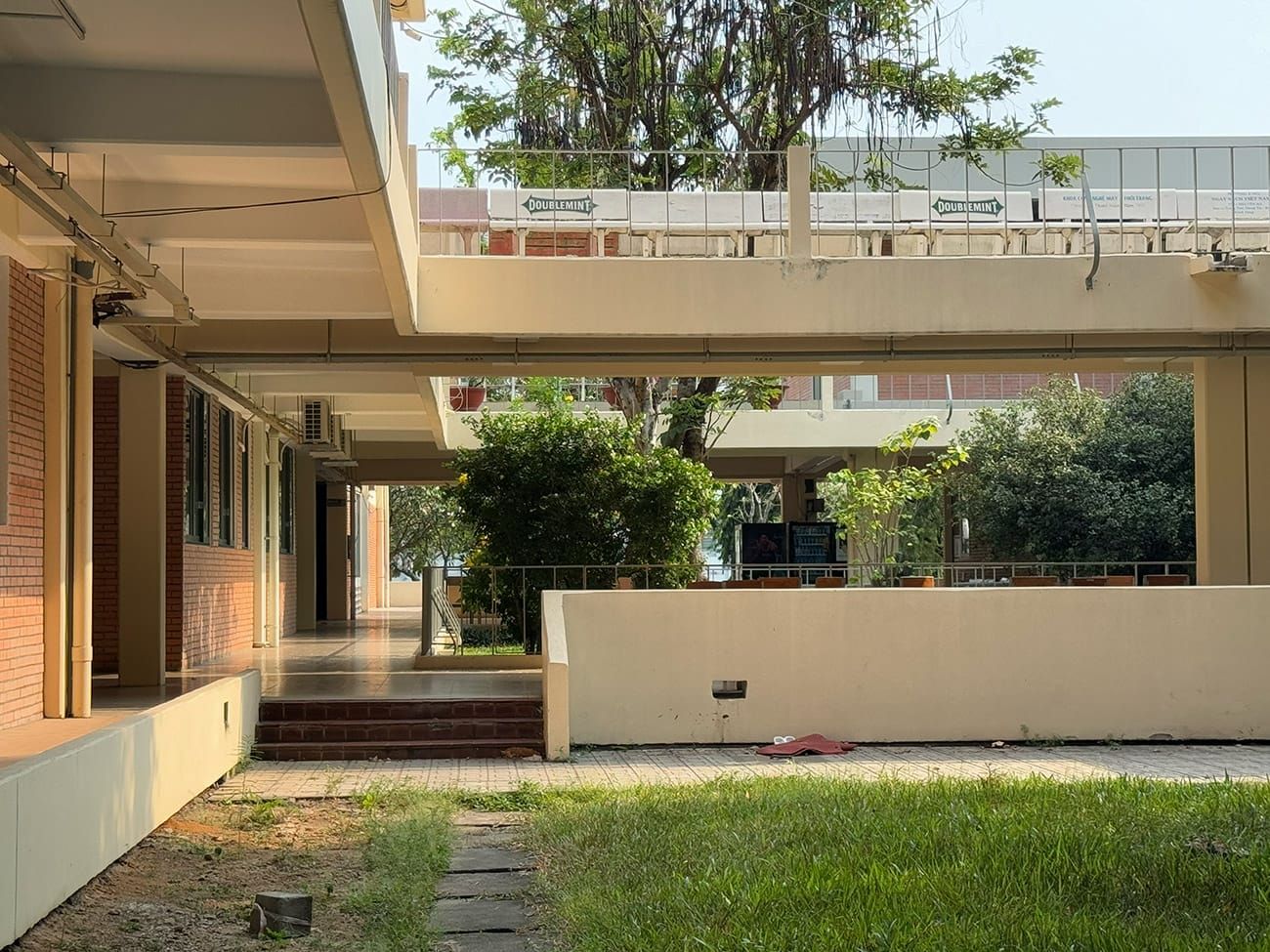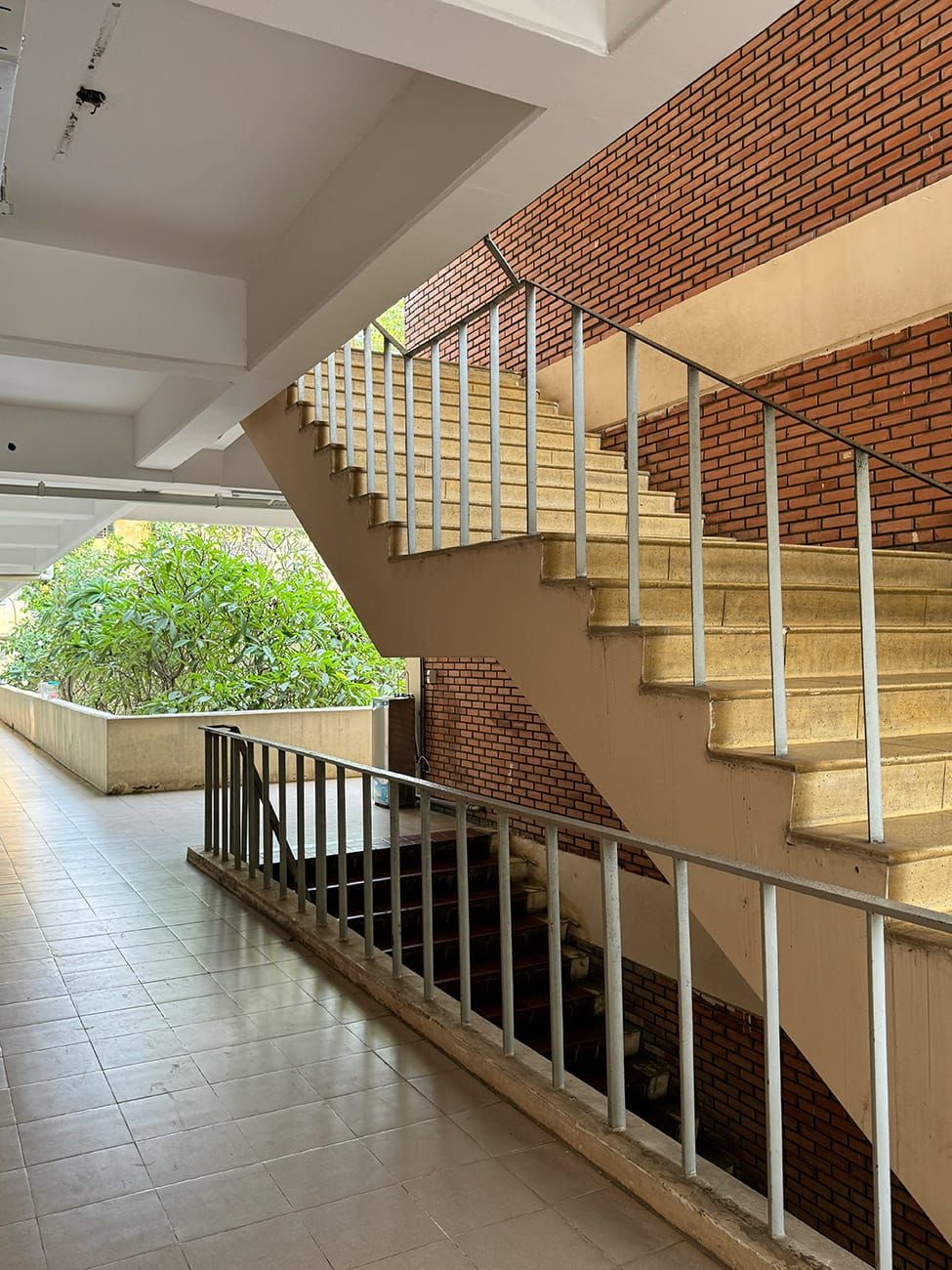 Các block giảng đường chỉ xây ba tầng, với hành lang và sân thượng sẵn sàng biến thành góc nghỉ ngơi, học tập thật yên tĩnh và riêng tư. Những cầu thang lên xuống đều crop một khoảng xanh thư thái đưa vào tầm mắt.