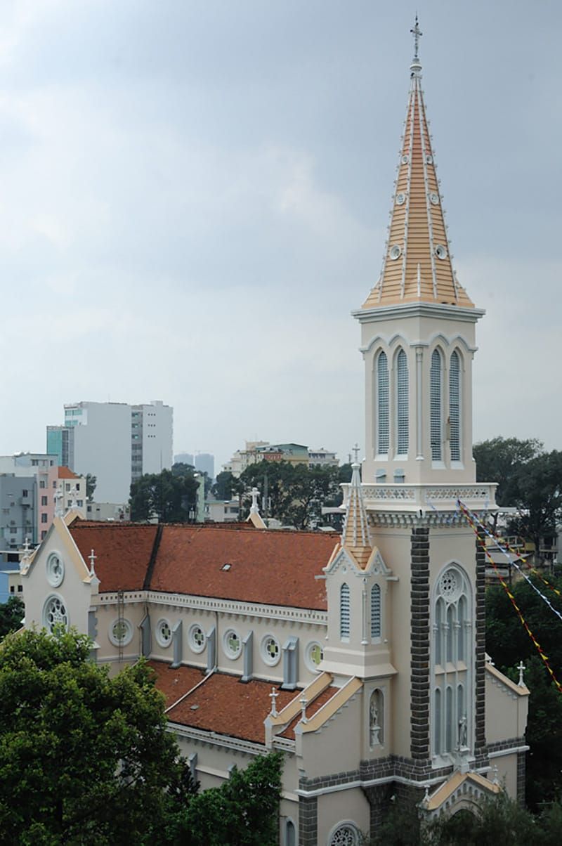Nhà thờ cha Tam được xây sau nhà thờ Thủ Đức chỉ vài năm. Cấu trúc bên trong, mái, hệ thống cột... giống y như phiên bản Thủ Đức. Tuy nhiên, ở đây bạn thấy sự phức tạp hơn của những chi tiết đan xen nửa Á nửa Âu gói gọn trong các quy luật Gothic. Đây là một bước tiến lớn của kiến trúc sư “nhà trồng được” Boutier sau nhà thờ Bà Rịa và Thủ Đức.