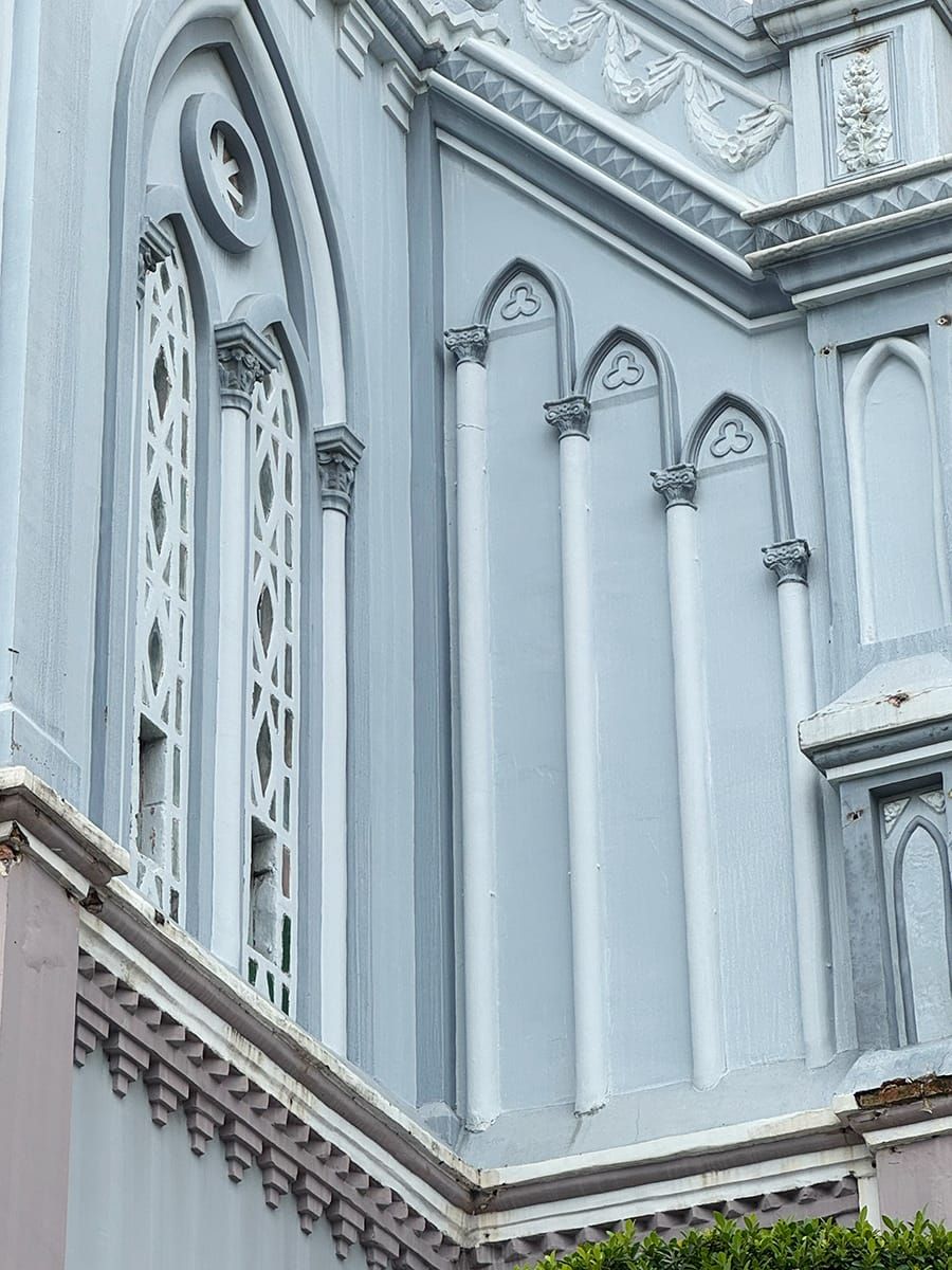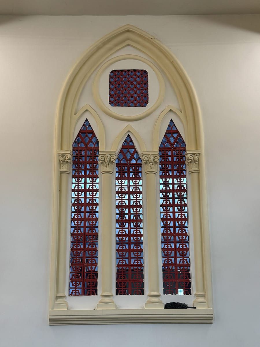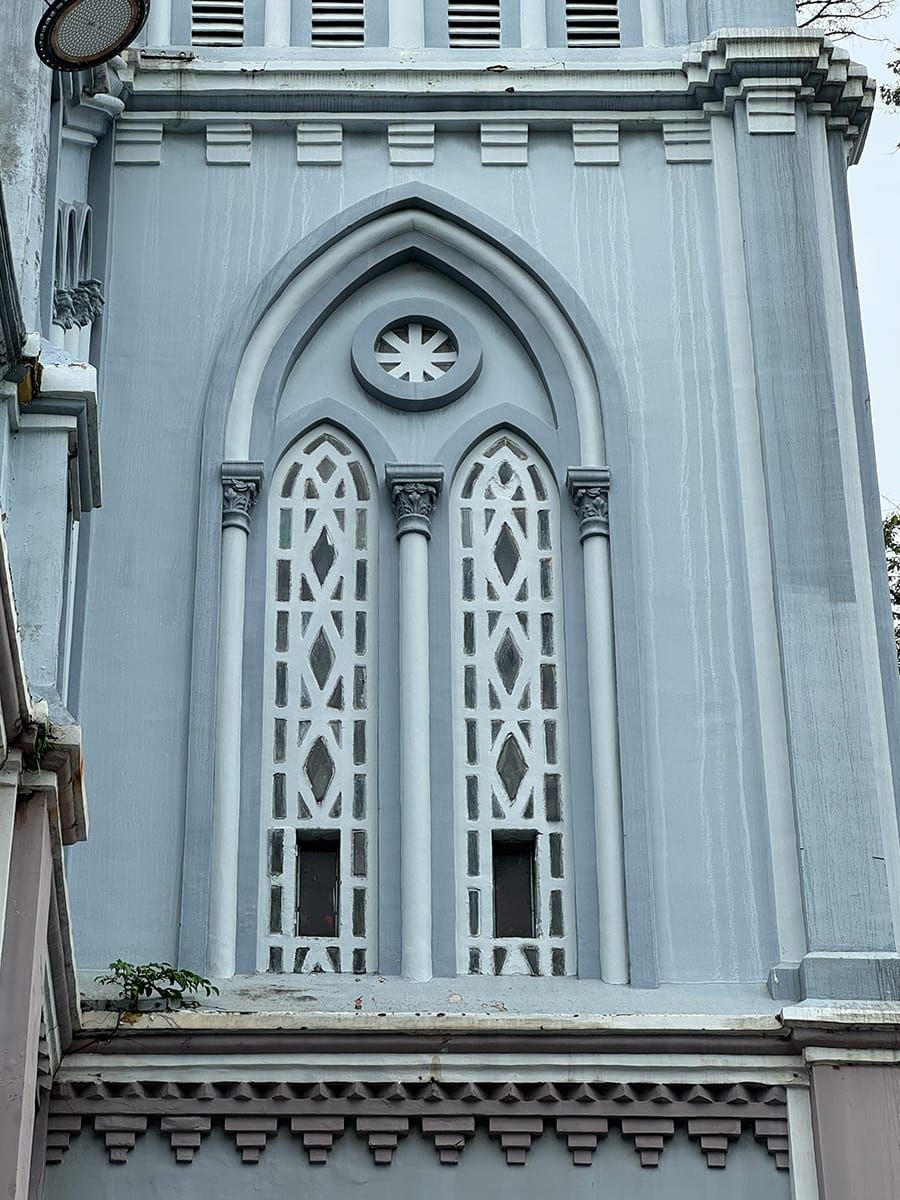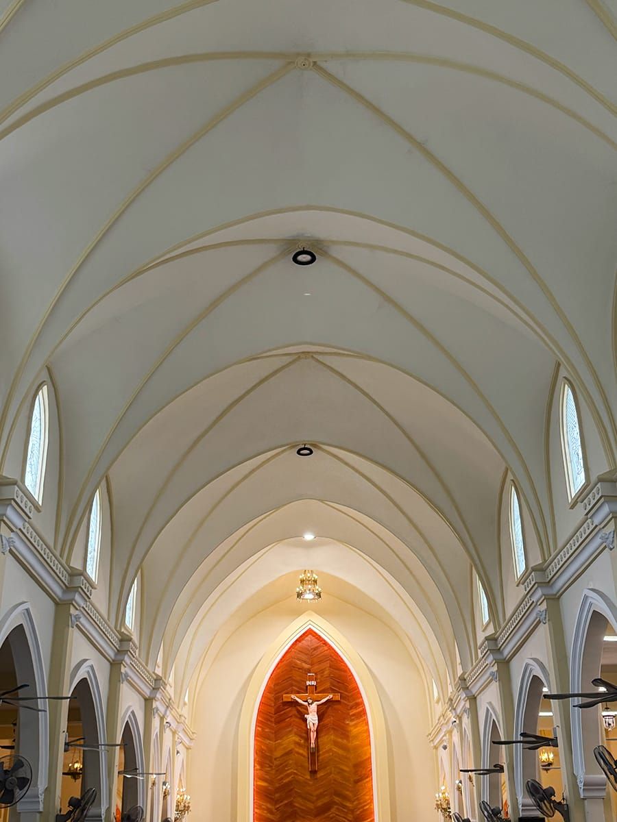 Nhà thờ nhỏ này được xây dựng trong những năm 1882-1887, khi Thủ Đức vẫn là một vùng đất xa xôi hoang vắng. Vì vậy, thật dễ hiểu khi công trình 138 tuổi này giản dị, bình thường đến vậy. Tuy nhiên, không thiếu những chi tiết đắt giá, như các khung cửa hình chữ "Thọ" đầy chất Á Đông này.
