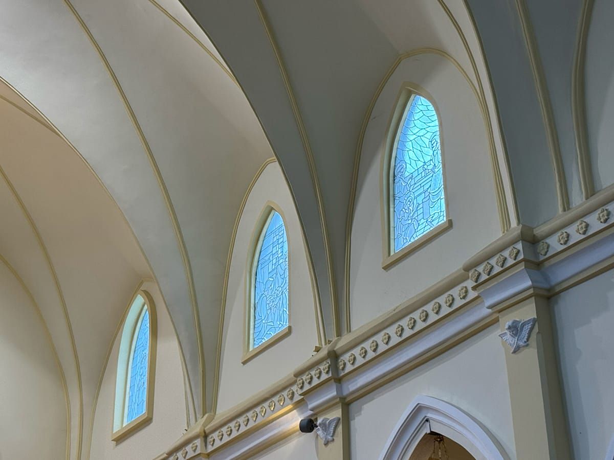 Phần lễ đường mộc mạc bên trong dường như không đủ kinh phí để dùng "rose window", nhưng các ô kính trắng và nhiều đường cong đan trên trần vẫn tìm kiếm được độ cao trong hoàn cảnh hạn hẹp.