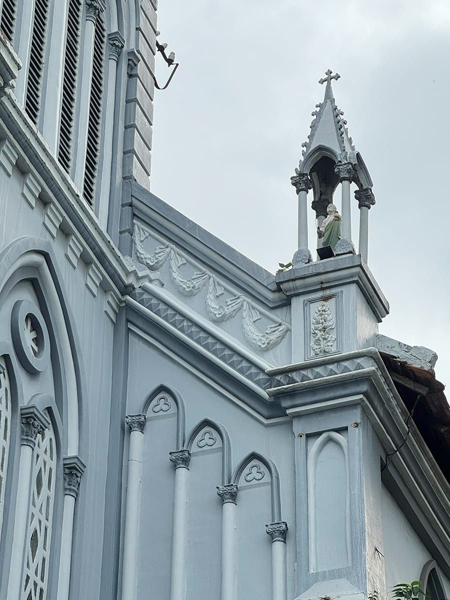 Khi người Pháp sang Việt Nam và bắt đầu công cuộc truyền giáo, họ không có nhiều tiền bạc, tài nguyên như chúng ta vẫn nghĩ. Đặc biệt, ở những vùng đất xa xôi, cách xa Sài Gòn, tình hình còn thiếu thốn hơn. Nhà thờ nhỏ này là một phần của giai đoạn gian nan đó. Người đàn ông thiết kế ra nó, ông ấy trên thực tế không phải kiến trúc sư.