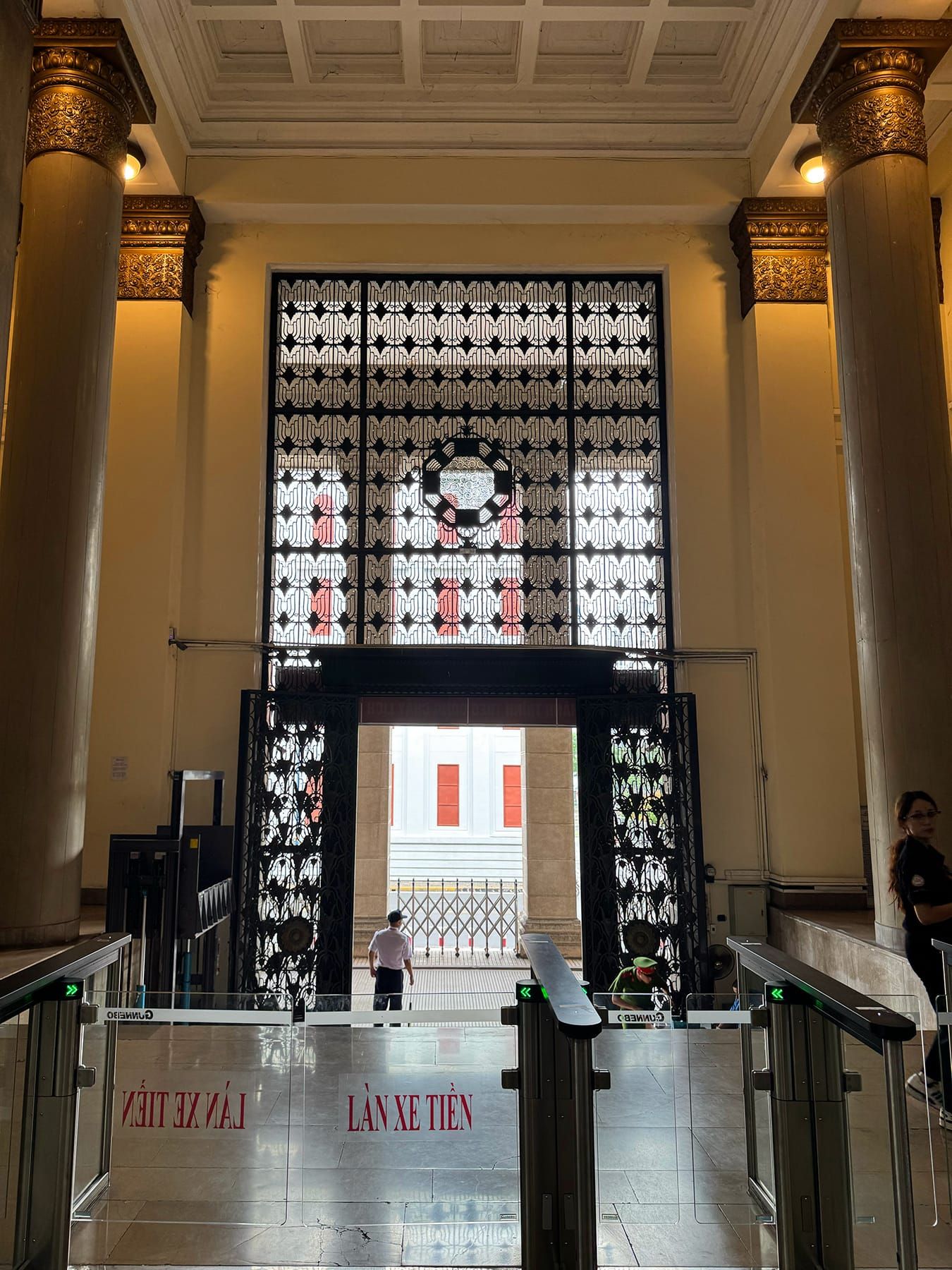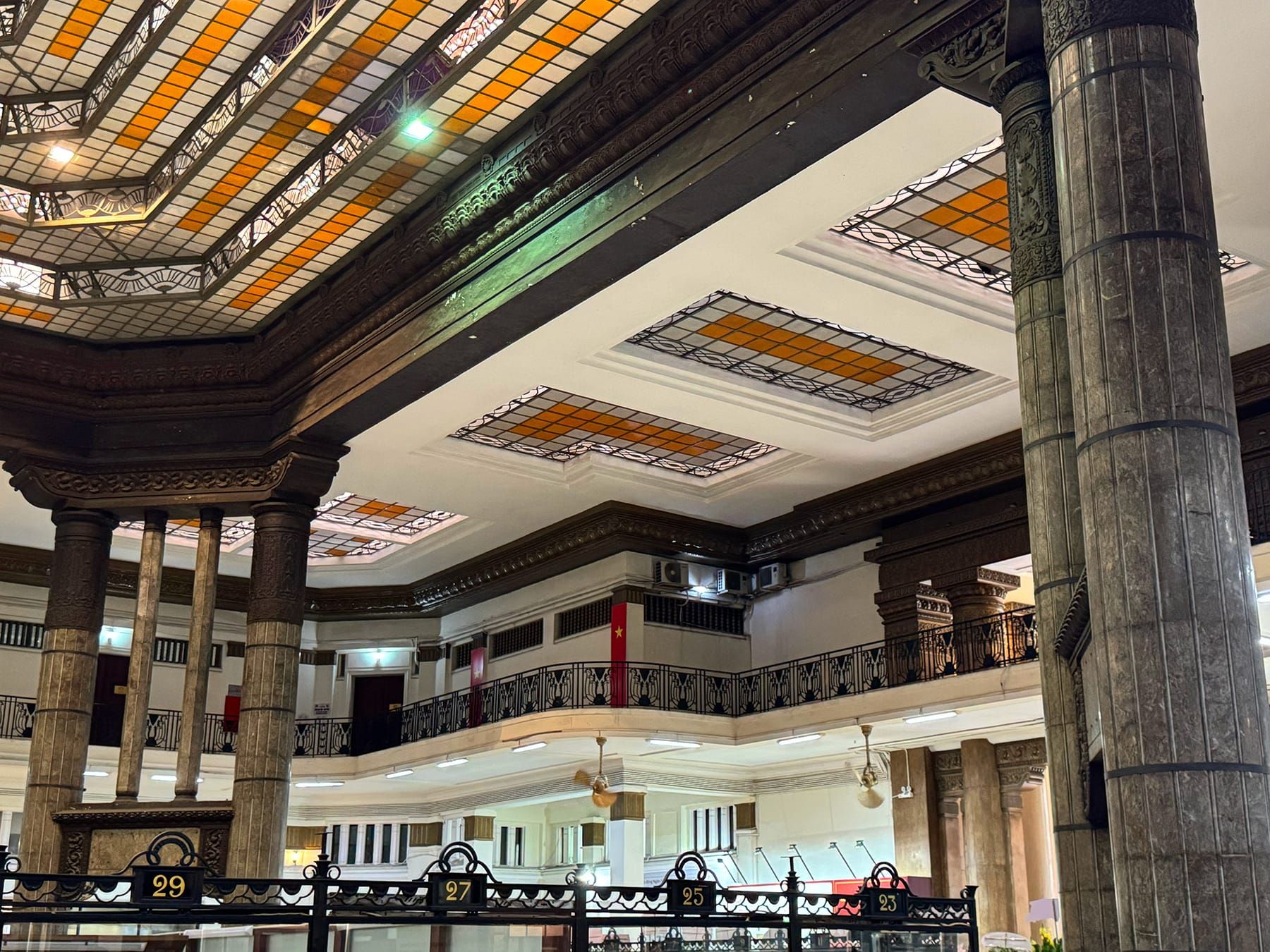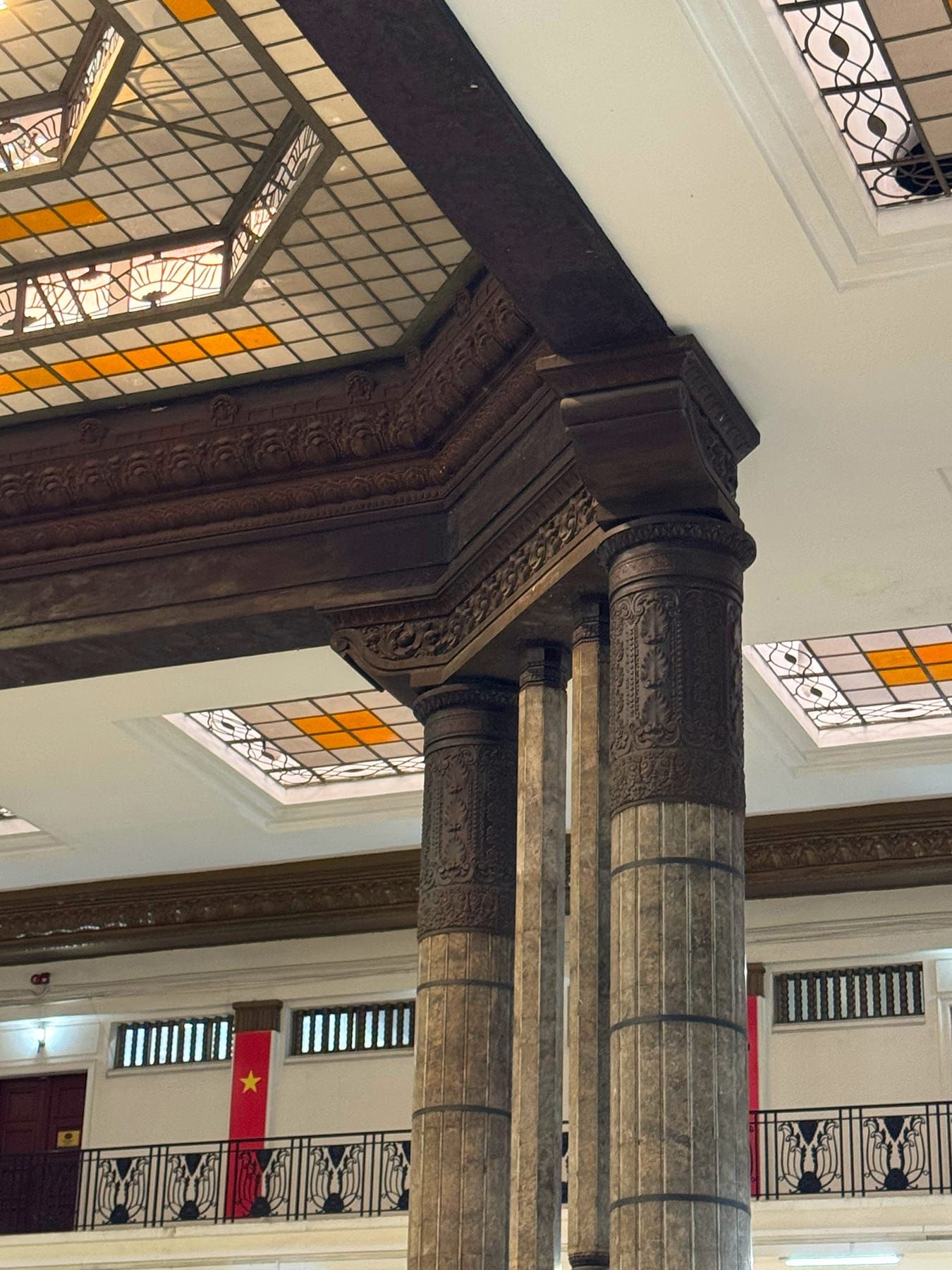 Khi bước vào bên trong, không gian rộng lớn này lập tức tạo ra sự choáng ngợp nhất định. Trần kính màu cao vút bên trên, bốn hàng cột khổng lồ chạm trổ tinh xảo ở các góc, tách riêng khu vực các quầy giao dịch ra chính giữa. Phía trên, dãy hành lang vây quanh khu vực nhạy cảm này. Vào những năm 1930, trên hành lang là đội an ninh luôn quan sát phía dưới, nhất cử nhất động ở phòng giao dịch đều bị theo dõi. Tuy nhiên, nhiều vụ trộm cắp, làm giả giấy tờ vẫn diễn ra bởi chính nhân viên ngân hàng, những người sau đó bị phát hiện có đam mê đặc biệt với các sòng bạc Chợ Lớn.