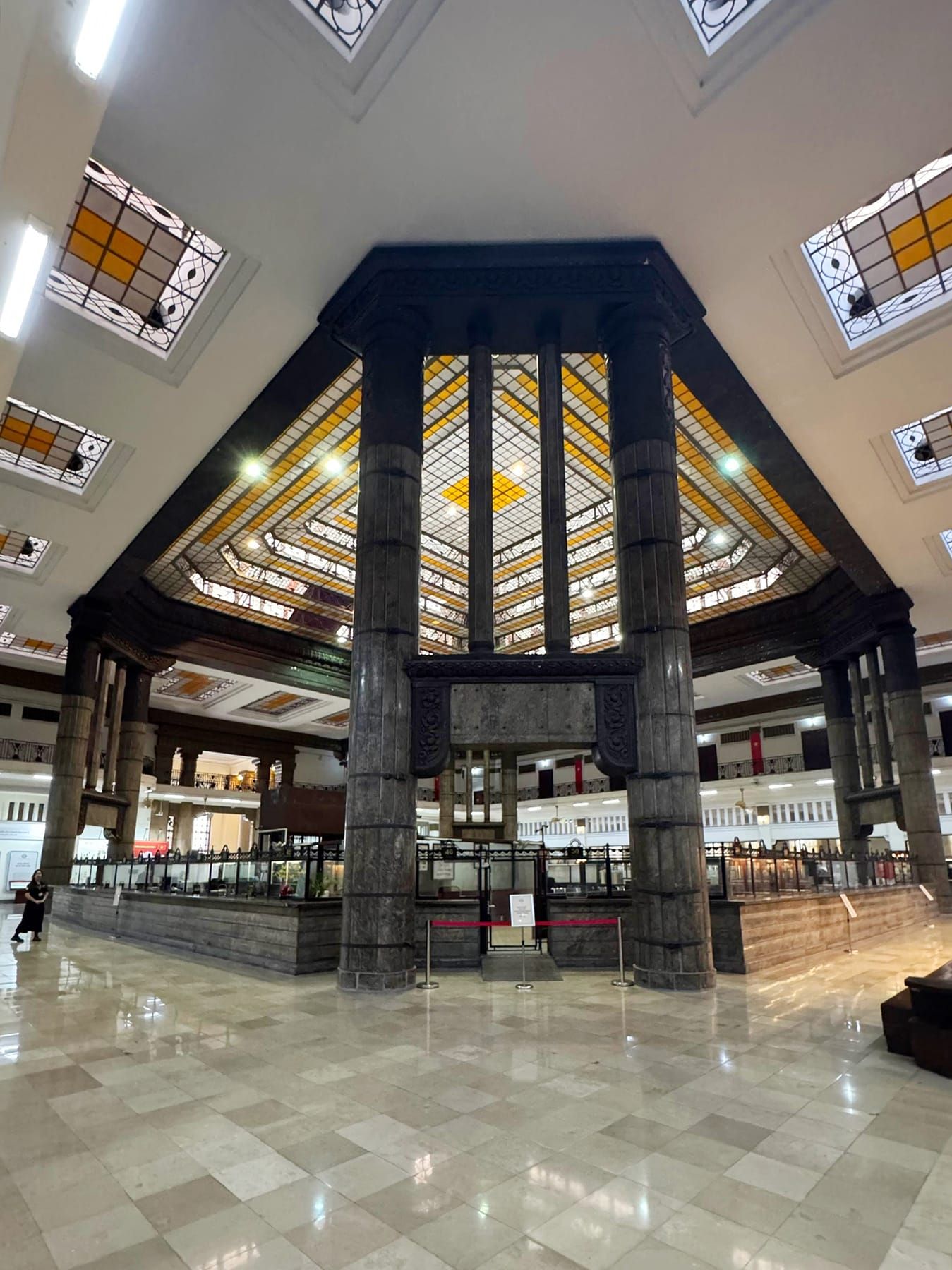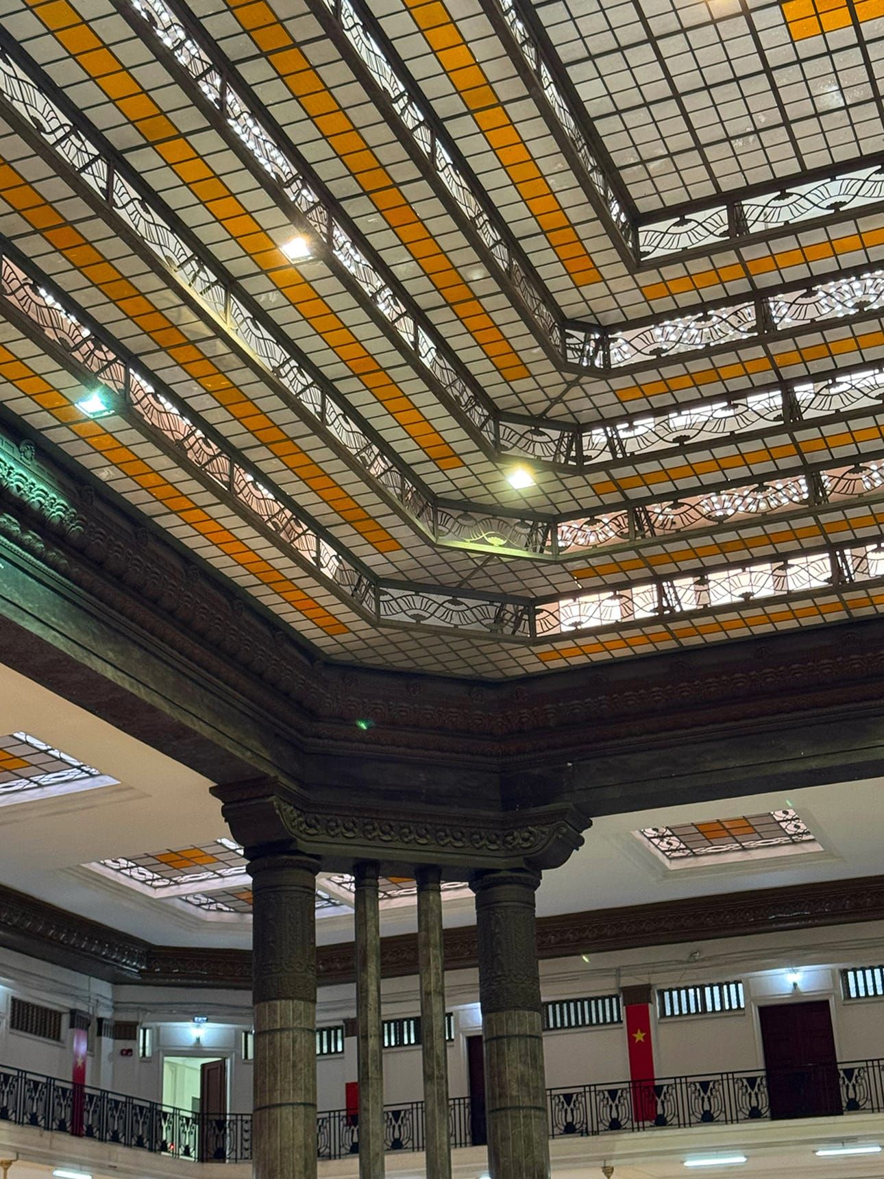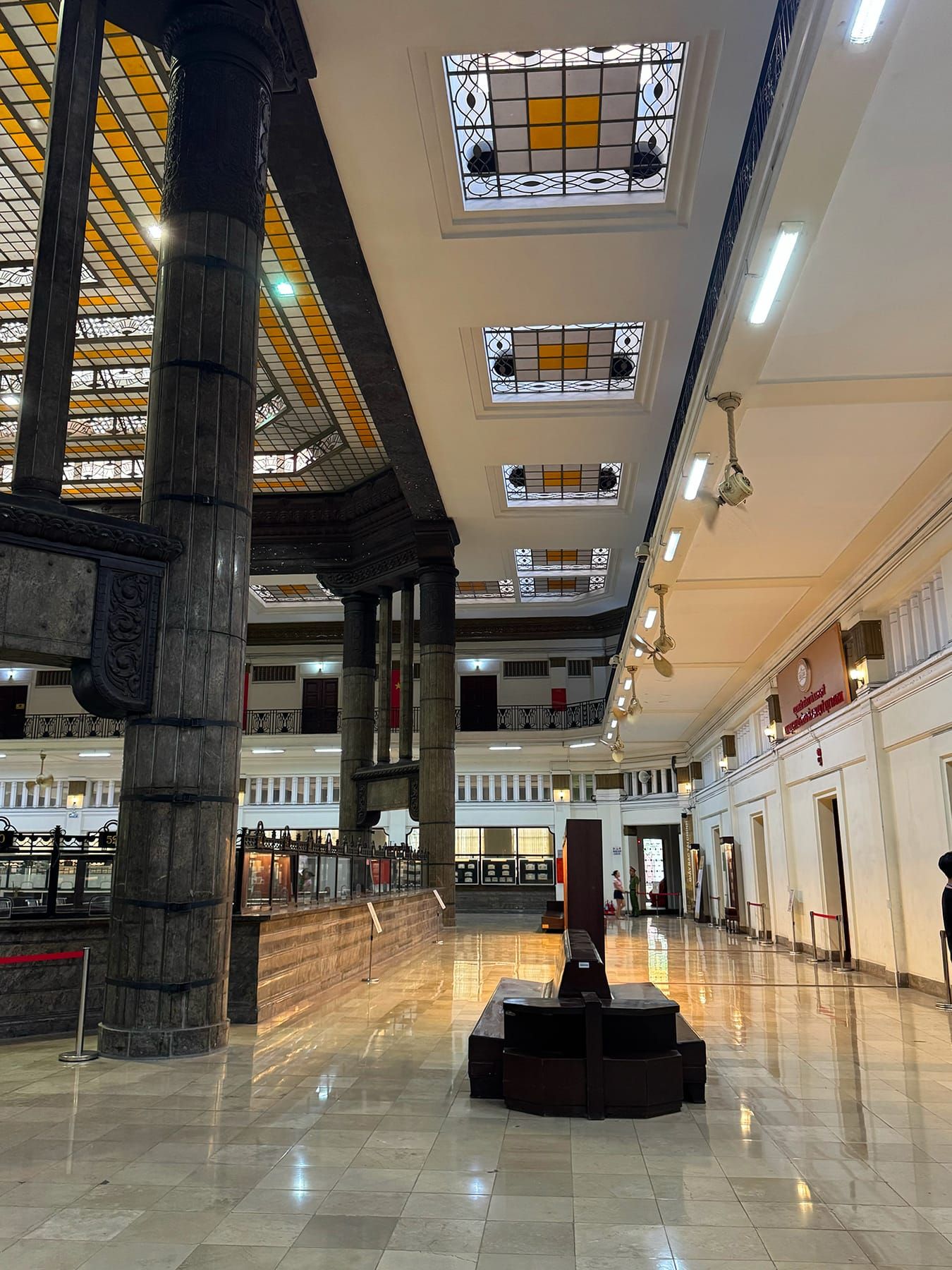 Khi bước vào bên trong, không gian rộng lớn này lập tức tạo ra sự choáng ngợp nhất định. Trần kính màu cao vút bên trên, bốn hàng cột khổng lồ chạm trổ tinh xảo ở các góc, tách riêng khu vực các quầy giao dịch ra chính giữa. Phía trên, dãy hành lang vây quanh khu vực nhạy cảm này. Vào những năm 1930, trên hành lang là đội an ninh luôn quan sát phía dưới, nhất cử nhất động ở phòng giao dịch đều bị theo dõi. Tuy nhiên, nhiều vụ trộm cắp, làm giả giấy tờ vẫn diễn ra bởi chính nhân viên ngân hàng, những người sau đó bị phát hiện có đam mê đặc biệt với các sòng bạc Chợ Lớn.
