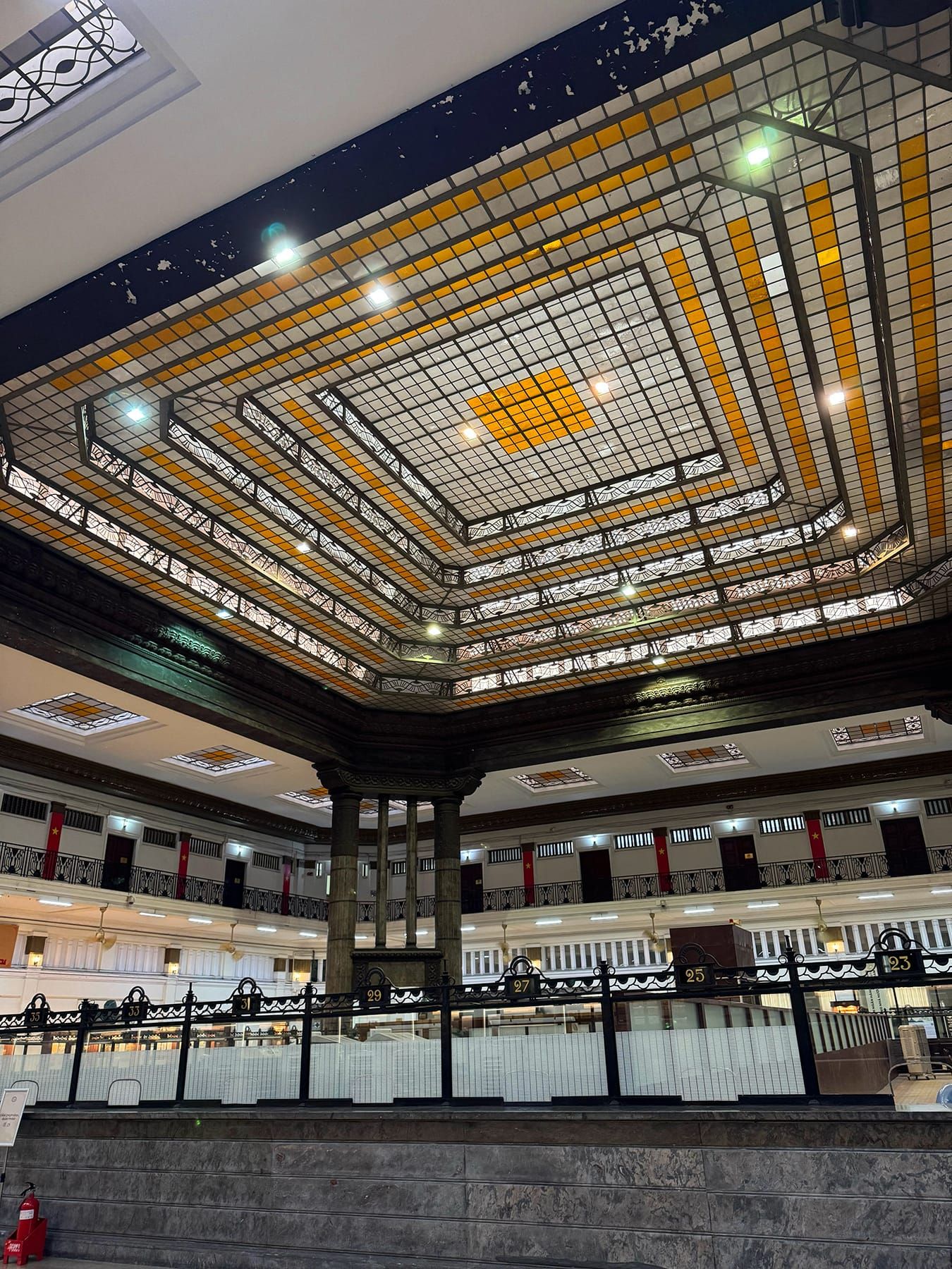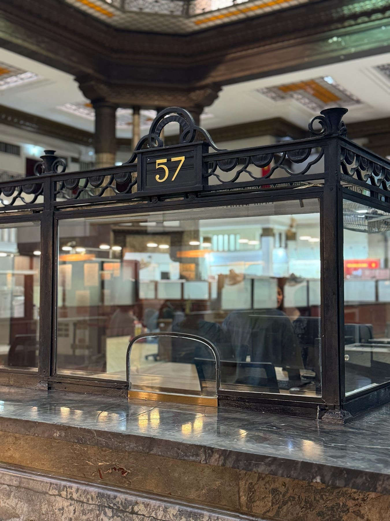 Bên dưới, ngoại trừ nét cổ kính của hoa văn, các quầy giao dịch gần giống như những gì chúng ta bắt gặp ở ngân hàng ngày nay. Bạn có thể tưởng tượng tên mình được xướng lên và đến ngồi "trình bày" với nhân viên qua ô cửa kính nhỏ.