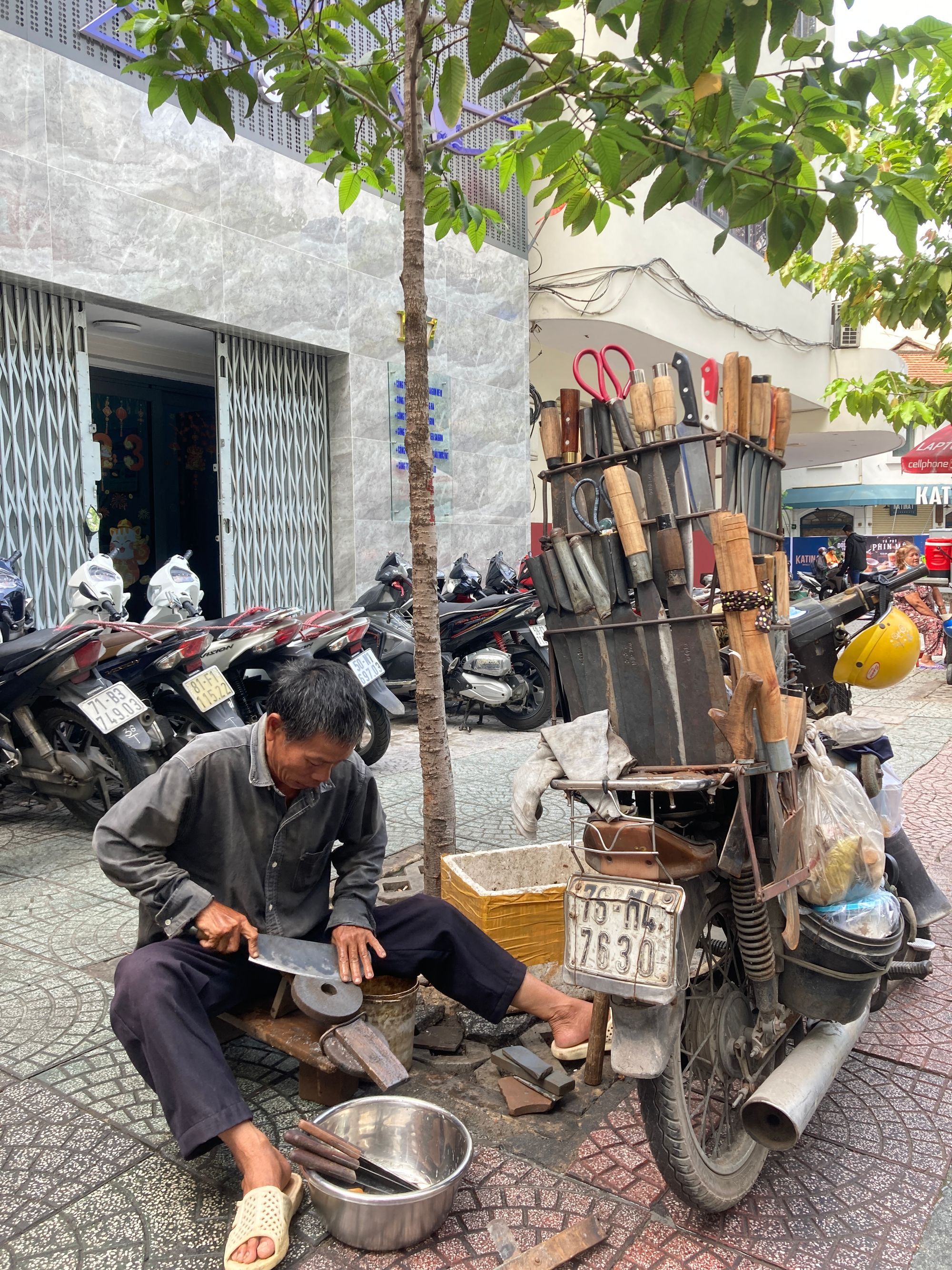 Hoặc chú mài dao dưới đây, mỗi cuối tuần chú sẽ chạy vào trung tâm Sài Gòn theo lịch đã được khách đặt trước, hầu như tuần nào cũng kín. Những ngày bình thường, chú ngao du cùng gian hàng của mình đi khắp nơi. Có cả những con dao tự rèn, handmade, homemade cực bén.