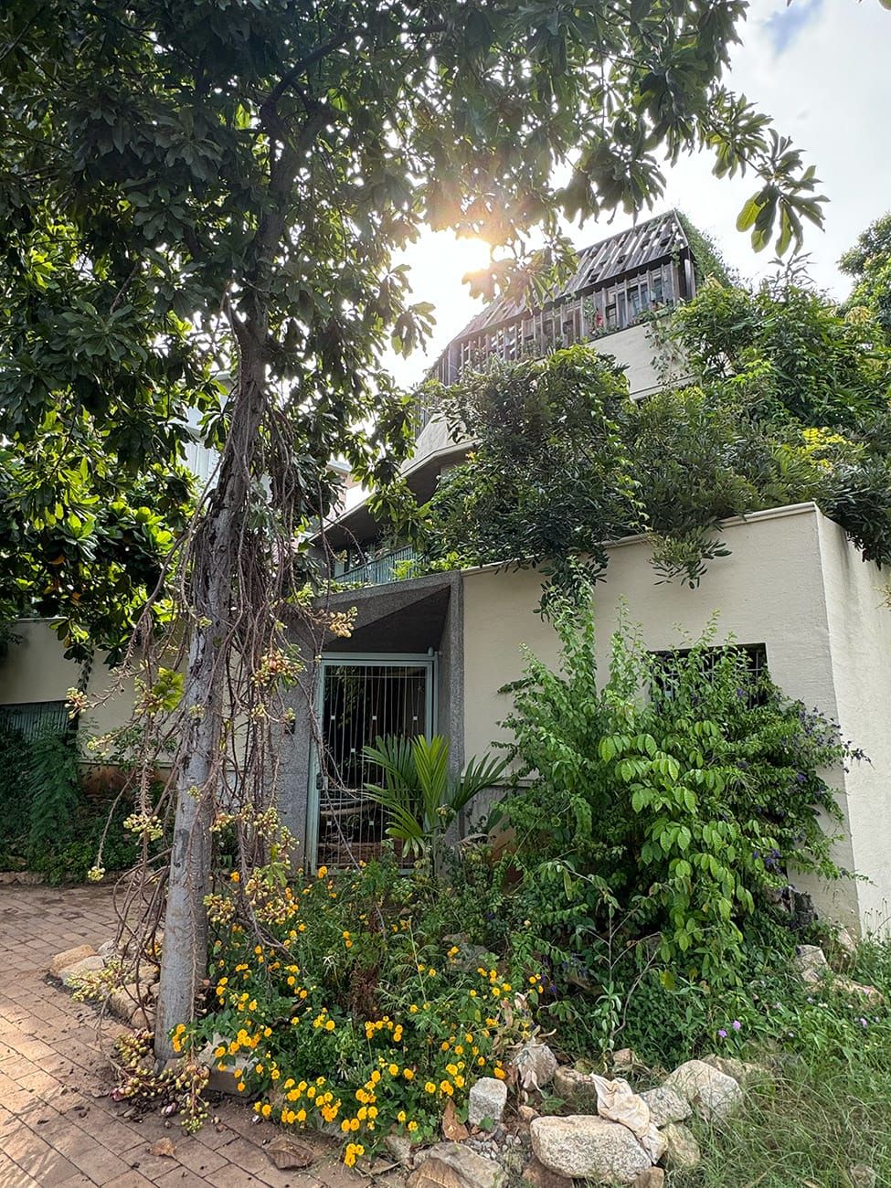 Vẫn phong cách Kiến trúc miền Nam hiện đại, nhưng các góc vát mạnh mẽ, thanh thoát hơn ở cửa ra vào, kết hợp với vòm gỗ phía trên và cây xanh xung quanh, ngôi nhà thật tươi mát, mềm mại.