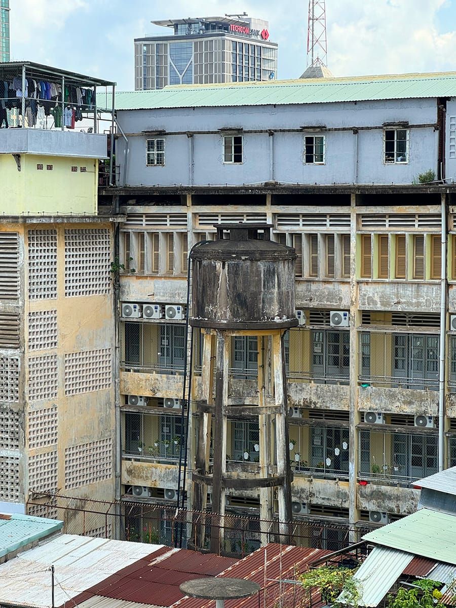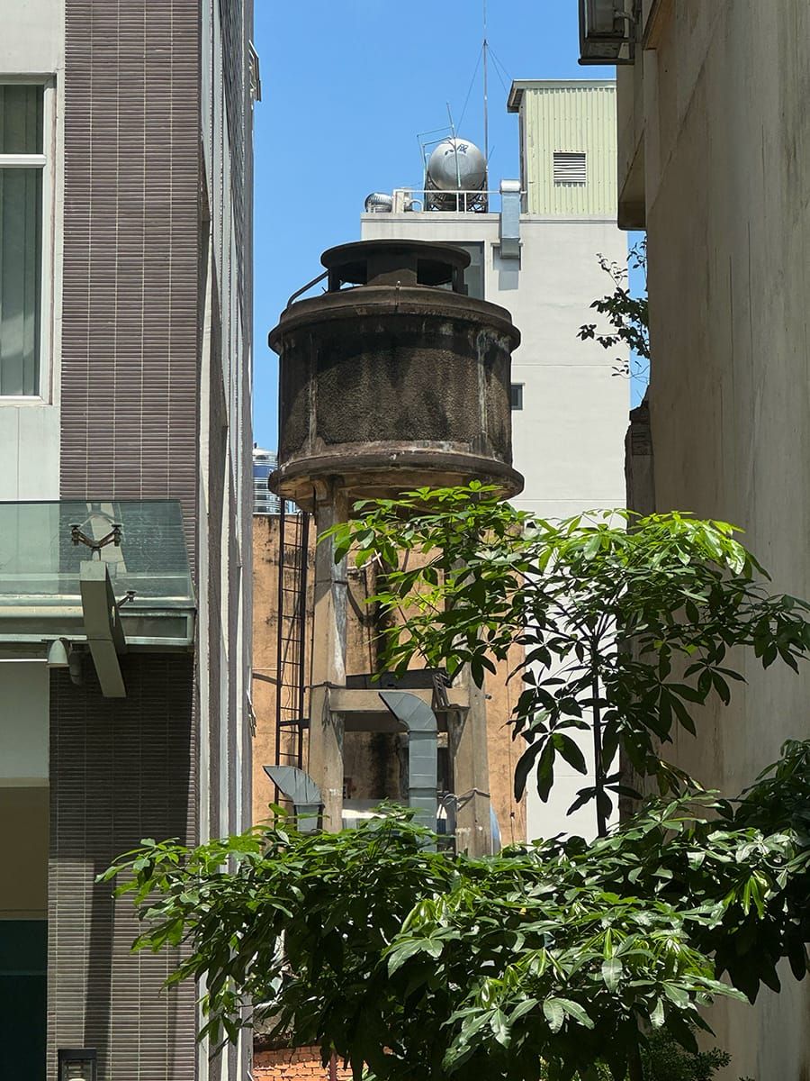 Một tháp nước nép mình giữa hai tòa nhà trên đường Thi Sách