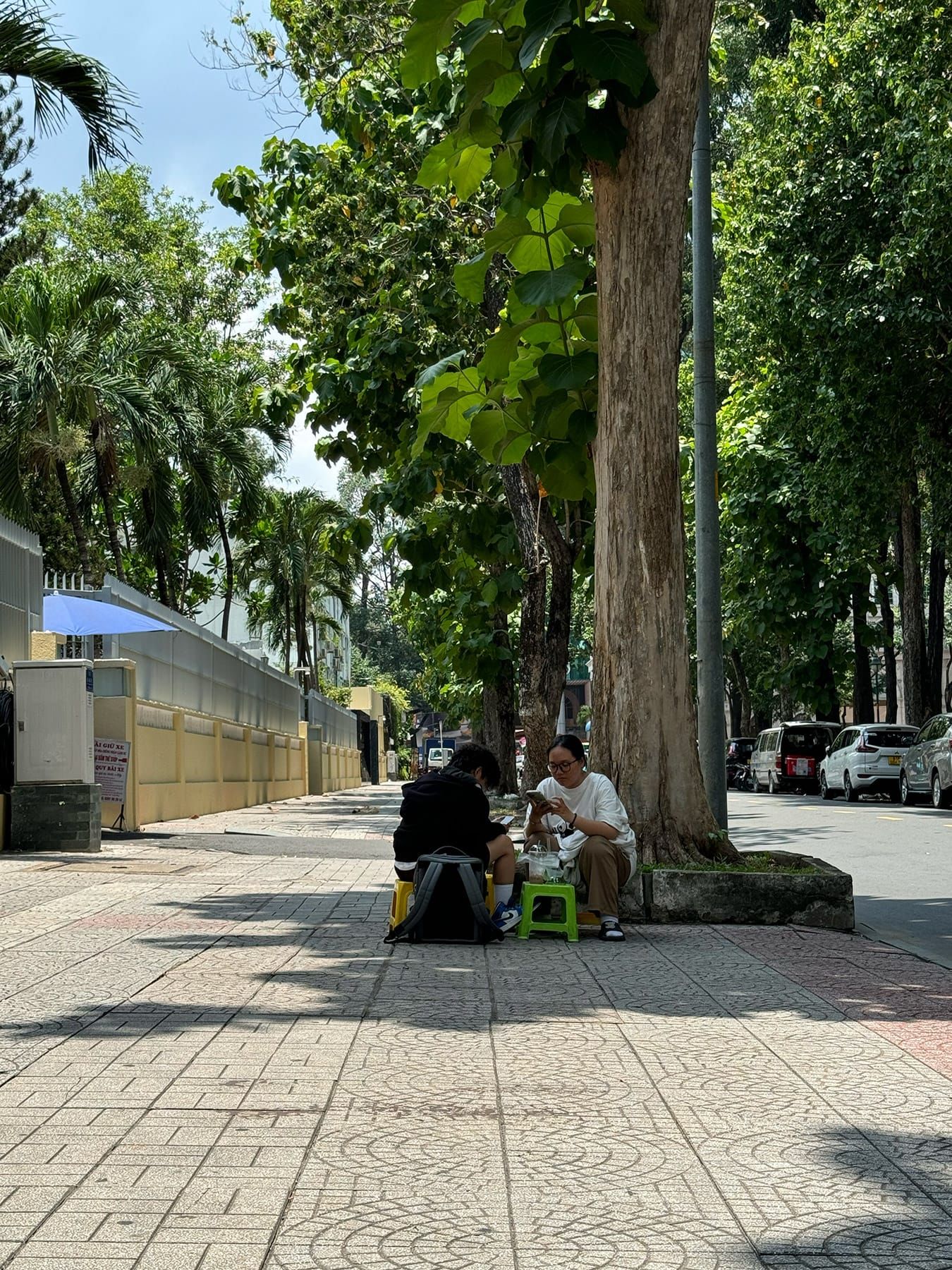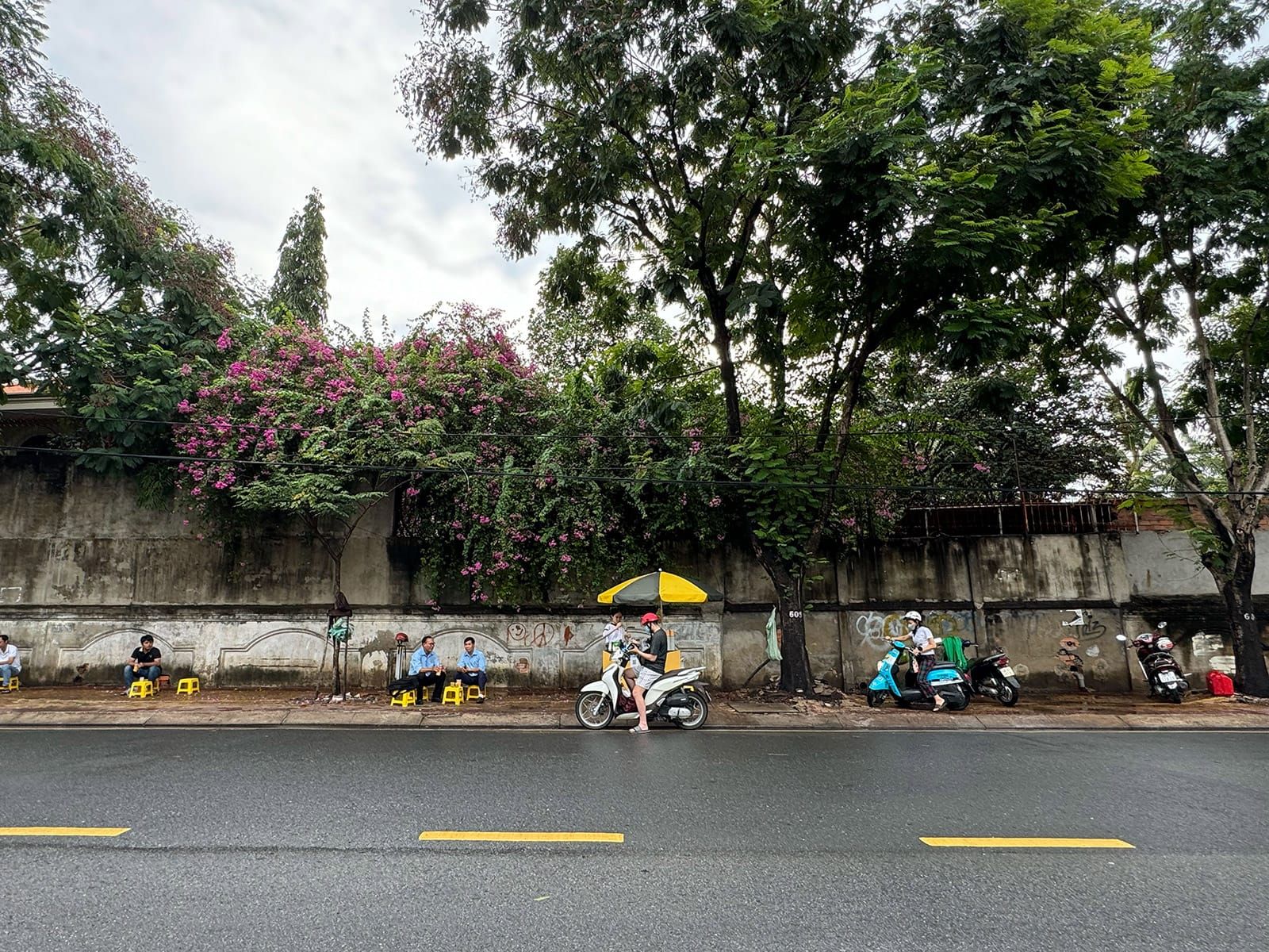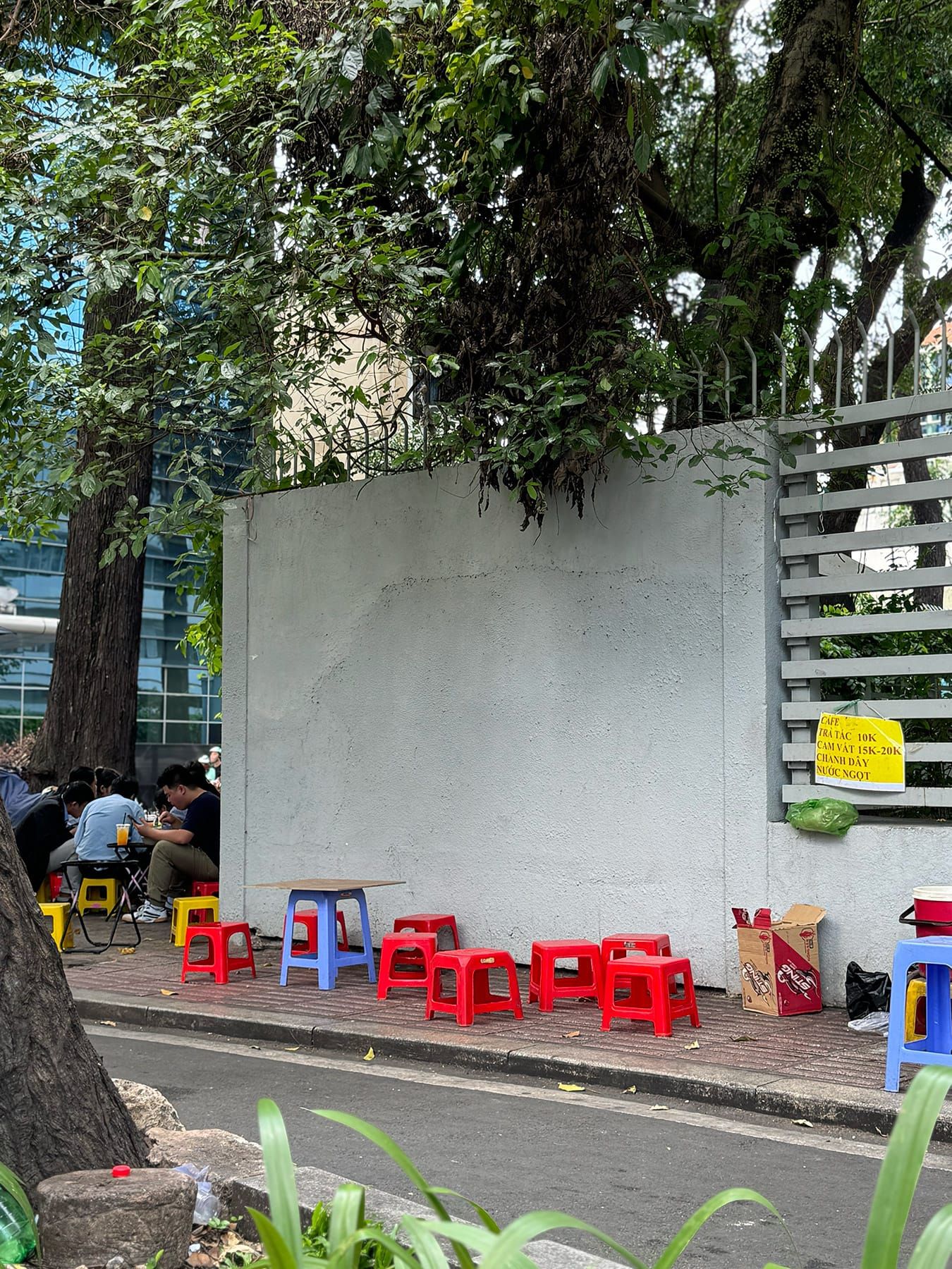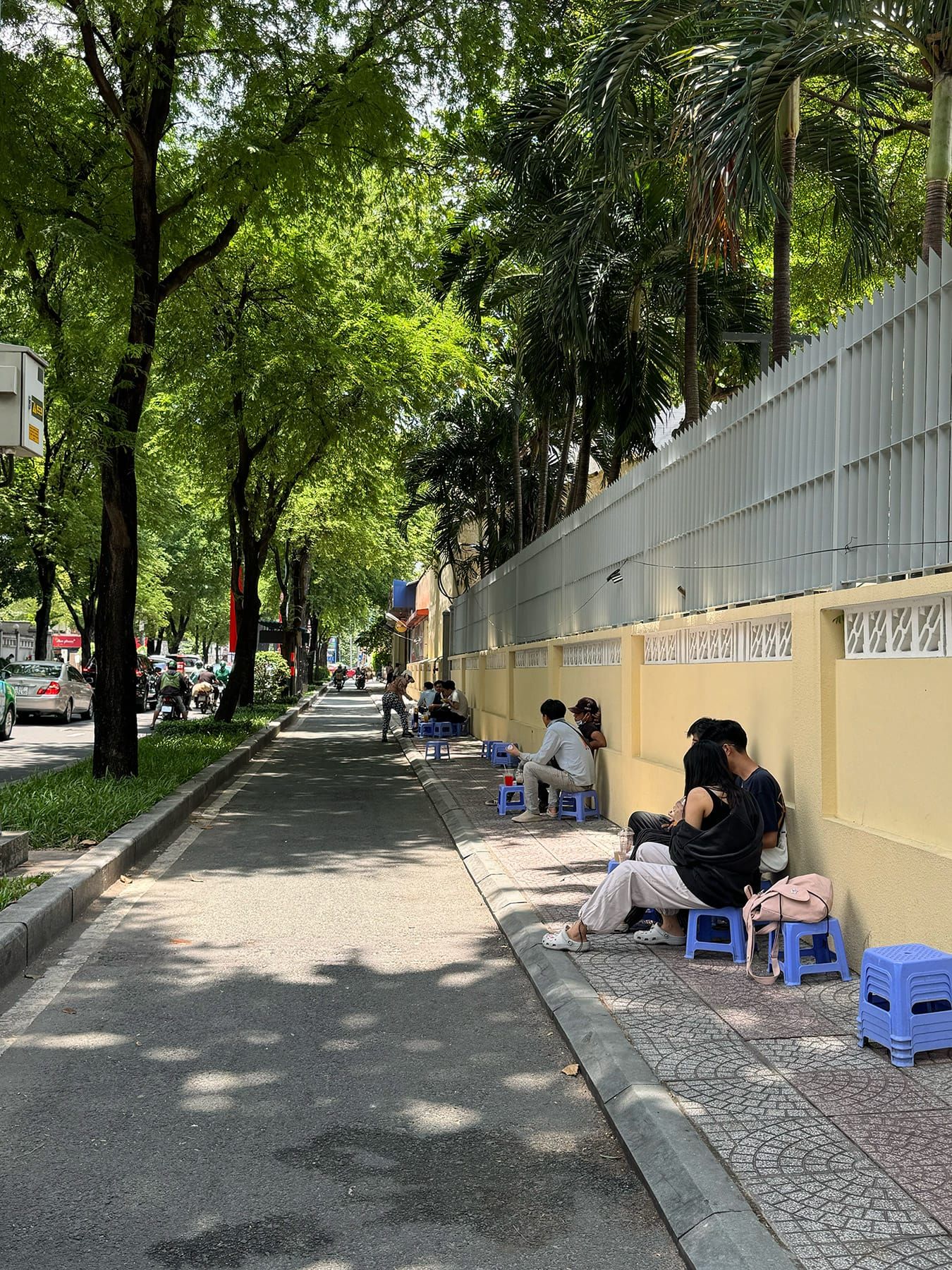 Bạn có thể chọn ngồi dưới bóng râm lớn, dựa vào bức tường sạch sẽ phía sau và nhìn ra con đường yên tĩnh.